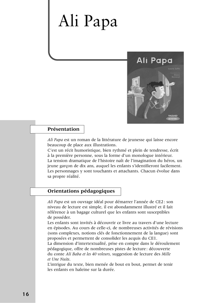Ali Papa Présentation Ali Papa est un roman de la littérature de jeunesse qui laisse encore beaucoup de place aux illustrations. C’est un récit humoristique, bien rythmé et plein de tendresse, écrit à la première personne, sous la forme d’un monologue intérieur. La tension dramatique de l’histoire naît de l’imagination du héros, un jeune garçon de dix ans, auquel les enfants s’identifieront facilement. Les personnages y sont touchants et attachants. Chacun évolue dans sa propre réalité. Orientations pédagogiques Ali Papa est un ouvrage idéal pour démarrer l’année de CE2 : son niveau de lecture est simple, il est abondamment illustré et il fait référence à un bagage culturel que les enfants sont susceptibles de posséder. Les enfants sont invités à découvrir ce livre au travers d’une lecture en épisodes. Au cours de celle-ci, de nombreuses activités de révisions (sons complexes, notions clés de fonctionnement de la langue) sont proposées et permettent de consolider les acquis du CE1. La dimension d’intertextualité, prise en compte dans le déroulement pédagogique, offre de nombreuses pistes de lecture : découverte du conte Ali Baba et les 40 voleurs, suggestion de lecture des Mille et Une Nuits. L’intrigue du texte, bien menée de bout en bout, permet de tenir les enfants en haleine sur la durée. 16 Organisation de la lecture du roman 1 ➜ Séquence 1 : Découverte de l’univers d’Ali Papa, chapitre 1 ■ Étape 1. Découverte du livre et du premier chapitre. Révision du son [ʃ] et de ses différentes graphies. ■ Étape 2. Travail sur les personnages et l’univers d’Ali Papa (chapitre 1). Révision des différentes graphies du son [j]. ■ Étape 3. Invention de formules magiques à partir d’un travail de repérage sur le texte. Résumé collectif d’une partie de l’histoire. ➜ Séquence 2 : Chapitres 2, 3 et 4 ■ Étape 1. Découverte du chapitre 2. Révision des différents types de phrases. ■ Étape 2. Découverte des chapitres 3 et 4. Travail sur le champ lexical du bruit (et de la voix). ➜ Séquence 3 : Chapitres 5, 6, 7 et 8 ■ Étape 1. Découverte des chapitres 5, 6, 7 et 8 (travail sur les dimensions explicite et implicite du texte). Révision de la notion de singulier/pluriel, des différentes marques du pluriel. ■ Étape 2. Production d’un récit de rêve (cauchemar). Intertextualité : le conte Ali Baba et les 40 voleurs. ➜ Séquence 4 : chapitre 9, intégralité du roman ■ Étape 1. Découverte du chapitre 9. Appropriation des outils du dialogue (la ponctuation). ■ Étape 2. Relecture du roman dans son intégralité. Travail sur le sens propre et le sens figuré. ■ Étape 3. Repérage des différents temps du récit. Travail sur les verbes à l’infinitif. 17 Ali Papa Séquence 1 Découverte de l’univers d’Ali Papa, chapitre 1 Cette première séquence propose une entrée dans l’univers d’Ali Papa au travers de l’objet livre et de la lecture du premier chapitre. Le texte, dont le narrateur est un enfant, se prête particulièrement bien à toutes les révisions et acquisitions de début de cycle III. Cette séquence s’organise en trois étapes. Au cours de la première étape, les enfants sont invités à découvrir l’objet livre et son titre. Ils découvrent ensuite le premier chapitre, puis, à partir du texte, révisent le son [ʃ] et travaillent sur les mots d’origine étrangère. La deuxième étape s’intéresse plus particulièrement au narrateur de l’histoire et à l’univers du livre. Elle permet de revoir la distinction entre noms communs et noms propres et propose un travail de révision du son [j]. La troisième étape est une invitation à une activité de production d’écrits : il s’agit de jouer avec les mots à partir d’une structure donnée par le texte, pour produire un texte poétique (travail sur les synonymes et les rimes). Couverture, chapitre 1 Étape 1 : Découverte du livre et du premier chapitre Dominante lecture Objectifs Faire découvrir un livre au moyen de sa couverture (première et quatrième de couverture) ■ Faire différencier les différents types d’informations présentes (titre, nom de l’auteur, nom de l’éditeur, etc.) ■ ■ Stimuler et favoriser l’entrée dans un ouvrage de fiction ■ Faire repérer les mots d’origine étrangère dans un texte ■ Faire réviser le son [ʃ] et ses différentes graphies Matériel Matériel À disposition – Fiche 1 p. 23 : Les mots difficiles dans le chapitre 1 – Fiche 2 p. 24 : Compréhension du chapitre 1 – Fiche 3 p. 25 : Les mots d’origine étrangère/le son [ʃ] 1. Découverte de l’objet livre Distribuer le livre aux enfants. De quoi s’agit-il ? D’un petit roman. Faire lire le texte (première et quatrième de couverture). Isoler le titre, le nom de l’auteur, le nom de l’éditeur. Repérer les autres écrits (à quoi correspondent-ils ?). Puis observer l’illustration. Que voit-on ? Un garçon qui regarde par le trou de la serrure. Faire énoncer différentes hypothèses sur le contenu du livre à partir de tous ces éléments. 2. Découverte du premier chapitre Les enfants lisent le premier chapitre en silence. Ils repèrent les passages qu’ils ne comprennent pas ou les mots difficiles et les notent au brouillon. Expliquer : les moutons poussiéreux et le mot bouquiniste. H Fiche 1 p. 23 : Les mots difficiles dans le chapitre 1 H Fiche 2 p. 24 : Compréhension du chapitre 1 Observation réfléchie de la langue ➞ Recherche dans le dictionnaire ■ Prononcer les mots suivants : Schéhérazade et shah, demander aux enfants de les repérer dans le texte et d’en donner l’orthographe précise. ■ Proposer ensuite aux enfants de rechercher dans un dictionnaire les mots : shampooing, shérif, shogoun, shooter, short. Parler de mots d’origine étrangère. En chercher d’autres collectivement. 18 Ali Papa, chapitre 1 Observation réfléchie de la langu