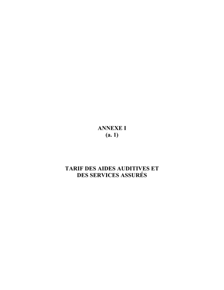 ANNEXE I (a. 1) TARIF DES AIDES AUDITIVES ET DES SERVICES ASSURÉS Document produit par la Régie de l’assurance maladie du Québec et publié sur son site Internet Dépôt légal – Bibliothèque et Archives Canada, 2009 ISSN 1920-2326 Québec, le 22 juin 2009 Le masculin désigne autant les femmes que les hommes lorsque le contexte s’y prête. PARTIE I : PROTHÈSES AUDITIVES, LEURS OPTIONS, LEURS ACCESSOIRES ET LEURS PRIX ...............1 SECTION I : CATÉGORIE ANALOGIQUE...........................................................................................................1 SOUS-SECTION 1 : TYPE INTRA-AURICULAIRE .........................................................................................1 SOUS-SECTION 2 : TYPE CONTOUR D’OREILLE.........................................................................................2 SOUS-SECTION 3 : TYPE DE CORPS...............................................................................................................3 SOUS-SECTION 4 : TYPE SUR LUNETTES.....................................................................................................4 SECTION II : CATÉGORIE ANALOGIQUE À CONTRÔLE NUMÉRIQUE.......................................................5 SOUS-SECTION 1 : TYPE INTRA-AURICULAIRE .........................................................................................5 SOUS-SECTION 2 : TYPE CONTOUR D’OREILLE.........................................................................................6 SECTION III : CATÉGORIE NUMÉRIQUE...........................................................................................................7 SOUS-SECTION 1 : TYPE INTRA-AURICULAIRE .........................................................................................7 SOUS-SECTION 2 : TYPE CONTOUR D’OREILLE.......................................................................................24 PARTIE II : AIDES DE SUPPLÉANCE À L'AUDITION, LEURS OPTIONS, LEURS ACCESSOIRES ET LEURS PRIX..............................................................................................................52 SECTION I : CATÉGORIE TRANSMISSION DE TEXTES................................................................................52 SOUS-SECTION 1 : TYPE DÉCODEUR ..........................................................................................................52 SOUS-SECTION 2 : TYPE TÉLÉSCRIPTEUR AVEC IMPRIMANTE ..........................................................53 SOUS-SECTION 3 : TYPE TÉLÉSCRIPTEUR SANS IMPRIMANTE ...........................................................57 SOUS-SECTION 4 : TYPE TÉLÉSCRIPTEUR ADAPTÉ À ÉCRAN LARGE ...............................................60 SOUS-SECTION 5 : TYPE TÉLÉSCRIPTEUR ADAPTÉ À AFFICHEUR BRAILLE ...................................61 SOUS-SECTION 6 : TYPE TÉLÉSCRIPTEUR ADAPTÉ PORTATIF DE RÉCEPTION À MODE PSI (parler sans intervention) ..................................................................................................62 SOUS-SECTION 7 : TYPE MODEM DÉDIÉ AU TÉLÉSCRIPTEUR.............................................................63 SECTION II : CATÉGORIE TRANSMISSION DE SONS ...................................................................................64 SOUS-SECTION 1 :TYPE AMPLIFICATEUR TÉLÉPHONIQUE..................................................................64 SOUS-SECTION 2 : TYPE SYSTÈME DE MODULATION DE FRÉQUENCE ............................................68 SOUS-SECTION 3 : TYPE AMPLIFICATEUR PERSONNEL........................................................................78 SOUS-SECTION 4 : TYPE BOUCLE MAGNÉTIQUE ....................................................................................82 SOUS-SECTION 5 : TYPE SYSTÈME D’AMPLIFICATION SANS FIL À INFRAROUGE POUR L’ÉCOUTE DE LA TÉLÉVISION..................................................................................83 SOUS-SECTION 6 : TYPE SYSTÈME D’AMPLIFICATION SANS FIL À MODULATION DE FRÉQUENCE POUR L’ÉCOUTE DE LA TÉLÉVISION..............................................89 SOUS-SECTION 7 : TYPE VIBROTACTILE...................................................................................................92 SECTION III : CATÉGORIE CONTRÔLE DE L'ENVIRONNEMENT ..............................................................93 SOUS-SECTION 1 : TYPE VISUEL .................................................................................................................93 SOUS-SECTION 2 : TYPE TACTILE ...............................................................................................................98 SOUS-SECTION 3 : TYPE RÉVEILLE-MATIN ADAPTÉ VISUEL ............................................................103 SOUS-SECTION 4 : TYPE RÉVEILLE-MATIN ADAPTÉ TACTILE ..........................................................105 SOUS-SECTION 5 : TYPE RÉVEILLE-MATIN ADAPTÉ (pour personne ayant une surdicécité)...............108 PARTIE III : SERVICES ASSURÉS ET LEURS TARIFS .....................................................................................109 SECTION I : PROTHÈSES AUDITIVES ............................................................................................................109 SECTION II : AIDES DE SUPPLÉANCE À L’AUDITION ...............................................................................110 ANNEXE 1 Tarif des aides auditives et des services assurés (version authentique) PARTIE I : PROTHÈSES AUDITIVES, LEURS OPTIONS, LEURS ACCESSOIRES ET LEURS PRIX SECTION I : CATÉGORIE ANALOGIQUE SOUS-SECTION 1 : TYPE INTRA-AURICULAIRE NOM DU FOURNISSEUR : INDÉTERMINÉ MODÈLE : INDÉTERMINÉ PRIX 6188882 PROTHÈSE INTRA-AURICULAIRE C.S. Date de mise à jour : 1er juillet 2009 1 ANNEXE 1 Tarif des aides auditives et des services assurés (version authentique) SOUS-SECTION 2 : TYPE CONTOUR D’OREILLE NOM DU FOURNISSEUR : INDÉTERMINÉ MODÈLE : INDÉTERMINÉ PRIX