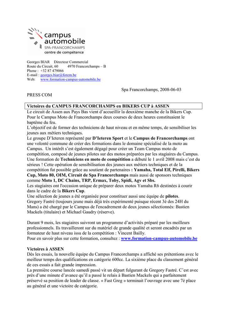 Georges BIAR Directeur Commercial Route du Circuit, 60 4970 Francorchamps – B Phone : +32 87 479066 E-mail : [email protected] Web: www.formation-campus-automobile.be Spa Francorchamps, 2008-06-03 PRESS COM Victoires du CAMPUS FRANCORCHAMPS en BIKERS CUP à ASSEN Le circuit de Assen aux Pays Bas vient d’accueillir la deuxième manche de la Bikers Cup. Pour le Campus Moto de Francorchamps deux courses de deux heures constituaient le baptême du feu. L’objectif est de former des techniciens de haut niveau et en même temps, de sensibiliser les jeunes aux métiers techniques. Le groupe D’Ieteren représenté par D’Ieteren Sport et le Campus de Francorchamps ont une volonté commune de créer des formations dans le domaine spécialisé de la moto au Campus. Un intérêt s’est également dégagé pour créer un Team Campus moto de compétition, composé de jeunes pilotes sur des motos préparées par les stagiaires du Campus. Une formation de Techniciens en moto de compétition a débuté le 1 avril 2008 mais c’est du sérieux ! Cette opération de sensibilisation des jeunes aux métiers techniques et de la compétition fut possible grâce au soutient de partenaires : Yamaha, Total Elf, Pirelli, Bikers Cup, Moto 80, OIM, Circuit de Spa Francorchamps mais aussi de sponsors techniques comme Moto 1, DC Chains, TRP, Ermax, Toby, Spidi, Agv et Sbs. Les stagiaires ont l'occasion unique de préparer deux motos Yamaha R6 destinées à courir dans le cadre de la Bikers Cup. Une sélection de jeunes a été organisée pour constituer aussi une équipe de pilotes. Gregory Fastré (toujours jeune mais déjà très expérimenté puisque récent 3è des 24H du Mans) a été chargé par le Campus de l'encadrement de deux jeunes sélectionnés: Bastien Mackels (titulaire) et Michael Gaudry (réserve). Durant 9 mois, les stagiaires suivront un programme d’activités préparé par les meilleurs professionnels. Ils travailleront sur du matériel de grande qualité et seront encadrés par un formateur de haut niveau issu de la compétition : Vincent Bailly. Pour en savoir plus sur cette formation, consultez : www.formation-campus-automobile.be Victoires à ASSEN Dès les essais, la nouvelle équipe du Campus Francorchamps a affiché ses prétentions avec le meilleur temps des qualifications en catégorie 600cc. La sixième place du classement général de ces essais a fait grande impression. La première course lancée samedi passé vit un départ fulgurant de Gregory Fastré. C’est avec près d’une minute d’avance qu’il a passé le relais à Bastien Mackels qui a parfaitement préservé sa position de leader de classe. « Fast Greg » terminait l’ouvrage avec une 7è place au général et une victoire de catégorie. Hautekiet Racing s’imposait an début de deuxième course disputée le dimanche mais devait vite céder le leadership au Team Campus Moto qui terminait finalement 5è au général et remportait une nouvelle victoire de catégorie avec près d’une minute d’avance. Gregory se montrait élogieux à propos de son élève Bastien qui a finalement signé un temps à moins d’une seconde de son professeur. Les stagiaires ont réalisé un travail parfait et profité de cette première expérience pour découvrir les qualités de la formation organisée au Campus Francorchamps. Le prochain rendez-vous est fixé à Dijon lors du dernier week-end de juillet.