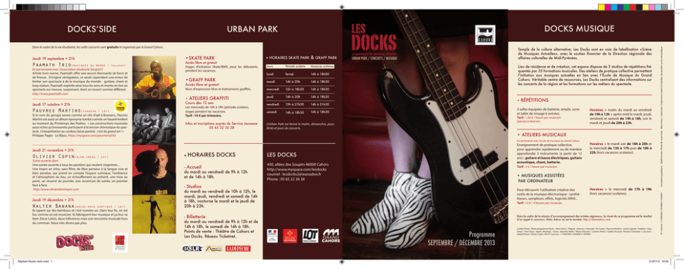 Jours Dans le cadre de la vie étudiante, les cafés concerts sont gratuits et organisés par le Grand Cahors. •SKATE PARK Jeudi 19 septembre > 21h Paamath Trio(musiques du monde / Toulouse) En partenariat avec l’association étudiante Sang’esi’t Artiste hors norme, Paamath offre une œuvre étonnante de force et de finesse. D’origine sénégalaise, ce serait cependant une erreur de limiter son spectacle à de la musique du monde : guitare, chant et loop station, Paamath exploite ainsi tous les sens et monte en live un spectacle sur mesure, surprenant, dont on ressort comme différent. http://www.paamath.com Jeudi 17 octobre > 21h Pauvres Martins(chanson / Lot) Si le nom du groupe sonne comme un clin d’œil à Brassens, Pauvres Martins est aussi un album éponyme tombé comme un hasard évident au moment du Printemps des Poètes. « Les constructions musicales aussi riches qu’innovantes participent à la tension dramatique du spectacle. L’interprétation au cordeau laisse pantois : c’est du grand art ! » Philippe Pagès - Le Bijou. https://myspace.com/pauvremartin Accès libre et gratuit Stages d’initiation Skate/BMX, pour les débutants, pendant les vacances. • HORAIRES SKATE PARK & GRAFF PARK Jours Période scolaire Vacances scolaires lundi fermé 14h à 18h00 •GRAFF PARK mardi 14h à 20h 14h à 18h30 Murs d’expression libre et événements graffitis. mercredi 12h à 18h30 14h à 18h30 • ATELIERS GRAFFITI Cours dès 12 ans jeudi 14h à 20h 14h à 18h30 vendredi 12h à 21h30 14h à 21h30 samedi 14h à 18h30 14h à 18h30 Accès libre et gratuit Les mercredis de 16h à 18h (période scolaire), stages pendant les vacances. Tarif : 10 € par trimestre. Infos et inscriptions auprès du Service Jeunesse 05 65 22 36 38 Temple de la culture alternative, Les Docks sont en voie de labellisation «Scène de Musiques Actuelles», avec le soutien financier de la Direction régionale des affaires culturelles de Midi-Pyrénées. programment les musiques actuelles URBAN PARK / CONCERTS / MUSIQUE Lieu de résidence et de création, cet espace dispose de 3 studios de répétitions fréquentés par 35 formations musicales. Des ateliers de pratique collective permettent l’initiation aux musiques actuelles en lien avec l’École de Musique du Grand Cahors. Véritable centre de ressources, Les Docks centralisent des informations sur les concerts de la région et les formations sur les métiers du spectacle. • RÉPÉTITIONS 3 salles équipées de batterie, amplis, sono et table de mixage 6 entrées. Tarif : 1,50 € / heure par musicien (pensez à réserver). L’Urban Park est fermé le matin, dimanches, jours fériés et jours de concerts. • ATELIERS MUSICAUX En partenariat avec l’école de musique du Grand Cahors. Jeudi 21 novembre > 21h Olivier Copin(slam impro / Lot) Scène ouverte slam Une soirée ouverte à tous les paroliers qui veulent s’exprimer... Une impro en intro, sans filtre, de libre penseur à la langue vive et bien pendue, qui prend en compte l’espace scénique, l’ambiance et l’atmosphère du lieu, un échauffement au présent, une mise au point, un résumé de journée, une ouverture de soirée, un premier face à face. http://www.olivierslamimpro.com Jeudi 19 décembre > 21h Walter Banana(noise-rock exotique / Lot) Ils tapent sur des bambous et c’est numéro un. Dans leur île, on est fou comme on est musicien. Ils fabriquent leur musique et ça leur va bien. Deux Lotois, deux influences mais une rencontre musicale hors du commun. Nous n’en dirons pas plus. Dépliant Docks recto.indd 1 Horaires > matin du mardi au vendredi de 10h à 12h > après-midi le mardi, jeudi, vendredi et samedi de 14h à 18h, soir le mardi et jeudi de 20h à 23h. • HORAIRES DOCKS LES DOCKS - Accueil 430, allées des Soupirs 46000 Cahors http://www.myspace.com/lesdocks courriel : [email protected] Phone : 05 65 22 36 38 du mardi au vendredi de 9h à 12h et de 14h à 18h. Enseignement de pratique collective, pour apprendre rapidement ou de manière approfondie 3 instruments (à partir de 12 ans) : guitare et basse électriques, guitare acoustique, chant, batterie. Horaires > le mardi soir de 18h à 20h et le mercredi de 13h à 17h puis de 18h à 22h (hors vacances scolaires). Tarif : 3 € / heure par musicien. • MUSIQUES ASSISTÉES PAR ORDINATEUR - Studios Horaires > le mercredi de 17h à 19h (hors vacances scolaires). du mardi au vendredi de 10h à 12h, le mardi, jeudi, vendredi et samedi de 14h à 18h, nocturne le mardi et le jeudi de 20h à 23h. Pour découvrir l’utilisation créative des outils de la musique électronique : synthétiseurs, sampleurs, effets, logiciels MAO... - Billetterie Dans le cadre de la mission d’accompagnement des artistes régionaux, le visuel de ce programme est le résultat d’un appel à concours. Alain Astruc en est le lauréat. http://alainastruc.com du mardi au vendredi de 9h à 12h et de 14h à 18h, le samedi de 14h à 18h. Points de vente : Théâtre de Cahors et Les Docks. Réseau Ticketnet. Tarif : 12 € / 4 heures par musicien. Programme SEPTEMBRE / DÉCEMBRE 2013 Crédits Photo : Photo programme Docks : Alain Astruc / Pégase : Johanna / Paamath : Titi Costes / Pauvres Martins : Lionel Lalande / Yodelice : Yann Orhan / Poni Hoax : Agnès Dherbeys / Soma : Machine Molle / Maria Ghanima : Caroline Petriz / Gaëtan Roussel : Richard Schroeder / Lina And : Gabriel Pérez / Olivier Copin : DR. N° Licences : 1-1050598 2-1050600 3-1050601 Conception graphique : Gaëlle Ferrere / Photo de couverture : Alain Astruc / Impression : Imprimerie Graphi & Chabrillac. Ne pas jeter sur la voie publique DOCKS MUSIQUE URBAN PARK N° Licences : 1-1050598 2-1050600 3-1050601 DOCKS’SIDE 31/07/13 16:00 PROGRAMME CONCERTS Jeudi 10 octobre > 21h Pégase, Weekend Affair, Le Common Diamond. Organisée par l’Université de Toulouse en partenariat avec le Grand Cahors. Le Common Diamond (space pop / Toulouse) Ce duo puise dans le solaire et