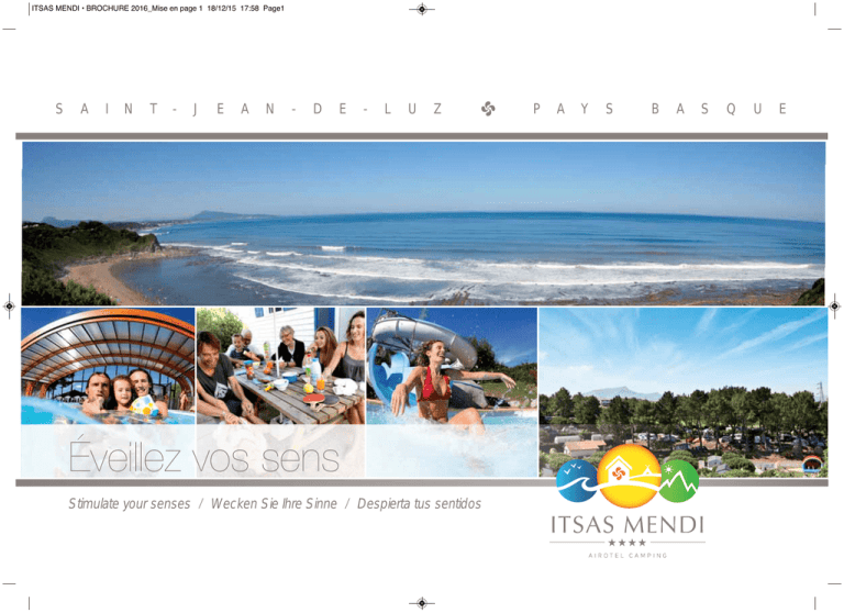 ITSAS MENDI • BROCHURE 2016_Mise en page 1 18/12/15 17:58 Page1 S A I N T - J E A N - D E - L U Z Éveillez vos sens Stimulate your senses / Wecken Sie Ihre Sinne / Despierta tus sentidos P A Y S B A S Q U E ITSAS MENDI • BROCHURE 2016_Mise en page 1 18/12/15 17:58 Page2 sommaire / summary übersicht / resumen Découvrez un oasis de tranquillité p3 Discover an oasis of peacefulness / Entdecken Sie eine Oase der Ruhe / Descubra un oasis de tranquilidad La liberté entre mer & montagne p 4-5 Freedom between ocean and mountain / Freiheit zwischen Meer und Bergen / Libertad entre mar y montaña Profitez les pieds dans l'eau p 6-7 Enjoy waterfront experience / Geniessen Sie die Füsse im Wasser / Disfrute con los pies en el agua Tonifiez votre séjour p 8-9 Tone up your stay / Fit in den Ferien / Tonifíquese Évadez-vous de votre quotidien p 10-11 Break the routine / Brechen Sie aus der Routine aus / Evádase de la rutina Stimulez votre esprit d'aventures ! p 12-13 Stimulate your sense of adventure ! / Wecken Sie Ihren Lust auf Abenteuer ! / ¡ Estimule su espíritu aventurero ! Trouvez l’hébergement qui vous ressemble p 14-15 Find the accommodation that best suits you / Finden Sie Ihre ideale Unterkunft / Encuentre el alojamiento que merece Simplifiez vos journées p 16-17 Simplify your day / Die Tage ganz einfach gestalten / Facilite su día Plan & Vie à l’intérieur du camping Map and life in the camping / Plan und Leben auf dem Campingplatz / Mapa y vida en el camping 2 p 18-19 ITSAS MENDI • BROCHURE 2016_Mise en page 1 18/12/15 17:58 Page3 Découvrez un oasis de tranquillité Discover an oasis of peacefulness / Entdecken Sie eine Oase der Ruhe / Descubra un oasis de tranquilidad En famille ou entre amis, vous profiterez dans notre camping de nombreux emplacements spacieux, ombragés et semi-ombragés, délimités par des arbustes ou des arbres pour tentes, caravanes ou camping-cars. Nous vous proposons également un vaste choix de locatifs confortablement aménagés. With your family or with your friends, you will profit large pitches of our camping site, which are also shaded and partially shaded, shrub or tree-lined pitches for tents, caravans or motorhome. We can also propose you our large selection of equipped rented accommodations with modern conveniences. Mit Familie oder Freunden können Sie von unseren zahlreichen grossen Stellplätzen für Zelte , Wohnwagen oder Wohnmobile profitieren, die idyllisch im Schatten oder Halbschatten gelegen und von Büschen oder Bäumen abgegrenzt sind. Ausserdem steht Ihnen eine grosse Auswahl an vollausgestatteten Unterkünften zur Verfügung. En familia o entre amigos, disfrute en nuestro camping de numerosas parcelas, sombreadas y semi-sombreadas, parcelas delimitadas por arbustos o árboles, para tiendas, caravanas o autocaravanas. Les proponemos igualmente varios mobilhomes con todas las comodidades. 3 ITSAS MENDI • BROCHURE 2016_Mise en page 1 18/12/15 17:58 Page4 La liberté entre mer & monta g Freedom between ocean and mountain Freiheit zwischen Meer und Bergen Libertad entre mar y montaña 4 ITSAS MENDI • BROCHURE 2016_Mise en page 1 18/12/15 17:59 Page5 ta gne À 400 m des plages, au pied des Pyrénées, le camping Itsas Mendi ★★★★ vous invite à vous détendre dans son parc de 9 hectares de verdure. Éveillez vos sens, redécouvrez le plaisir de la nature et ressourcez-vous au cœur du Pays Basque… Dans un environnement exceptionnel, le camping Itsas Mendi ★★★★ vous ouvre les portes de la culture basque. Force et douceur, entre mer et montagne, tous les ingrédients sont réunis pour faire de votre séjour une source de bonheur. 400m from the ocean, nearby the Pyrenees, Itsas Mendi Camping ★★★★ invite you to relax in 9 hectares of greenery. Awaken your senses, rediscover the real pleasure of nature et revitalize yourself in the heart of the Basque country… 400m vom Strand entfernt, zu Fusse der Pyrénéen gelegen, lädt Sie der Campingplatz Itsas Mendi ★★★★ ein sich in der 9ha grossen Parkanlage zu entspannen, geniessen Sie die Natur und schöpfen Sie Kraft im Herzen des Baskenlandes... Taking advantage of its extraordinary environnement, Itsas Mendi camping ★★★★ introduce you to the basque culture. Strength and softness, between ocean and mountains, everything is gathered together for your stay to be source of hap- In einer berauschend schönen Landschaft öffnet Ihnen der Campingplatz Itsas Mendi ★★★★ das Tor der baskischen Kultur. Kraft und Sanftheit, zwischen Meer und Gebirge sind alle Zutaten vereinigt um aus Ihrem Urlaub eine Quelle des Glücks werden zu lassen. piness. A 400 metros de las playas, bajo los Pirineos, el camping Itsas Mendi ★★★★ le invita a disfrutar de su parque de 9 hectáres de naturaleza. Despierte sus sentidos, redescubra el placer de la naturaleza y rencuéntrese en el corazón del País Vasco... En un entorno excepcional, el camping Itsas Mendi ★★★★ le abre las puertas a la cultura vasca. Fuerza y suavidad, entre mar y montaña, todos los ingredientes se reúnen para hacer de su estancia una fuente de bienestar. 5 ITSAS MENDI • BROCHURE 2016_Mise en page 1 18/12/15 17:59 Page6 6 ITSAS MENDI • BROCHURE 2016_Mise en page 1 18/12/15 17:59 Page7 Profitez les pieds dans l'eau Enjoy waterfront experience Geniessen Sie die Füsse im Wasser Disfrute con los pies en el agua 2 ESPACES AQUATIQUES CHAUFFÉS ■ ■ Une piscine "nage libre" couverte et chauffée avec jacuzzi, Au cœur du camping, espace aquatique (ouvert du 23/03 au 02/11) avec pataugeoire, cascades, bains bouillonnants, toboggan multipistes et toboggan à virages, plages gazonnées, ■ Jeux gonflables pour enfants (ouvert 15/06 au 02/11), ■ Les shorts de bain, les bermudas et les caleçons ne sont pas autorisés. 2 aquatic areas: ■ Near the bar, “free-style” swimming pool with a large jacuzzi, ■ In the middle of the camping site, aquatic area (open from 23