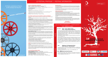 LE FESTIVAL PRATIQUE | FESTIVAL INFORMATION Air France, partenaire du Festival du film asiatique de Deauville ^``rbfi=C=fkcloj^qflkp=ö=fkcloj^qflk Billetterie - Accréditations Presse & Professionnels – Bureaux du Festival Ticketing - Accreditation for Press and Industry – Festival offices Centre International de Deauville (C.I.D) - Les Planches – 1, avenue Lucien Barrière - Tél. : 02 31 14 14 14 ïïïKÇÉ~ìîáääÉ~ëá~KÅçã http://www.facebook.com/Festival du Film Asiatique de Deauville Horaires | Hours: Mercredi 7 | 15h à 19h30 | Wednesday 7 | 3.00 pm to 7.30 pm Jeudi 8 | 8h30* à 20h | Thursday 8 | 8.30 am* to 8.00 pm * Attention ! 8h30 à 10h30 : À l’accueil Administration du C.I.D pour achat Billetterie uniquement * Note: 8.30 am to 10.30 am: At the Administration entrance only for purchase of tickets Vendredi 9 | 8h30 à 19h30 | Friday 9 | 8.30 am to 7.30 pm Samedi 10 | 8h30 à 20h00 | Saturday 10 | 8.30 am to 8.00 pm Dimanche 11 | 8h30 à 19h30 | Sunday 11 | 8.30 am to 7.30 pm _fiibqqbofb=C=^``Ðp=^ru=p^iibp=ö=qf`hbqfkd=C=^``bpp=ql=p`obbkfkdp L’entrée dans les salles de projection et l’auditorium est strictement limitée au nombre de places disponibles. Access to screening venues and auditorium is subject to availability of seating. ^``o°afq^qflk= ö= L’accréditation est personnelle, nominative et non cessible. Réservée aux professionnels du cinéma et de l’audiovisuel et à la presse, qui doivent en faire la demande au préalable. Merci de se munir d’une pièce d’identité et d’un justificatif professionnel pour le retrait de l’accréditation. Toute demande déposée sur place pendant le Festival pour une accréditation hors délai est payante au tarif de 12 €. Le catalogue officiel est remis gracieusement avec l’accréditation. The accreditation is individual, personal and non-transferable. For Press and Industry only. The application must be filled in and accreditation requested before the Festival. Please bring identification and proof of professional status upon collection. Any request for a post-deadline or on-site accreditation during the Festival costs 12 €. The official catalogue is offered with the accreditation delivered. p°`rofq°=ö=p^cbqv Pour des raisons de sécurité, un contrôle des sacs est effectué au C.I.D avant chaque projection. Il est strictement interdit de filmer, de prendre des photos ou d’enregistrer pendant les présentations et les projections des films. Tout contrevenant se verra confisquer son matériel et sera immédiatement raccompagné vers la sortie. For safety reasons, control of bags is done at the C.I.D before each screening. It is strictly forbidden to film, take pictures or record during presentations and screenings. Violators will forfeit their equipment and will be immediately escorted to the exit. afsbop=ö=jfp`bii^kblrp= Les téléphones portables doivent être éteints dès l’entrée dans la salle. Les salles doivent être évacuées à la fin de chaque séance. Le Festival du Film Asiatique de Deauville est une manifestation grand public couverte par les médias. La participation de tout festivalier implique son acceptation implicite pour une éventuelle présence à l’image le représentant dans le cadre du Festival et dans les supports médias présents. Le programme du Festival est susceptible de subir d’éventuelles modifications de dernière minute. Tout changement est annoncé sur le site internet www.deauvilleasia.com et sur les panneaux prévus à cet effet. Mobile phones must be turned off upon entry in the screening theater. The screening rooms must be emptied at the end of each screening. The Deauville Asian Film Festival is a public event with echoes in the media. Attending the Festival involves implicit acceptance of a potential appearance in images or press coverage of the Festival. The Festival schedule is likely to suffer any last minute change, which will be announced on the website www.deauvilleasia.com and on panels provided for this purpose. _lk=cbpqfs^i=>= bkglv=qeb=cbpqfs^i> LES AUTRES ÉVÉNEMENTS | OTHER EVENTS `KfKa | ^ìÇáíçêáìã=iÉñáåÖíçå m^pp=cbpqfs^i=ö=35 € | 12 € tarif réduit étudiant – 26 ans & demandeur d’emploi*. Strictement nominatif, avec photo et non cessible. Accès à toute séance programmée pendant le Festival et dans les deux lieux de projection (C.I.D & Casino) et auditorium. Accès possible aux Cérémonies d’Ouverture et du Palmarès dans la limite des places disponibles. NMÜ=J=NUÜ Strictly individual, with ID photo and non-transferable. Access to all screenings programmed during the Festival, in the two screening theaters (C.I.D & Casino) and auditorium. Access to Opening and Award Ceremonies subject to availability of seating. m^pp=glrok°b=ö=a^v=m^pp | 12 € | 5 € tarif réduit étudiant – 26 ans & demandeur d’emploi*. Personnel et non cessible. Accès à toute séance programmée le jour indiqué sur le pass acheté, dans les deux lieux de projection (C.I.D & Casino) et auditorium. Accès possible aux Cérémonies d’Ouverture et du Palmarès dans la limite des places disponibles et quelle que soit la date indiquée sur le pass Journée acheté. Personal and non-transferable. Access to all screenings programmed during the day mentioned on the Day Pass, in the two screening theaters (C.I.D & Casino) and auditorium. Access to Opening and Award Ceremonies for any Day Pass purchased (for any date during the Festival) but subject to availability of seating. VEN 9 FRI Ouverture de la journée par le Maire de Deauville. Mise en lumière des relations entre la région Basse-Normandie et la préfecture de Kyoto. Conférence sur les aspects et la situation géopolitiques du Japon. Table ronde « Les investissements et partenariats français au Japon ». Table ronde « Les investissements et partenariats japonais en France ». Discours de clôture par Son Excellence l’Ambassadeur du Japon en France