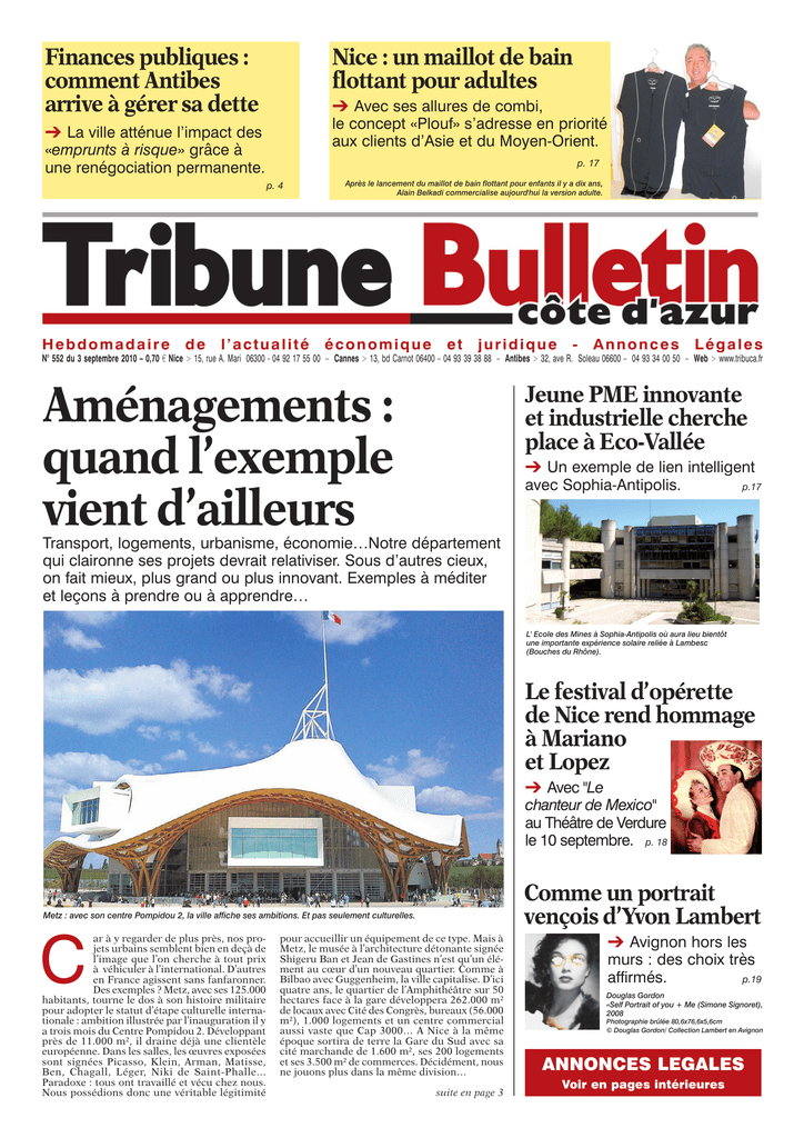 Finances publiques : comment Antibes arrive à gérer sa dette Nice : un maillot de bain flottant pour adultes ➔ Avec ses allures de combi, le concept «Plouf» s’adresse en priorité aux clients d’Asie et du Moyen-Orient. ➔ La ville atténue l’impact des «emprunts à risque» grâce à une renégociation permanente. p. 17 p. 4 Hebdomadaire de l’actualité Après le lancement du maillot de bain flottant pour enfants il y a dix ans, Alain Belkadi commercialise aujourd'hui la version adulte. économique et juridique - Annonces Légales N° 552 du 3 septembre 2010 – 0,70 a Nice > 15, rue A. Mari 06300 - 04 92 17 55 00 – Cannes > 13, bd Carnot 06400 – 04 93 39 38 88 – Antibes > 32, ave R. Soleau 06600 – 04 93 34 00 50 – Web > www.tribuca.fr Aménagements : quand l’exemple vient d’ailleurs Jeune PME innovante et industrielle cherche place à Eco-Vallée ➔ Un exemple de lien intelligent avec Sophia-Antipolis. p.17 Transport, logements, urbanisme, économie…Notre département qui claironne ses projets devrait relativiser. Sous d’autres cieux, on fait mieux, plus grand ou plus innovant. Exemples à méditer et leçons à prendre ou à apprendre… L' Ecole des Mines à Sophia-Antipolis où aura lieu bientôt une importante expérience solaire reliée à Lambesc (Bouches du Rhône). Le festival d’opérette de Nice rend hommage à Mariano et Lopez ➔ Avec "Le chanteur de Mexico" au Théâtre de Verdure le 10 septembre. p. 18 Comme un portrait vençois d’Yvon Lambert Metz : avec son centre Pompidou 2, la ville affiche ses ambitions. Et pas seulement culturelles. C ar à y regarder de plus près, nos projets urbains semblent bien en deçà de l’image que l’on cherche à tout prix à véhiculer à l’international. D’autres en France agissent sans fanfaronner. Des exemples ? Metz, avec ses 125.000 habitants, tourne le dos à son histoire militaire pour adopter le statut d’étape culturelle internationale : ambition illustrée par l’inauguration il y a trois mois du Centre Pompidou 2. Développant près de 11.000 m², il draine déjà une clientèle européenne. Dans les salles, les œuvres exposées sont signées Picasso, Klein, Arman, Matisse, Ben, Chagall, Léger, Niki de Saint-Phalle... Paradoxe : tous ont travaillé et vécu chez nous. Nous possédions donc une véritable légitimité pour accueillir un équipement de ce type. Mais à Metz, le musée à l’architecture détonante signée Shigeru Ban et Jean de Gastines n’est qu’un élément au cœur d’un nouveau quartier. Comme à Bilbao avec Guggenheim, la ville capitalise. D’ici quatre ans, le quartier de l’Amphithéâtre sur 50 hectares face à la gare développera 262.000 m² de locaux avec Cité des Congrès, bureaux (56.000 m²), 1.000 logements et un centre commercial aussi vaste que Cap 3000… A Nice à la même époque sortira de terre la Gare du Sud avec sa cité marchande de 1.600 m², ses 200 logements et ses 3.500 m² de commerces. Décidément, nous ne jouons plus dans la même division… suite en page 3 ➔ Avignon hors les murs : des choix très affirmés. p.19 Douglas Gordon «Self Portrait of you + Me (Simone Signoret), 2008 Photographie brûlée 80,6x76,6x5,6cm © Douglas Gordon/ Collection Lambert en Avignon ANNONCES LEGALES Voir en pages intérieures Revue de Presse Agenda CONFERENCE > Le 7 septembre à Saint-Laurent : communication et leadership, les clefs de la réussite professionnelle et personnelle, organisée par Dale Carnegie Nice. Gratuit, mais places limitées. De 19h à 20h30. Infos et inscriptions 04.92.12.21.15. La semaine de Jean-Jacques Ninon ➜ www.ninon-avocat.com "A Moscou, Poutine me faisait part..." ou encore "Attendez, je vous reprends, j'ai l'Elysée en ligne". Propulsé sur une autre planète, JLB ne redescend plus sur terre. Lorsque la confrérie des maîtres pipiers de Saint-Claude (HautJura) l'intronise "premier fumeur de pipe de France", son discours tourne au ridicule : "Il existe une certaine similitude entre notre combat face à Al-Qaeda et celui des artisans" qui "maintiennent la notoriété mondiale" de la pipe de Saint-Claude "tout en conservant cet aspect typique". Jean-Louis Bruguière RENDEZ-VOUS > Le 16 septembre à Nice : 13èmes Palmes de la Communication. Organisées par l’association Fenêtre sur Com. A 18h30 à Acropolis. Infos : www.fenetresurcom.org En campagne des législatives pour l'ump à Villeneuvesur-Lot en 2007, l'aspirant député se fait le chantre de la lutte contre l'insécurité. (...) Bruguière se ramasse avec 47,7 % des voix mais se montre, comme à son habitude, frimeur et... blindé: "J'ai vécu des situations beaucoup plus difficiles. Tenez, au Tchad par exemple, en 1989, quand des balles de mitrailleuses m'avaient frôlé..." Sortir ARTISANAT Promenade des métiers d’art Le 6 septembre à Villefranche-sur-Mer, gratuit. ➔ Pour la cinquième année consécutive, la Chambre de métiers des Alpes-Maritimes met en place ces promenades qui mettent en valeur artisans et savoir faire ancestraux. MONTAGNE 30 ans, 30 cols et sommets Les 10 et 11 septembre entre France et Italie, gratuit ➔ Le Parc du Mercantour et son homologue italien Parco naturale delle Alpi Marittime s’ouvrent au grand public pour fêter leur anniversaire commun. Au programme, balades, animations, randonnées de tous niveaux. Renseignements et préinscriptions sur www.mercantour. eu/30ans/30sommets FETE San Bertoumieu Les 11 et 12 septembre dans le vieux-Nice et place Garibaldi ➔ L’occasion de se replonger dans les traditions niçoises le temps d’un week end où le temps semble s’être arrêté. Bœuf à la broche collectif en prime. DEBAT ➔ Albert Camus dans sa lumière Le 17 septembre à 18h30 à la médiathèque de Cannes, 1 avenue de Noailles Animé par trois grands spécialistes de son œuvre, Alain Vircondelet (auteur de «Albert Camus, fils d’Alger»), JeanFrançois Mattei («Albert Camus et la pensée de midi»)