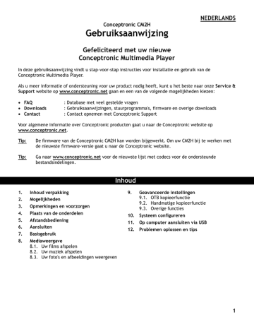 NEDERLANDS Conceptronic CM2H Gebruiksaanwijzing Gefeliciteerd met uw nieuwe Conceptronic Multimedia Player In deze gebruiksaanwijzing vindt u stap-voor-stap instructies voor installatie en gebruik van de Conceptronic Multimedia Player. Als u meer informatie of ondersteuning voor uw product nodig heeft, kunt u het beste naar onze Service & Support website op www.conceptronic.net gaan en een van de volgende mogelijkheden kiezen: FAQ Downloads Contact : Database met veel gestelde vragen : Gebruiksaanwijzingen, stuurprogramma's, firmware en overige downloads : Contact opnemen met Conceptronic Support Voor algemene informatie over Conceptronic producten gaat u naar de Conceptronic website op www.conceptronic.net. Tip: De firmware van de Conceptronic CM2H kan worden bijgewerkt. Om uw CM2H bij te werken met de nieuwste firmware-versie gaat u naar de Conceptronic website. Tip: Ga naar www.conceptronic.net voor de nieuwste lijst met codecs voor de ondersteunde bestandsindelingen. Inhoud 1. 2. Inhoud verpakking Mogelijkheden 3. Opmerkingen en voorzorgen 4. 5. Plaats van de onderdelen Afstandsbediening 6. 7. Aansluiten Basisgebruik 8. Mediaweergave 8.1. Uw films afspelen 8.2. Uw muziek afspelen 8.3. Uw foto's en afbeeldingen weergeven 9. 10. 11. 12. Geavanceerde instellingen 9.1. OTB kopieerfunctie 9.2. Handmatige kopieerfunctie 9.3. Overige functies Systeem configureren Op computer aansluiten via USB Problemen oplossen en tips 1 NEDERLANDS 1. Inhoud verpakking U vindt de volgende items in de verpakking van de Conceptronic Multimedia player: Conceptronic CM2H Multimedia player (in deze gebruiksaanwijzing aangeduid als 'CM2H') Netvoeding 5V gelijkstroom, 2A Afstandsbediening 2 batterijen (AAA) voor de afstandsbediening AV-naar-composiet videokabel (met drie tulpstekkers: rood, wit en geel) Composiet-naar-scart adapter Kabel mini-USB naar USB Deze gebruiksaanwijzing Garantiekaart en boekje CE-verklaring 2. Mogelijkheden Meertalige bediening: Nederlands, Engels, Duits, Frans, Italiaans, Spaans, Portugees. Ondersteunt meerdere harddisk-partities. Ondersteunt de bestandssystemen FAT32 en NTFS. HDMI videouitgang tot 1080i. Ondersteunt ondertitels (.SMI/.SRT/.SUB) voor MPEG4 (AVI). Ondersteunt AVI (MPEG4), MPG (MPEG1, MPEG2), DAT (VCD), VOB (DVD), IFO (DVD), ISO, WAV, WMA, MP3, JPG. Ondersteunt diverse codecs. Zie onze website voor een lijst met alle ondersteunde codecs. Uitgangen: HDMI/composiet video/stereo geluidsuitgang met tulpstekkers. Geschikt voor PAL/NTSC. Diverse herhaalmethodes. Screensaver. 14 overvloeimethodes voor foto's. Diashow (automatische beeldwisseling) met achtergrondmuziek. Instelbare interval. Functies voor zoomen en roteren. Automatische omschakeling tussen mediaspeler en USB opslagapparaat voor pc: Wanneer de CM2H met een pc verbonden is, gedraagt hij zich als USB opslagapparaat. Wanneer hij niet met een pc verbonden is, gedraagt hij zich als mediaspeler. NB: 2 De CM2H kan geen HD-films weergeven (720p, 1080i, 1080p). NEDERLANDS 3. Opmerkingen en voorzorgen Probeer de meegeleverde lichtnetadapter niet uit elkaar te halen. Dit kan leiden tot verwondingen door elektriciteit met een hoge spanning. Als de adapter moet worden gerepareerd, neem dan contact op met uw dealer of de helpdesk van Conceptronic. Houd de CM2H uit de buurt van te vochtige situaties. Stel de CM2H niet bloot aan vloeistoffen. Verwijder de lichtnetadapter als u de CM2H langere tijd niet wilt gebruiken. Gebruik de CM2H niet in de buurt van brandbare stoffen. Vervang de batterij van de afstandsbediening door hetzelfde type wanneer hij leeg is. Lever oude batterijen in voor hergebruik. Om corrosie te voorkomen, moet u de batterij verwijderen als de afstandsbediening langere tijd niet gebruikt zal worden. Houd de afstandsbediening uit de buurt van te vochtige omstandigheden en laat hem niet vallen. Gebruik de afstandsbediening niet in fel zonlicht. Zorg dat de CM2H NOOIT valt, wordt gestoten of geschud. Om oververhitting te voorkomen, mag u de CM2H niet afdekken. NB: De gegevens op de interne harde schijf kunnen gefragmenteerd zijn. Dit kan invloed hebben op de weergave van films. Het is een goed idee om de harde schijf af en toe te defragmenteren met uw computer. 4. Plaats van de onderdelen Op de binnenflap van deze gebruiksaanwijzing vindt u een afbeelding van de CM2H met alle aansluitingen en knoppen. De letters uit de afbeelding verwijzen naar de onderstaande tabel, waarin de bijbehorende aansluitingen en knoppen van de CM2H worden uitgelegd. Betekenis van de letters: A. B. C. D. E. Gelijkstroomingang (5V 2A) AV-uitgang HDMI-uitgang Mini-USB aansluiting SD(HC)/MMS/MS kaartsleuf F. G. H. I. J. Aan/uit lampje USB lampje Harddisk-lampje OK-knop Navigatietoetsen ( ) K. Stop/Music-toets L. Menu/OTB-toets M. N. O. P. Q. Aan/uitschakelaar A/V-lampje HDMI-lampje OTB-lampje Infraroodontvanger Hier sluit u de netvoeding aan op de CM2H. Hier sluit u de AV-kabel aan op de CM2H. Hier sluit u een HDMI-kabel aan op de CM2H. Hiermee sluit u de CM2H aan op uw computer. Hier kunt u een SD(HC), MMS of Memory Stick geheugenkaart in de CM2H doen. Geeft aan of de CM2H aan staat. Geeft aan of de CM2H met de pc verbonden is. Geeft aan of de CM2H de harde schijf benadert. OK-knop voor gebruik zonder afstandsbediening. In menu: Door de menu's van de CM2H navigeren. Tijdens weergave: Geluid harder/zachter zetten. Vooruit/terugspoelen. Kort indrukken: Weergave stoppen Lang indrukken: De muziekfunctie starten. Kort indrukken: Terug naar hoofdmenu/hoofdmap. Lang indrukken: De OTB kopieerfunctie starten. CM2H aan- of uitzetten. Geeft aan of de CM2H verbonden is met de AV-kabel. Geeft aan of de CM2H verbonden is via HDMI. Geeft aan of de OTB-functie actief is. Sensor voor infraroodontvangst van de afstandsbediening. 3 NEDERLANDS 5. Afstandsbediening De CM2H kan worden bediend met de afstandsbediening. Op de binnenflap van deze gebruiksaanwijzing vindt u een afbeelding van de afstandsbediening. De nummering van de toetsen verwijst naar de ondersta