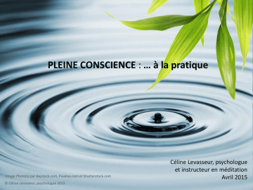 PLEINE CONSCIENCE : … à la pratique Image Photo(s) par Bajstock.com, Pixabay.com et Shutterstock.com © Céline Levasseur, psychologue 2015 Céline Levasseur, psychologue et instructeur en méditation Avril 2015 DIVULGATION DU PRÉSENTATEUR: Veuillez prendre note que cette conférence et les notions qui y sont décrites ne représentent aucun conflit d’intérêts commerciaux ou autres. AVERTISSEMENT S.V.P. VEUILLEZ ÉTEINDRE vos CELLULAIRES durant la présentation Merci de votre compréhension, Bonne présentation ! © Céline Levasseur, psychologue 2015 - MOT DE BIENVENUE - PRÉSENTATION PERSONNELLE - OBJECTIFS de la PRÉSENTATION © Céline Levasseur, psychologue 2015 OBJECTIFS: - Expérimenter sommairement la Pleine Conscience - Identifier les bases d’intervention de la Pleine Conscience - Énumérer les critères d’exclusion et les contre-indications à la Méditation Pleine Conscience © Céline Levasseur, psychologue 2015 ORIGINE & DÉVELOPPEMENT DES INTERVENTIONS PLEINE CONSCIENCE Dans le bouddhisme, la Méditation Pleine Conscience joue un rôle primordial pour arriver à la libération de la souffrance. Il est affirmé que la Pleine Conscience est un facteur essentiel pour la libération (Bodhi ou éveil spirituel). LES PRÉCURSEURS DE LA PLEINE CONSCIENCE EN OCCIDENT: Matthieu Ricard Jack Kornfield Jon Kabat-Zinn Le terme Mindfulness est la traduction anglaise du mot sanscrit smrti (sati en Pali) qui signifie "mémoire", "conscience" et "attention". En français, nous utilisons le terme "Pleine Conscience", "Attention Juste" ou "Présence Attentive" . © Céline Levasseur, psychologue 2015 LA MÉDITATION COMME INTERVENTION EN SANTÉ Un peu d’histoire … Jon Kabat-Zinn et la suite À ce jour, on trouve plus de 2,000 articles scientifiques sur la méditation Pleine Conscience (Vago, 2012). Des milliers de personnes à travers le monde se sont initiées à cette pratique et elle est maintenant offerte dans de nombreux hôpitaux, cliniques, universités et centres de recherche partout dans le monde. Elle gagne en popularité dans plusieurs secteurs d’activités mais le domaine de la santé est sans doute celui qui a fourni le plus de données probantes. C’est une pratique simple mais pas nécessairement facile … © Céline Levasseur, psychologue 2015 FAUSSES CROYANCES - CE QUE LA MÉDITATION N’EST PAS: - Ce n’est pas se relaxer Ce n’est pas entrer en transe Ce n’est pas être immobile (au contraire) Ce n’est pas une pratique mystérieuse Ce n’est pas développer des pouvoirs surhumains Elle n’est pas réservée aux religieux Ce n’est pas un moyen de se détourner de la réalité Ce n’est pas une solution miracle pour être heureux Ce n’est pas une thérapie Ce n’est pas un repli sur soi égoïste Ce n’est pas non plus s’asseoir et avoir des pensées élevées Ça ne fait pas faire disparaître ses problèmes Ce n’est pas non plus un moyen de réfléchir à ses problèmes © Céline Levasseur, psychologue 2015 DÉFINITIONS DE LA PLEINE CONSCIENCE: Pour J.K.-Zinn (1990), c’est l’état de conscience qui résulte du fait de porter son attention, de façon intentionnelle, au moment présent, sans jugement, sur l’expérience qui se déploie moment après moment. Pour S.R. Bishop (2004), la Pleine Conscience est une autorégulation de l’attention et l’orientation de celle-ci vers son expérience immédiate, permettant une connaissance accrue des événements mentaux dans le moment présent. Cette orientation est caractérisée par la curiosité, l’ouverture et l’acceptation. © Céline Levasseur, psychologue 2015 POUR MATTHIEU RICARD : Pour Matthieu Ricard, docteur en génétique cellulaire et moine bouddhiste tibétain, "Méditer, c'est cultiver son esprit, l'aider à avoir une vision plus juste de la réalité, se familiariser avec la tolérance, l'altruisme, la tendresse, qualités dont nous avons tous le potentiel, mais que nous ne déployons que par instants fugaces. " (Ricard, M. (2008), L’Express, édition de sept.) Selon lui, la méditation constitue un véritable entraînement du mental. © Céline Levasseur, psychologue 2015 EXERCICE © Céline Levasseur, psychologue 2015 En quoi cela peut-il vous être utile ou vous servir ? Différent d’habituellement? Ce que vous avez noté ? © Céline Levasseur, psychologue 2015 ÊTRE BIEN ANCRÉ DANS L’ICI ET MAINTENANT … plus facile à dire qu’à faire " Que chacun examine ses pensées, il les trouvera toutes occupées au passé ou à l’avenir. " (Blaise Pascal « Les pensées ») © Céline Levasseur, psychologue 2015 RAREMENT NOUS EXPÉRIMENTONS LE PRÉSENT - 47 % du temps, nous ne sommes pas mentalement présents. - Le vagabondage mental relié à un moins grand sentiment de bonheur (même avec des fantaisies plaisantes) et une moins bonne santé mentale. - Ce que l’on pense est plus relié au bonheur que ce que l’on ferait… (Killingsworth & Gilbert, 2010; Sheline et al., 2009) - 95 % de nos comportements sont conduits par notre inconscient. (Lipton, B., 2006) © Céline Levasseur, psychologue 2015 EFFETS DE LA PRATIQUE DE LA PLEINE CONSCIENCE (Baer, R. A., 2003; Berghman, et al, 2009; Grossman, P. et al, 2004; Heeren, A. & Philippot, P.,(2009; 2010) BÉNÉFICES PSYCHO-AFFECTIFS: - Meilleure régulation émotionnelle - Réduction de la réactivité - Augmentation de la flexibilité psychologique - Réduction de la détresse psychologique - Diminution des symptômes dépressifs et de l’anxiété - Diminution des risques de rechutes dépressives - Amélioration des relations interpersonnelles AUTRES BÉNÉFICES INTRA – PERSONNELS: - Augmentation de la conscience de soi - Augmentation du bien-être en général - Augmentation des régions cérébrales associées à l’attention, à la conscience sensorielle et à la concentration - Moins de distractions – meilleure attention/concentration - Augmentation des télomères - Augmentation de la vitesse de trai
