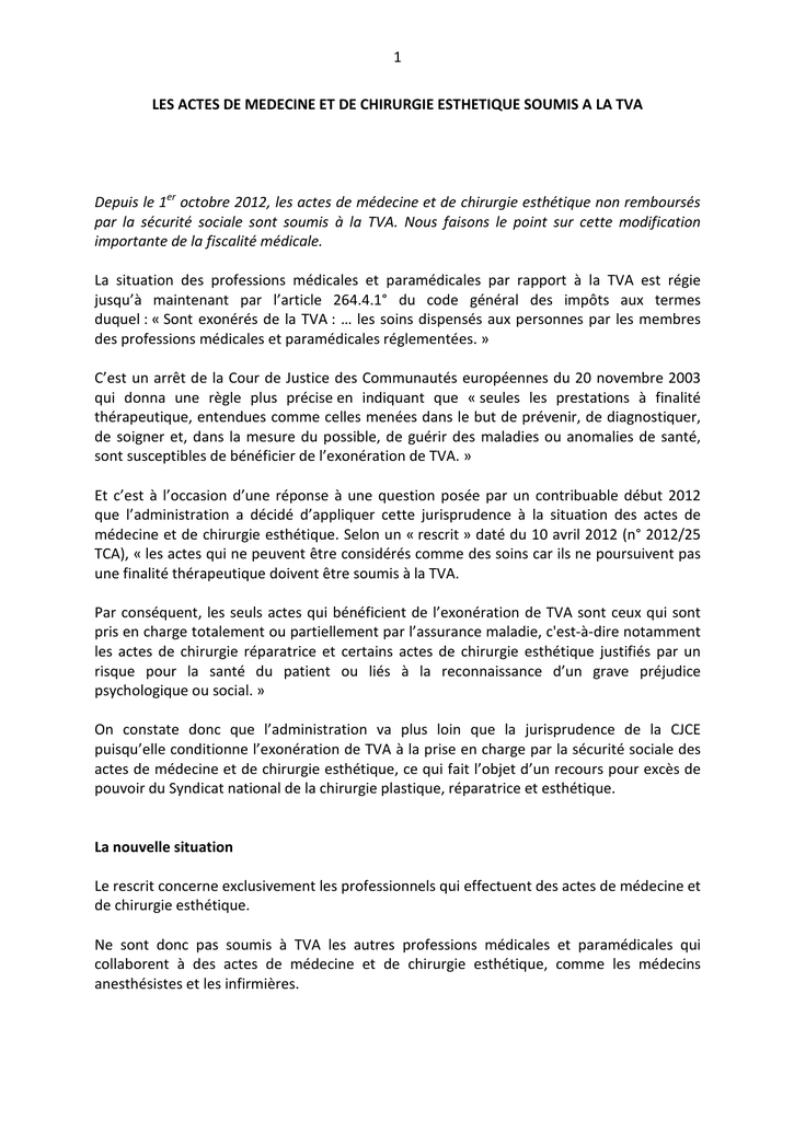 1 LES ACTES DE MEDECINE ET DE CHIRURGIE ESTHETIQUE SOUMIS A LA TVA Depuis le 1er octobre 2012, les actes de médecine et de chirurgie esthétique non remboursés par la sécurité sociale sont soumis à la TVA. Nous faisons le point sur cette modification importante de la fiscalité médicale. La situation des professions médicales et paramédicales par rapport à la TVA est régie jusqu’à maintenant par l’article 264.4.1° du code général des impôts aux termes duquel : « Sont exonérés de la TVA : … les soins dispensés aux personnes par les membres des professions médicales et paramédicales réglementées. » C’est un arrêt de la Cour de Justice des Communautés européennes du 20 novembre 2003 qui donna une règle plus précise en indiquant que « seules les prestations à finalité thérapeutique, entendues comme celles menées dans le but de prévenir, de diagnostiquer, de soigner et, dans la mesure du possible, de guérir des maladies ou anomalies de santé, sont susceptibles de bénéficier de l’exonération de TVA. » Et c’est à l’occasion d’une réponse à une question posée par un contribuable début 2012 que l’administration a décidé d’appliquer cette jurisprudence à la situation des actes de médecine et de chirurgie esthétique. Selon un « rescrit » daté du 10 avril 2012 (n° 2012/25 TCA), « les actes qui ne peuvent être considérés comme des soins car ils ne poursuivent pas une finalité thérapeutique doivent être soumis à la TVA. Par conséquent, les seuls actes qui bénéficient de l’exonération de TVA sont ceux qui sont pris en charge totalement ou partiellement par l’assurance maladie, c'est-à-dire notamment les actes de chirurgie réparatrice et certains actes de chirurgie esthétique justifiés par un risque pour la santé du patient ou liés à la reconnaissance d’un grave préjudice psychologique ou social. » On constate donc que l’administration va plus loin que la jurisprudence de la CJCE puisqu’elle conditionne l’exonération de TVA à la prise en charge par la sécurité sociale des actes de médecine et de chirurgie esthétique, ce qui fait l’objet d’un recours pour excès de pouvoir du Syndicat national de la chirurgie plastique, réparatrice et esthétique. La nouvelle situation Le rescrit concerne exclusivement les professionnels qui effectuent des actes de médecine et de chirurgie esthétique. Ne sont donc pas soumis à TVA les autres professions médicales et paramédicales qui collaborent à des actes de médecine et de chirurgie esthétique, comme les médecins anesthésistes et les infirmières. 2 Dans la version actuelle du rescrit, l’administration considère que les actes de médecine et de chirurgie esthétique soumis à TVA correspondent à ceux qui ne sont pas remboursés par l’assurance maladie. Elle refuse donc l’existence d’actes non remboursés par la sécurité sociale mais ayant une finalité thérapeutique, position qui est contestée par certains professionnels. L’assujettissement à la TVA s’applique aux règlements reçus à compter du 1er octobre 2012 pour des actes de médecine et de chirurgie esthétique effectués à partir de cette même date. Il n’y a pas eu de mesures transitoires pour les actes ayant fait l’objet d’un devis avant le 1er octobre 2012. Comment procéder : la déclaration d’existence Dès lors que vous êtes assujetti à la TVA sur vos actes de médecine ou de chirurgie esthétique, vous devez déposer une « déclaration d’existence » auprès du service des impôts des entreprises dont vous dépendez (le même que celui où vous adressez votre déclaration 2035), et ce, même si vous bénéficiez de la franchise en base (article 286 du code général des impôts). Vous trouverez ci-après un modèle de cette déclaration qui peut être faite par courrier simple, en principe dans les quinze jours suivant le commencement de vos opérations soumises à la TVA. Monsieur, En tant que médecin dermatologue (ou chirurgien plasticien), j’effectue des actes de médecine (ou de chirurgie) esthétique qui sont soumis à TVA depuis le 1er octobre 2012 en vertu du rescrit du 10 avril 2012 (n° 2012/25 TCA) et de la note du 27 septembre 2012. Pouvez-vous m’adresser mon numéro de TVA intracommunautaire ainsi que les documents nécessaires à mon immatriculation ? J’opte pour le régime du réel simplifié (ou pour le régime du réel normal) et, s’agissant d’une activité nouvellement assujettie, je bénéficie de la franchise en base à compter du 1er octobre 2012. Le choix entre les deux régimes d’imposition Vous pouvez être soumis à deux régimes d’imposition, soit obligatoirement, soit par option. 3 Le régime réel simplifié Vous pouvez en bénéficier si le montant hors taxe de vos recettes soumises à TVA est inférieur à 234 000 euros. Dans ce régime, vous versez quatre acomptes en cours d’année N (en avril, juillet, octobre et décembre) puis vous déposez avant le 30 avril de l’année N + 1 une déclaration CA 12 qui sert à : - Récapituler la TVA sur vos recettes de l’année N, - Indiquer la TVA récupérable pour toute l’année N, - Calculer la régularisation de TVA, qui peut être soit un solde de TVA à payer, soit un crédit de TVA pour l’année N + 1, - Déterminer le montant des acomptes de l’année N + 1. Le régime réel normal Chaque mois (ou chaque trimestre, si la TVA due dans l’année est inférieure à 4 000 euros), vous déposez une déclaration CA 3 donnant, pour chaque période, : - Le montant des recettes non soumises à TVA, - Le montant des recettes soumises à TVA, - La TVA correspondante, - La TVA récupérable sur les biens et services et sur les immobilisations, - La TVA à verser au Trésor public ou le crédit de TVA à reporter sur le mois ou le trimestre suivant. Le régime du réel normal est de droit si vos recettes assujetties à TVA dépassent 234 000 euros mais, si