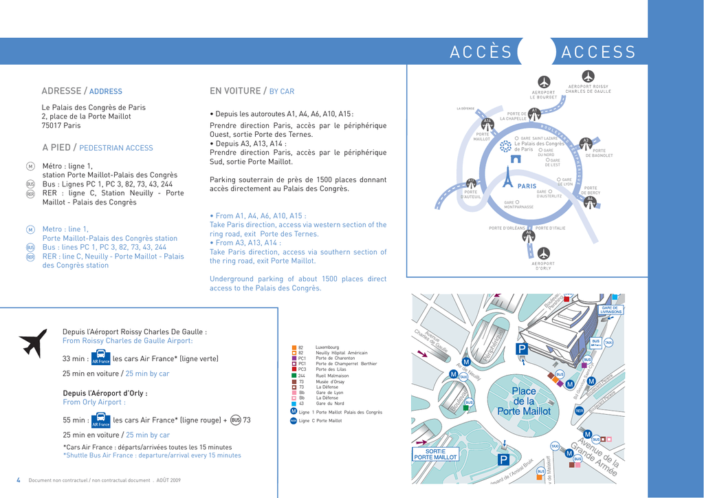 ACCÈS ADRESSE / ADDRESS EN VOITURE / BY CAR Le Palais des Congrès de Paris 2, place de la Porte Maillot 75017 Paris • Depuis les autoroutes A1, A4, A6, A10, A15 : A PIED / PEDESTRIAN ACCESS M BUS RER M BUS RER Métro : ligne 1, station Porte Maillot-Palais des Congrès Bus : Lignes PC 1, PC 3, 82, 73, 43, 244 RER : ligne C, Station Neuilly - Porte Maillot - Palais des Congrès Metro : line 1, Porte Maillot-Palais des Congrès station Bus : lines PC 1, PC 3, 82, 73, 43, 244 RER : line C, Neuilly - Porte Maillot - Palais des Congrès station LA DÉFENSE Prendre direction Paris, accès par le périphérique Ouest, sortie Porte des Ternes. • Depuis A3, A13, A14 : Prendre direction Paris, accès par le périphérique Sud, sortie Porte Maillot. Parking souterrain de près de 1500 places donnant accès directement au Palais des Congrès. • From A1, A4, A6, A10, A15 : Take Paris direction, access via western section of the ring road, exit Porte des Ternes. • From A3, A13, A14 : Take Paris direction, access via southern section of the ring road, exit Porte Maillot. Depuis l’Aéroport Roissy Charles De Gaulle : From Roissy Charles de Gaulle Airport: 82 82 PC1 PC1 PC3 244 73 73 Bb Bb 43 les cars Air France* (ligne verte) 25 min en voiture / 25 min by car Depuis l’Aéroport d’Orly : From Orly Airport : Luxembourg Neuilly Hôpital Américain Porte de Charenton Porte de Champerret Berthier Porte des Lilas Rueil Malmaison Musée d’Orsay La Défense Gare de Lyon La Défense Gare du Nord Ligne 1 Porte Maillot Palais des Congrès 55 min : les cars Air France* (ligne rouge) + BUS 25 min en voiture / 25 min by car *Cars Air France : départs/arrivées toutes les 15 minutes *Shuttle Bus Air France : departure/arrival every 15 minutes 4 Document non contractuel / non contractual document . AOÛT 2009 A14 PORTE MAILLOT PORTE DE LA CHAPELLE A1 GARE SAINT LAZARE Le Palais des Congrès de Paris GARE DU NORD 73 Ligne C Porte Maillot A3 PORTE DE BAGNOLET GARE DE L’EST GARE DE LYON A13 GARE D’AUSTERLITZ PORTE D’AUTEUIL GARE MONTPARNASSE Underground parking of about 1500 places direct access to the Palais des Congrès. 33 min : ACCESS PORTE D’ORLÉANS PORTE D’ITALIE A6 PORTE DE BERCY A4