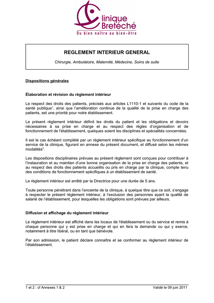 REGLEMENT INTERIEUR GENERAL Chirurgie, Ambulatoire, Maternité, Médecine, Soins de suite Dispositions générales Élaboration et révision du règlement intérieur Le respect des droits des patients, précisés aux articles L1110-1 et suivants du code de la santé publique1, ainsi que l’amélioration continue de la qualité de la prise en charge des patients, est une priorité pour notre établissement. Le présent règlement intérieur définit les droits du patient et les obligations et devoirs nécessaires à sa prise en charge et au respect des règles d’organisation et de fonctionnement de l'établissement, quelques soient les disciplines et spécialités concernées. Il est le cas échéant complété par un règlement intérieur spécifique au fonctionnement d’un service de la clinique, figurant en annexe du présent document, et diffusé selon les mêmes modalités2. Les dispositions disciplinaires prévues au présent règlement sont conçues pour contribuer à l’instauration et au maintien d’une bonne organisation de la prise en charge des patients, et au respect des droits des patients accueillis ou pris en charge par la clinique, compte tenu des conditions de fonctionnement spécifiques à un établissement de santé. Le règlement intérieur est arrêté par la Directrice pour une durée de 5 ans. Toute personne pénétrant dans l’enceinte de la clinique, à quelque titre que ce soit, s’engage à respecter le présent règlement intérieur, à l’exclusion des personnes ayant la qualité de salarié de l’établissement, pour lesquelles les obligations sont prévues par ailleurs. Diffusion et affichage du règlement intérieur Le règlement intérieur est affiché dans les locaux de l'établissement ou du service et remis à chaque personne qui y est prise en charge et qui en fera la demande ou qui y exerce, notamment à titre libéral, ou en tant que bénévole. Par son admission, le patient déclare connaître et se conformer au règlement intérieur de l’établissement. 1 et 2 : cf Annexes 1 & 2 Validé le 09 juin 2011 SECTION 1 PRINCIPES GENERAUX Art. 1 Principe du libre choix du patient et modalités générales de prise en charge par une équipe organisée Le droit du patient au libre choix de son praticien et de son établissement de santé est un principe fondamental de la législation sanitaire. Ce droit s'exerce au sein de la spécialité médicale dont le patient relève, dans les limites imposées par les situations d'urgence et par les disponibilités en lits et en personnel de la clinique. L'accueil des patients et des accompagnants est assuré, à tous les niveaux, par un personnel spécialement préparé à cette mission. Les patients sont informés du nom des praticiens et des personnes appelées à leur donner des soins. Par son admission, le patient consent à être pris en charge par une équipe de soins, et à confier les informations le concernant à l’ensemble de l’équipe, dans le respect des règles relatives au secret professionnel, conformément à l’article L1110-4 du code de la santé public. Afin d’assurer un fonctionnement optimal de l’établissement, dans le respect des principes de continuité des soins, de leur qualité et de leur sécurité, ainsi que dans le respect du principe du libre choix, par le patient, de son praticien, les patients ne peuvent, à raison de leurs opinions et convictions, récuser un professionnel à quelque titre qu’il intervienne (salarié, exercice libéral …) ni refuser la présence d’un autre patient, notamment pour les chambres doubles, ni exiger une adaptation du fonctionnement du service et/ou de l’établissement. Art. 2 Livret d’accueil Il est remis à tout patient, malades ou parturiente (ci-après, le « patient ») admis au sein de l’établissement un livret d’accueil qui contient tous les renseignements utiles sur les conditions de séjour et l’organisation de la clinique. Une synthèse de la Charte du patient hospitalisé est jointe au livret d'accueil, ainsi qu’un questionnaire de mesure de la satisfaction dans lequel le patient peut librement consigner ses observations, critiques et suggestions. La Charte complète est consultable à l'accueil ou sur le site Internet de la clinique. Extrait de l’arrêté du 15 avril 2008 relatif au contenu du livret d'accueil des établissements de santé Le livret rappelle : « 1. La mention, dans la charte de la personne hospitalisée annexée à la circulaire DHOS / E1 / DGS / DS1B / SD1C / SD4A / 2006 / 90 du 2 mars 2006, des droits essentiels de la personne hospitalisée. Le livret précise que les principes généraux de la charte lui sont annexés, que le document intégral, en plusieurs langues et en braille, est accessible sur le site internet : www.sante.gouv.fr et qu'il peut être également obtenu gratuitement, sans délai, sur simple demande, auprès du service chargé de l'accueil de l'établissement. » Règlement intérieur général 2011– Clinique Bretéché – page 2/17 SECTION 2 : ACCUEIL, CONSULTATIONS ET ADMISSION DES PATIENTS, MALADES ET PARTURIENTES Art. 1 Consultations La clinique dispose de secteurs de consultations et de soins pour les patients ne relevant pas de l’hospitalisation complète ou partielle dans ses services. Les tarifs des consultations sont affichés dans les salles d’attente des consultation concernés. cabinets de Art. 2 Formalités et informations administratives d’admission et de prise en charge 2.1 Procédure d’admission Les modalités d’admission (pièces à fournir au moment de l’admission, prise en charge des frais d’hospitalisation), ainsi que les prestations proposées au patient, sont décrites dans le livret d’accueil. Le patient est tenu d’indiquer s’il bénéficie d’une mesure de tutelle, et dans l’affirmative de communiquer les coordonnées précises de son tuteur, dont le consentement sera également requis pour les soins. L'admission d