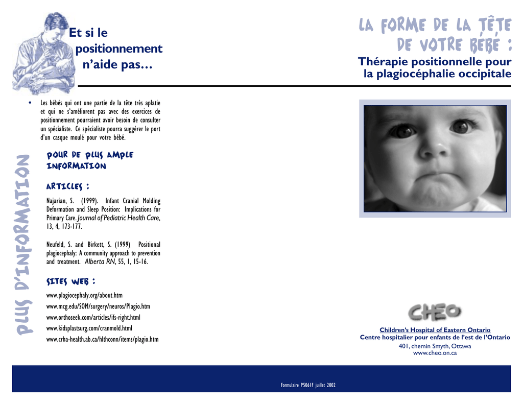 la forme de la tête de votre bébé : Et si le positionnement n’aide pas… plus d’information • Thérapie positionnelle pour la plagiocéphalie occipitale Les bébés qui ont une partie de la tête très aplatie et qui ne s’améliorent pas avec des exercices de positionnement pourraient avoir besoin de consulter un spécialiste. Ce spécialiste pourra suggérer le port d’un casque moulé pour votre bébé. Pour de plus ample information articles : Najarian, S. (1999). Infant Cranial Molding Deformation and Sleep Position: Implications for Primary Care. Journal of Pediatric Health Care, 13, 4, 173-177. Neufeld, S. and Birkett, S. (1999) Positional plagiocephaly: A community approach to prevention and treatment. Alberta RN, 55, 1, 15-16. sites web : www.plagiocephaly.org/about.htm www.mcg.edu/SOM/surgery/neuros/Plagio.htm www.orthoseek.com/articles/ifs-right.html www.kidsplastsurg.com/cranmold.html www.crha-health.ab.ca/hlthconn/items/plagio.htm Children’s Hospital of Eastern Ontario Centre hospitalier pour enfants de l’est de l’Ontario 401, chemin Smyth, Ottawa www.cheo.on.ca Formulaire P5061F juillet 2002 Pourquoi cela arrive-t-il ? Le taux du syndrome de mort subite du nourrison (SMSN), s’est diminué depuis que les parents font dormir les bébés sur le dos, tel que recommandé. Q’est ce que c’est ? Les bébés couchés dans la même position pendant une longue période, par exemple avec la tête tournée d’un côté, peuvent avoir un côté de la tête aplatie. Des difficultés peuvent se manifester étant donné que les os du crâne sont très mous jusqu’à l’âge d’un an. pourquoi pourquoi certains bébés ont un côté de la tête aplatie ? • • • • • La « plagiocéphalie positionnelle » est le terme médical désignant l’aplatissement d’un côté de la derrière de la tête et causé par le fait de se coucher dans la même position. Un côté aplati peut se développer rapidement pendant quelques semaines ou s’étendre sur plusieurs mois. Le bébé risque d’avoir une oreille décollée ainsi que des changements au visage sur le côté aplati de la tête. Les formes de têtes : vues d’au-dessus de la tête d’un bébé. La plagiocéphalie cause-t-elle des problèmes ? • Plagiocéphalie positionnelle Dan la plupart des cas, un côté de la tête aplatie ne nuira pas au développement psychologique ou mental du bébé. Cependant, une tête arrondie est préférable pour une apparence normale. Que puis-je faire si mon bébé a un côté de la tête aplatie ? • • • • Forme normale de la tête Certains bébés aiment se tourner la tête du même côté pendant leur sommeil ou lorsqu’ils s’assoient dans leur siège d’auto ou leur balançoire. Certains bébés naissent avec un côté de la tête aplatie qui s’explique par leur position dan l’utérus. Par exemple, les jumeaux n’ont pas autant d’espace pour changer de position. D’autres bébés gardent la tête d’un côté en raison d’un problème du muscle du cou appelé « torticolis ». Les os du crâne des bébés prématurés sont plus mous. • • • Les parents constatent souvent que la forme de la tête de leur bébé s’améliore rapidement lorsqu’ils placent leur bébé dans la position adéquate. Prenez note des moments où votre bébé est sur le côté aplati. Est-ce que cela survient : quand votre bébé dort ? quand vous tenez ou portez votre bébé ? quand votre bébé est dans le siège d’auto ou la balançoire ? quand votre bébé joue ? quand votre bébé est sur la table à langer ? autre _______________________ Que puis-je faire ? Que évitez de laisser votre bébé du côté aplati au tant que possible • Placez une petite couverture enroulée sous l’épaule de votre bébé, du même côté que la zone aplatie. Cela aidera votre bébé à se détourner la tête du côté aplati. • Déplacez le berceau de votre bébé pour détourner sa tête du côté aplati lorsqu’il regarde vers la porte. Placez les jouets et mobiles de façon que votre bébé tourne la tête du côté aplati. • Accordez-lui beaucoup de temps de jeu sous surveillance quand votre bébé est sur le ventre et le côté ou lorsqu’il est éveillé. Cela contribue à développer la force dans le cou, les épaules et les bras. Assurez-vous que votre bébé a des jouets qui encourageront le jeu sur le ventre et le côté. • Évitez d’exercer une pression sur le ôté aplati de la tête de votre bébé lorsque vous l’allaitez, le tenez ou le portez. • Évitez les longues périodes dans les sièges d’auto, les sièges de bébé et les balançoires où le bébé a la tête dans la même position. • Donnez-lui beaucoup de temps sous surveillance pour jouer dans un « Exersaucer » dès que votre bébé a une bon maintien de la tête. demandez à votre médecin d’évaluer le mouvement du cou de votre bébé • Si vous remarquez que votre bébé se tient la tête d’un côté ou qu’il a de la difficulté à se tourner la tête, il se peut que votre bébé ait besoin de faire des exercices d’étirement du cou. • Quand il y a un bon mouvement du cou, la tête sera remodelée plus facilement. • Votre médecin pourrait recommander des exercices pour bébés d’étirement du cou à la maison ou vous adresser à un (une) physiothérapeute. Si vous avez des questions, vous pouvez communiquer avec la ligne d’info-santé publique (pendant le jour) au (613) 724-4179 pour parler à une infirmière en santé publique.