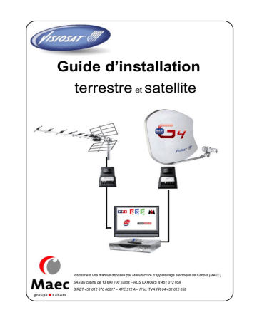 Guide d’installation terrestre et satellite Visiosat est une marque déposée par Manufacture d’appareillage électrique de Cahors (MAEC) SAS au capital de 13 643 700 Euros – RCS CAHORS B 451 012 058 SIRET 451 012 070 00017 – APE 312 A – N°id. TVA FR 64 451 012 058 SOMMAIRE Services Présentation générale page page 2 3 Réception satellite Antennes satellites Démodulateurs / terminaux satellites Accessoires page page page 4-5 6 6 Réception terrestre Antennes terrestres Accessoires page page 7 7 Distribution collective Station d’amplification terrestre page 7 page 7 page 8 page 9 page page page page page 10 11 12 11 13 Réception + amplification du terrestre page 14 Distribution collective SAT + Hz / 8 prises page 15 Catalogue Distribution SAT + Hz (4 à 12 prises) Schémas d’installations Réception terrestre Réception UHF + VHF Couplage terrestre / SAT + Couplage SAT + Hz sur 1 prise Réception satellite Réception 1 satellite sur 1 prise Réception 1 satellite sur 2 prises Réception 1 satellite sur 3/4 prises Réception 2 satellites numériques Réception 3 satellites analogique +numérique Installations collectives Visiosat: une marque de MAEC – Groupe CAHORS Initialement centré sur l'électrotechnique, le Groupe Cahors constitue aujourd'hui un ensemble industriel cohérent, articulé autour de quatre métiers principaux : •distribution / branchement / comptage électricité, gaz, eau •transformation HTA / BT •connectique HTA / BT •électronique de pointe / réception satellite Ces métiers s'additionnent et permettent au Groupe Cahors d'étudier, de concevoir en synergie des solutions globales et évolutives, pour optimiser la distribution des énergies et des fluides. 2 PRESENTATION GENERALE 15 ans de réception satellite Depuis 1989, Visiosat conçoit et fabrique des matériels de réception de haute qualité. Visiosat est aujourd'hui une marque de référence sur les marchés français et européens de la réception individuelle et collective. Visiosat propose une gamme complète et homogène : •Antennes en polyester renforcé de fibres de verre : SMC •Antennes métal (acier et aluminium) •Antennes hertziennes et leurs accessoires •Gamme complète pour la distribution collective •Récepteurs satellite analogiques •Terminaux satellite numériques •Accessoires pour la commutation DiSEqC® et divers supports. La garantie selon Visiosat Garantie constructeur de 10 ans: Visiosat s’engage dans le temps en offrant une garantie constructeur de 10 ans sur les réflecteurs de sa gamme d’antennes SMC (polyester renforcé de fibre de verre) Garantie de service: Soucieux d ’apporter un service de grande qualité, Visiosat est organisé pour répondre à tout type de sollicitation : Service Technique, Hotline, Ingénierie, Service Commercial et Service Après-Vente, l'ensemble du personnel est mobilisé et a su développer un partenariat étroit auprès des clients et fournisseurs. Le service apporté aux professionnels du métier de l’antenne reste l’objectif premier de Visiosat. Comment réaliser une installation satellite Emplacement de l’antenne: Le choix de l’emplacement de l’antenne doit être fait avant la réalisation de l’installation; les critères de choix sont les suivants: -Orientation plein SUD: les principaux satellites à recevoir sont au SUD, vérifier qu’il n’y ai pas d’obstacle devant l’antenne (mur, arbre…) - La fixation de l’antenne (mât, fixation murale …) doit être parfaitement verticale Montage de l’antenne: 1- Assembler la monture arrière de l’antenne 2- Assembler le LNB sur son support 3- Assembler le bras sur l’antenne 4 - Fixer le LNB et son support sur le bras 5 - Monter la pièce arrière sur le réflecteur de l’antenne 6 - Monter l’ensemble sur le support d ’antenne 1 Pointage de l’antenne: Le pointage de l’antenne s ’effectue étape par étape et il est INDISPENSABLE de respecter l’ordre de ces étapes: 1- Régler l’angle d’élévation sur la pièce arrière (cet angle varie en fonction du satellite choisi et du lieu de réception). Pour trouver le bon angle vous pouvez vous référer à la carte d’élévation fournie avec chaque antenne. 2- Orienter l’antenne vers le SUD à l’aide d’une boussole 3- Raccorder le LNB soit au mesureur de champs, soit au POINTE SAT PRO et au démodulateur satellite (mis sous tension et raccordé au TV) 4- Faire pivoter l’antenne autour du bras jusqu’à obtention de signaux désirés (ou directement l’image sur le TV); ajuster finement la position. 5- Réajuster si nécessaire l’élévation 6- Serrer correctement toutes les vis de réglages et de fixations. 2–3-4 1 5 2-3 4 3 RECEPTION SATELLITE Antennes satellites en polyester renforcé de fibre de verre SMC ANT E65 MS UNI Recommandée pour la réception de ASTRA 19.2°E et HOTBIRD 13°E H= 68.2 cm / L =61 cm Poids (env.) 6 Kg Équipée de 1 x LNB UNI Pour 1 prise (schémas en page 10) ANT E80 MS UNI réf. VII0140263 Recommandée pour la réception des chaînes nationales sur le satellite AtlanticBird 3 (5° Ouest) H= 81 cm / L =75 cm Poids (env.) 7 Kg Équipée de 1 x LNB UNI Pour 1 prise (schémas en page 10) Pour 2 prises (schémas en page 11) Pour 3-4 prises (schémas en page 12) réf. VII0140408 ANT E100 MS QUATTRO Recommandée pour réaliser des installations collectives H= 103 cm / L =90 cm Poids (env.) 9 Kg Équipée de 1 x LNB QUATTRO (collectif) IAL C E SP ECTIF L COL réf. VII0140828 LNBs / Convertisseurs de fréquence Les antennes satellites peuvent être équipées avec des LNBs à plusieurs sorties pour réaliser des installations sur plusieurs prises 1 sorties LNB SINGLE- 1 sortie (schémas en page 10) 2 sorties LNB TWIN- 2 sorties (schémas en page 11) réf. VII0914451 réf. VII0914313 2 à 4 prises satellites 3/4 sorties 4 (schémas en page 12) LNB QUAD- 4 sorties réf. VII0914462 RECEPTION SATELLITE satellites en polyester renforcé de fibre de 