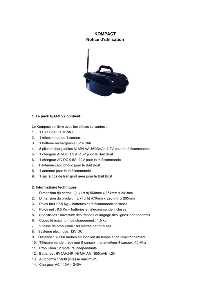 KOMPACT Notice d’utilisation 1. Le pack QUAD V2 contient : Le Kompact est livré avec les pièces suivantes : 1. 1 Bait Boat KOMPACT 2. 1 télécommande 4 canaux 3. 1 batterie rechargeable 6V 4.0Ah 4. 8 piles rechargeables Ni-MH AA 1500mAh 1.2V pour la télécommande 5. 1 chargeur AC-DC 1.2 A -15V pour le Bait Boat 6. 1 chargeur AC-DC 0.5A -12V pour la télécommande 7. 1 antenne caoutchouc pour le Bait Boat 8. 1 antenne pour la télécommande 9. 1 sac à dos de transport aéré pour le Bait Boat 2. Informations techniques 1. Dimension du carton : (L x l x h) 568mm x 354mm x 241mm 2. Dimension du produit : (L x l x h) 470mm x 320 mm x 205mm 3. Poids brut : 7.5 Kg – batteries et télécommande incluses 4. Poids net : 6.5 Kg – batteries et télécommande incluses 5. Spécificités : ouverture des trappes et largage des lignes indépendants 6. Capacité maximum de chargement : 1.5 kg 7. Vitesse de propulsion : 80 mètres par minutes 8. Système électrique: 12V DC 9. Distance :+/- 500 mètres en fonction du temps et de l’environnement. 10. Télécommande : receveur 6 canaux, transmetteur 4 canaux, 40 Mhz 11. Propulsion : 2 moteurs indépendants 12. Batteries : 6V4AH/HR, Ni-MH AA 1500mAh 1.2V 13. Autonomie : 1h30 (vitesse maximum) 14. Chargeur AC 110V – 240V 3. Utilisation 1. Connecter l’antenne du bateau et l’antenne de la télécommande. L’antenne du bateau est recouverte de caoutchouc et l’antenne télescopique de la télécommande est en métal. 2. Placer les accus à l’arrière de la télécommande et refermer le compartiment. Allumer la télécommande et repérer les différentes opérations. Les différentes actions possibles avec la télécommande sont détaillées sur le schéma ci-dessous : A. Balance des moteurs : permet d’ajuster la vitesse des deux moteurs de manière à maintenir la direction rectiligne. Il est possible que votre bateau n’aille pas totalement droit, en raison du vent, du mouvement de l’eau ou de la répartition de la charge. Le réglage moteur (trim) situé en haut à gauche de votre télécommande permettra de corriger ce problème. Il est nécessaire de faire ce réglage avant d’avancer à pleine puissance. - Tournez le bouton vers la gauche, le bateau ira plus à gauche. - Tournez le bouton vers la droite, le bateau ira plus à droite. B. Indicateur d’allumage des lumières. Le bateau peut être utilisé lorsque l’indicateur est rouge. A faible puissance l’indicateur clignote en rouge et émet une alarme. Il est alors important de faire revenir le bateau dès que l’indicateur se met à clignoter. C/F. D. Ajustement de l’ouverture des trappes et du largage des lignes. Réglage de la vitesse du bateau. Tourner la molette vers le haut permet d’augmenter la vitesse, tourner la molette permet de ralentir le bateau. E/H Joystick télécommande La partie gauche de la télécommande contrôle l’ouverture des trappes et le largage des lignes : - Pour ouvrir la trappe : poussez le Joystick gauche à gauche - Pour lâcher la ligne: poussez le Joystick gauche en haut ou en bas. La partie droite de la télécommande contrôle la direction du bateau. - Pour la marche avant : poussez le Joystick droit vers l’avant. - Pour la marche arrière : poussez le Joystick droit vers l’arrière. - Pour tourner à gauche : poussez le Joystick droit à gauche - Pour tourner à droite : poussez le Joystick droit à droite. G. L’antenne télescopique de la télécommande est divisée en 7 sections. Déployer l’antenne pendant l’utilisation du bateau pour obtenir une meilleure réception du signal. I. Accroche, permet de passer une lanière au cou ou au poignet de manière à faciliter les opérations. J. Ajustement de la vitesse des moteurs. Tourner la molette vers la droite ralenti le moteur droit et augmente la vitesse du moteur gauche, tourner la molette vers la gauche ralenti le moteur gauche et augmente la vitesse du moteur droit. K. Bouton ON/OFF de la télécommande. 3/ Actionner l’interrupteur du bateau après avoir identifié les différentes fonctions. (voir schéma ci-dessous). A/G. Feux de positionnement frontaux. Permet de repérer et de visualiser le bateau lorsqu’il est au large. Lumière de couleur blanche. B/H. Compartiment pour les accus. C/M. Une lumière bleue claire indique que le bateau reçoit les informations de la télécommande. Les lumières clignotent lorsque le signal est instable ou qu’il est perturbé par un élément extérieur. D. Lumières indicatrices de la capacité de charge des batteries. (rouge à droite, verte à gauche). La batterie est chargée au maximum lorsque les deux lumières sont allumées. La batterie nécessite d’être chargée lorsque les lumières clignotent en rouge. Faire revenir le bateau et charger les batteries. La charge est complète lorsque la lumière verte s’allume. E/P. Protège hélice. Limite l’entrée d’algues ou autres éléments dans le système de propulsion du bateau. F. Système de largage permet de stocker les bouillettes et de larguer les appâts et les lignes à l’ endroit désiré. Tout type d’appât peut être utilisé avec ce système. I. Trappe pour le largage des appâts, permet de stocker les appâts et de les larguer à l’endroit désiré. Capacité maximum de la trappe 1.5 Kilos. Tout type d’appât peut être utilisé (maïs, blé, appâts professionnels). J. Vérifier avant utilisation la communication entre la télécommande et le bateau. K. Switch ON/OFF L. Prise de charge : cette prise produit du courant 12V pouvant alimenter un eco-sondeur ou d’autres accessoires. N. Lumière de fonctionnement : indique fonctionnement du largage de ligne. Lumière blanche clignotante accélérée lorsque l’action de largage est en cours. O. Lumière de fonctionnement : indique fonctionnement d’ouverture de trappe. Lumière bleue clignotante accélérée lorsque l’ouverture de la trappe est en cours. Maintenance chargeurs et batteries Not