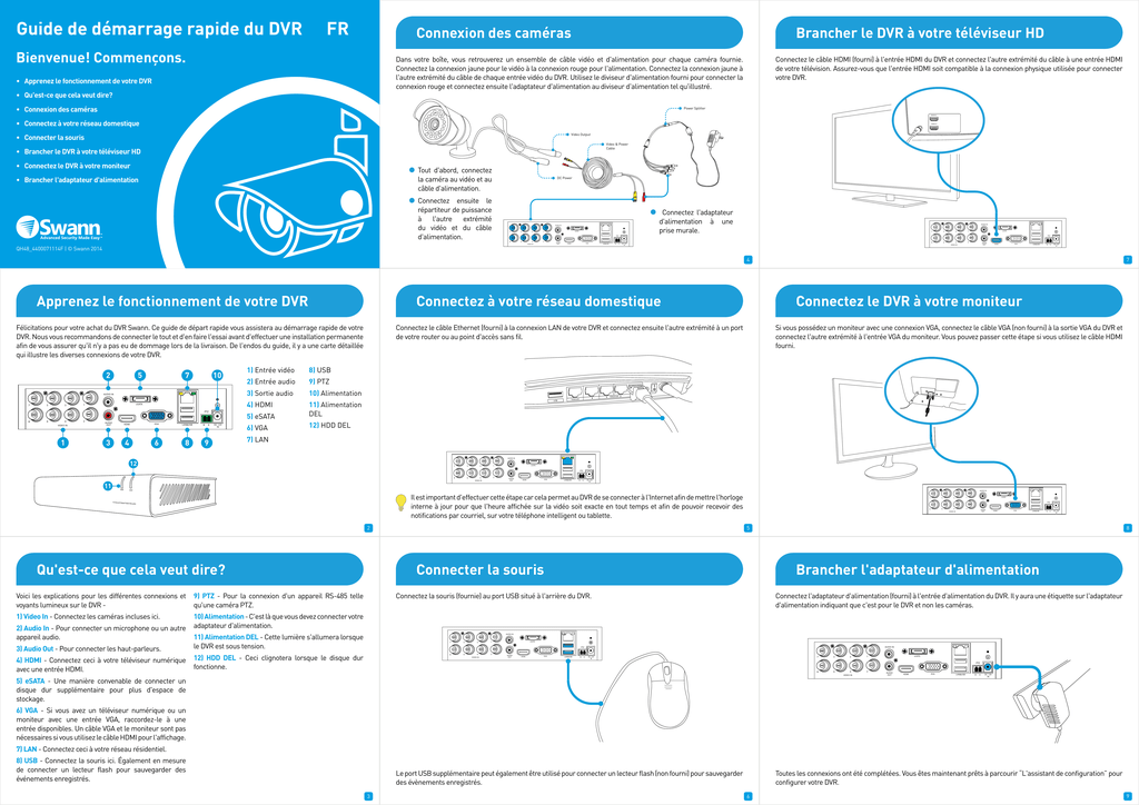 Guide de démarrage rapide du DVR FR Connexion des caméras Bienvenue! Commençons. Brancher le DVR à votre téléviseur HD Dans votre boîte, vous retrouverez un ensemble de câble vidéo et d'alimentation pour chaque caméra fournie. Connectez la connexion jaune pour le vidéo à la connexion rouge pour l'alimentation. Connectez la connexion jaune à l'autre extrémité du câble de chaque entrée vidéo du DVR. Utilisez le diviseur d'alimentation fourni pour connecter la connexion rouge et connectez ensuite l'adaptateur d'alimentation au diviseur d'alimentation tel qu'illustré. • Apprenez le fonctionnement de votre DVR • Qu'est-ce que cela veut dire? • Connexion des caméras Connectez le câble HDMI (fourni) à l'entrée HDMI du DVR et connectez l'autre extrémité du câble à une entrée HDMI de votre télévision. Assurez-vous que l'entrée HDMI soit compatible à la connexion physique utilisée pour connecter votre DVR. Power Splitter HDMI IN 2 • Connectez à votre réseau domestique HDMI IN 1 • Connecter la souris Video Output Video & Power Cable • Brancher le DVR à votre téléviseur HD • Connectez le DVR à votre moniteur Tout d'abord, connectez la caméra au vidéo et au câble d'alimentation. • Brancher l'adaptateur d'alimentation DC Power Connectez ensuite le répartiteur de puissance à l'autre extrémité du vidéo et du câble d'alimentation. Connectez l'adaptateur d'alimentation à une prise murale. AUDIO IN 7 5 3 eSATA 1 8 6 4 QH48_4400071114F | © Swann 2014 2 AUDIO OUT 2 5 10 7 VGA HDMI LAN&USB B A DC 12V IN AUDIO IN 7 5 3 eSATA 1 PTZ 8 6 4 2 VIDEO IN AUDIO OUT HDMI VGA LAN&USB 1 3 4 6 8 B A 8) USB 2) Entrée audio 9) PTZ 3) Sortie audio 10) Alimentation 4) HDMI 11) Alimentation DEL 5) eSATA DC 12V IN 9 6) VGA 3 1 8 6 4 2 eSATA AUDIO OUT VIDEO IN VGA HDMI LAN&USB B A DC 12V IN 2 4 Connectez à votre réseau domestique 1) Entrée vidéo 5 PTZ 1 Félicitations pour votre achat du DVR Swann. Ce guide de départ rapide vous assistera au démarrage rapide de votre DVR. Nous vous recommandons de connecter le tout et d'en faire l'essai avant d'effectuer une installation permanente afin de vous assurer qu'il n'y a pas eu de dommage lors de la livraison. De l'endos du guide, il y a une carte détaillée qui illustre les diverses connexions de votre DVR. 7 PTZ VIDEO IN Apprenez le fonctionnement de votre DVR AUDIO IN Connectez le DVR à votre moniteur Si vous possédez un moniteur avec une connexion VGA, connectez le câble VGA (non fourni) à la sortie VGA du DVR et connectez l'autre extrémité à l'entrée VGA du moniteur. Vous pouvez passer cette étape si vous utilisez le câble HDMI fourni. Connectez le câble Ethernet (fourni) à la connexion LAN de votre DVR et connectez ensuite l'autre extrémité à un port de votre router ou au point d'accès sans fil. 4 Inte rnet USB 3 7 3 Ethe rnet 2 12) HDD DEL 7) LAN AUDIO IN 12 5 7 eSATA 1 3 PTZ 6 8 11 2 4 VIDEO IN PWR 8 Channel Digital Video AUDIO OUT VGA HDMI LAN&USB B DC 12V IN A HDD Il est important d'effectuer cette étape car cela permet au DVR de se connecter à l'Internet afin de mettre l'horloge interne à jour pour que l'heure affichée sur la vidéo soit exacte en tout temps et afin de pouvoir recevoir des notifications par courriel, sur votre téléphone intelligent ou tablette. Recorder 4 2 Qu'est-ce que cela veut dire? Voici les explications pour les différentes connexions et voyants lumineux sur le DVR - 9) PTZ - Pour la connexion d'un appareil RS-485 telle qu'une caméra PTZ. 1) Video In - Connectez les caméras incluses ici. 10) Alimentation - C'est là que vous devez connecter votre adaptateur d'alimentation. 2) Audio In - Pour connecter un microphone ou un autre appareil audio. 3) Audio Out - Pour connecter les haut-parleurs. 4) HDMI - Connectez ceci à votre téléviseur numérique avec une entrée HDMI. AUDIO IN 5 3 1 8 6 4 2 eSATA PTZ AUDIO OUT VIDEO IN HDMI VGA LAN&USB B A DC 12V IN 5 Connecter la souris 6 8 Brancher l'adaptateur d'alimentation Connectez la souris (fournie) au port USB situé à l'arrière du DVR. 11) Alimentation DEL - Cette lumière s'allumera lorsque le DVR est sous tension. 7 Connectez l'adaptateur d'alimentation (fourni) à l'entrée d'alimentation du DVR. Il y aura une étiquette sur l'adaptateur d'alimentation indiquant que c'est pour le DVR et non les caméras. AUDIO IN 7 5 3 eSATA 1 AUDIO IN PTZ 12) HDD DEL - Ceci clignotera lorsque le disque dur fonctionne. 8 6 4 VIDEO IN 2 AUDIO OUT HDMI VGA LAN&USB B A 7 DC 12V IN 5 3 eSATA 1 PTZ 8 6 4 VIDEO IN 5) eSATA - Une manière convenable de connecter un disque dur supplémentaire pour plus d'espace de stockage. 2 AUDIO OUT HDMI VGA LAN&USB B A DC 12V IN 6) VGA - Si vous avez un téléviseur numérique ou un moniteur avec une entrée VGA, raccordez-le à une entrée disponibles. Un câble VGA et le moniteur sont pas nécessaires si vous utilisez le câble HDMI pour l'affichage. 7) LAN - Connectez ceci à votre réseau résidentiel. 8) USB - Connectez la souris ici. Également en mesure de connecter un lecteur flash pour sauvegarder des événements enregistrés. Toutes les connexions ont été complétées. Vous êtes maintenant prêts à parcourir “L'assistant de configuration” pour configurer votre DVR. Le port USB supplémentaire peut également être utilisé pour connecter un lecteur flash (non fourni) pour sauvegarder des évènements enregistrés. 7 3 8 6 9 À quoi servent les connexions supplémentaires? Entrée audio - Pour connecter un microphone ou un autre appareil audio. Sortie audio - Pour connecter les haut-parleurs. eSATA - Une manière convenable de connecter un disque dur supplémentaire pour plus d'espace de stockage. HDMI IN 2 HDMI IN 1 Connectez la connexion jaune à l'autre extrémité du câble de chaque entrée vidéo de votre DVR. PTZ - Pour la connexion d'un appareil RS-485 telle qu'une caméra PTZ. Diviseur de puissance Sortie vidéo Câble Vidéo & Power 2 10 11 Connectez l'appareil pho
