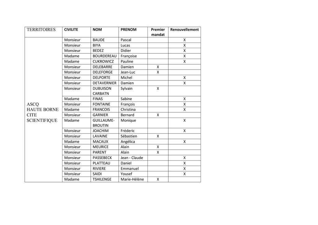 TERRITOIRES ASCQ HAUTE BORNE CITE SCIENTIFIQUE CIVILITE NOM PRENOM Monsieur Monsieur Monsieur Madame Madame Monsieur Monsieur Monsieur Monsieur Monsieur BAUDE BIYA BEDEZ BOURDEREAU CUKROWICZ DELEBARRE DELEFORGE DELPORTE DETAVERNIER DUBUISON CARBATN FINAS FONTAINE FRANCOIS GARNIER GUILLAUMEBROUTIN JOACHIM LAVAINE MACAUX MEURICE PARENT PASSEBECK PLATTEAU RIVIERE SAIDI TSHILENGE Pascal Lucas Didier Françoise Pauline Damien Jean-Luc Michel Damien Sylvain Madame Monsieur Madame Monsieur Madame Monsieur Monsieur Madame Monsieur Monsieur Monsieur Monsieur Monsieur Monsieur Madame Sabine François Christina Bernard Monique Fréderic Sébastien Angélica Alain Alain Jean - Claude Daniel Emmanuel Yousef Marie-Hélène Premier mandat Renouvellement X X X X X X X X X X X X X X X X X X X X X X X X X