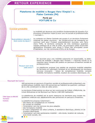 RETOUR FICHE EXPERIENCE DU RESE Des activités solidaires Plateforme de mobilitéfluviales « Bougez Vers l’Emploi ! ». Plaine Centrale (94)rapprocher pour et écologiques par les citoyensPorté de leurs cours d’eau VOITURE & Co L’association Au Fil de l’eau est néepréalable en 1982 sur un concept de Constat randonnée batelière, avec des La mobilité est devenue une condition fondamentale de réussite d’un embarcations écologiques processus d’insertion visant à avoir une vie sociale et professionnelle « normale - les Puces d’eau, mues par ». des moyens de propulsion Le contexte sur Plaine Centrale est propre à un territoire fortement Quel problème à résoudre ? urbanisé de petite couronne : les infrastructures de transports en naturelle godille). Quel constat de (voile, départ ? aviron, commun sont pour l’instant essentiellement tournées vers Paris Portée par des valeurs d’éducation (hors TVM), le territoire comporte de très nombreux quartiers populaire de « vivre et politique de la ville et enfin, les principaux pôles d’activités classés générateurs d’emplois sont situés à l’écart des principales zones faire ensemble », l’association d’habitation, sur les communes d’Orly et de Rungis. s’est développée sur l’Est parisien en approfondissant sa connaissance du territoire Finalités et en diversifiant ses activités En œuvrant pour une mobilité autonome et responsable, la plateautour de l’eau. forme de mobilité « Bougez Vers l’Emploi ! » favorise l’accès ou le Pourquoi avoir mené cette action ? maintien dans l’emploi des publics en parcours d’insertion sociale et professionnelle. Points Forts Balade fluviale à bord d’une catalante La plateforme propose une palette de solutions mobilité adaptées au territoire en valorisant l’existant et en développant de nouveaux Une approche globale services innovants : bilans de compétences mobilité, conseils mobilité, formations mobilité, location de scooters électriques, etc. des cours d’eau et de leur environnement pour en favoriser la préservation et une appropriation par tous. Un projet associatif inscrit dans une démarche solidaire et soutenable Dans ce milieu où chaque action menée par l’homme a desrépercussions, l’environnement est pris en compte Des activités créatrices 400 personnes en parcours d’insertion et professionnelle uneinstitutiondanssociale toutesses dimensions :présentant écologique, problématique mobilité, dont 200 personnes qui habitent les quartiers politique d‘emploi, respectueuses nelle, sociale, économique, sociétale, culturelle, etc. de la ville constituent la cible de cette action. de l’environnement L’activité de découverte et devalorisation menée par Au Fil de l’eau sur la boucle avale de la Marne, dite et des hommes. Le territoire d’intervention se situe sur les communes de Créteil, d’Alfortville, de boucle de Saint-Maur, en constitue un parfait exemLimeil-Brévannes et de Bonneuil-sur-Marne (180 000 habitants). ple. Le développement d’un Descriptif de l’action tourisme La plateforme de mobilité est le point ressource du territoire pour toutes les Pourdes despersonnes questionsende sécurité, cette portion est en aux déplacements parcours d’insertion. fluvialquestions solidairerelatives et durable. partie interditeà la navigation avec la présence du barLa plateforme propose notammentrage : de Joinville. Dernier segment naturel de la Marne avant sa confluence avec la Seine, cette interdiction • des bilans de compétences en mobilité • du conseil en mobilité permet de préserver les îles, patrimoine • l’orientation vers les services lesnaturel plus adaptés d’exception. Cible (types et effectif) Territoire Contenu • des formations mobilité • la mise à disposition de vélos (urbains, à assistance électrique, pliants) et de scooters électriques • l’orientation vers des partenaires mobilité : vélo-école, location de voitures, auto-école sociale, etc. fluviales solidaires pour rapprocher et écologiques Comment avez-vous procéder ? Des activités Modalités opérationnelles Quelles ont été les étapes ? les citoyens de leurs cours d’eau Quels sont les moyens humains, techniques (outils) et financiers ? Les publics sont orientés sur la plateforme à partir d’une fiche de L’association Auliaison Fil deadressée l’eau estaux conseillers mobilité par des prescripteurs. Ces née en 1982 suracteurs un concept de prescripteurs sont les de l’insertion socialerandonnée et professionnelle du territoire et sont batelière, avec des pleinement associés au fonctionnement général embarcations écologiques de la plateforme. - les d’eau, muesde par A partir desPuces premiers éléments diagnostic qu’ils des reçoivent, les conseillers moyens de propulsion mobilité procèdent systématiquement à un bilan de naturelle aviron, godille). compétences qui (voile, permet de travailler sur les 5 pointsPortée suivantspar : des valeurs d’éducation • les habitudes de la vie quotidienne populaire de « vivre et • les capacités physiques et cognitives faire ensemble • les aptitudes urbaines », l’association • les aptitudes routières sur l’Est s’est développée • les moyens logistiques à disposition. parisien en approfondissant Ce bilan permet d’identifier besoins et les sa connaissance dules territoire compétences en mobilité des bénéficiaires, et en diversifiant ses activités mais également de définir précisément diverses autour de l’eau.telles que : la carte variables de mobilité mentale, la carte professionnelle, la fréquence de mobilité, la motivation à être mobile et les potentialités. Le conseil mobilité est la résultante naturelle et immédiate du bilan de compétences. Il aiguille le bénéficiaire sur la voie de l’autonomie. Il peut se suffire à lui-même mais nécessite souvent un accompagnement matériel 
