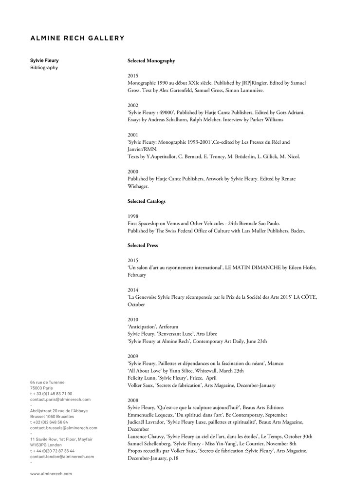 Sylvie Fleury Selected Monography Bibliography 2015 Monographie 1990 au début XXIe siècle. Published by JRP|Ringier. Edited by Samuel Gross. Text by Alex Gartenfeld, Samuel Gross, Simon Lamunière. 2002 ‘Sylvie Fleury : 49000’, Published by Hatje Cantz Publishers, Edited by Gotz Adriani. Essays by Andreas Schalhorn, Ralph Melcher. Interview by Parker Williams 2001 ‘Sylvie Fleury: Monographie 1993-2001’.Co-edited by Les Presses du Réel and Janvier/RMN. Texts by Y.Aupetitallot, C. Bernard, E. Troncy, M. Brüderlin, L. Gillick, M. Nicol. 2000 Published by Hatje Cantz Publishers, Artwork by Sylvie Fleury. Edited by Renate Wiehager. Selected Catalogs 1998 First Spaceship on Venus and Other Vehicules - 24th Biennale Sao Paulo. Published by The Swiss Federal Office of Culture with Lars Muller Publishers, Baden. Selected Press 2015 ‘Un salon d’art au rayonnement international’, LE MATIN DIMANCHE by Eileen Hofer, February 2014 ‘La Genevoise Sylvie Fleury récompensée par le Prix de la Société des Arts 2015’ LA CÔTE, October 2010 ‘Anticipation’, Artforum Sylvie Fleury, ‘Renversant Luxe’, Arts Libre ‘Sylvie Fleury at Almine Rech’, Contemporary Art Daily, June 23th 64 rue de Turenne 75003 Paris t + 33 (0)1 45 83 71 90 [email protected] Abdijstraat 20 rue de l’Abbaye Brussel 1050 Bruxelles t +32 (0)2 648 56 84 [email protected] 11 Savile Row, 1st Floor, Mayfair W1S3PG London t + 44 (0)20 72 87 36 44 [email protected] www.alminerech.com 2009 ‘Sylvie Fleury, Paillettes et dépendances ou la fascination du néant’, Mamco ‘All About Love’ by Yann Siliec, Whitewall, March 23th Felicity Lunn, ‘Sylvie Fleury’, Frieze, April Volker Saux, ‘Secrets de fabrication’, Arts Magazine, December-January 2008 Sylvie Fleury, ‘Qu’est-ce que la sculpture aujourd’hui?’, Beaux Arts Editions Emmenuelle Lequeux, ‘Du spirituel dans l’art’, Be Contemporary, September Judicaël Lavrador, ‘Sylvie Fleury Luxe, paillettes et spiritualité’, Beaux Arts Magazine, December Laurence Chauvy, ‘Sylvie Fleury au ciel de l’art, dans les étoiles’, Le Temps, October 30th Samuel Schellenberg, ‘Sylvie Fleury - Miss Yin-Yang’, Le Courrier, November 8th Propos recueillis par Volker Saux, ‘Secrets de fabrication :Sylvie Fleury’, Arts Magazine, December-January, p.18 ‘Paillettes et dépendances ou la fascination du Néant’, Dossier de presse (MAMCO, Genève, Suisse) avec un texte d'Eric Troncy Nicole Büsing & Heiko Klaas, 'Sylvie Fleury', Art Investor, December, p.98-103 Gauthier Huber, ‘Sylvie Fleury, grand destockage’, Kunst-Bulletin, December Jean-Max Colard, ‘Agent provocateur’, Les Inrockuptibles, November 13th Leoni Hof, ‘Leben ist meine älteste Passion’, Bolero, November, p.30-36 Laurence Chauvy, 'Sylvie Fleury, au ciel de l'art, dans les étoiles', Le Temps, October 30th, p.38 Manou Farine, 'Sylvie Fleury’, Elle Magazine, October 27th Laurence Chauvy, 'Sylvie Fleury fleurit le MAMCO’, Le Temps (sortir), October 23th, p.20 Mireille Descombres, 'Voyage au pays de Sylvie Fleury', L’hebdo, October 23th Stéphanie Moisdon, ‘Sylvie Fleury’, Beaux-Arts Magazine, n°Hors-Série: ‘Qu'est ce que l'art vidéo aujourd'hui?’, p.92-93 2007 Pleins Phare, Art contemporain et automobile, Musée national de l’automobile de Mulhouse, Ed. Hazan Renate Wiehager, ‘Minimalism and After’, DaimlerChrysler AG, Hatje Cantz Verlag, p.248-249 2006 Kania, Elke, Spieler, Reinhard (ed.), ‘The sublime is Now! Das Erhabene in der zeitgenössischen Kunst’, Museum Franz Gertsch, Burgdorf, p. 79, 92-93 2005 Esmailzadeh, Katharina (ed.), ‘artgames – Analogien zwischen Kunst und Spiel’, Ludwig Forum für Internationale Kunst, p. 40-41 Mizunuma, Hirokazu (ed.), ‘Talking About the Real World. Contemporary Swiss Art’, Chiba City Museum of Art, p. 35-48 2002 Grosenick Uta, Riemschneider Burkhard (ed.), ‘ART NOW. 137 artists at the Rise of the New Millenium’, Cologne: Taschen, p. 152-155, ill. 2001 Verena Kuni, ‘Sylvie Fleury’, Frieze.com, Issue 63, November-December Sylvie Fleury, 'L’insolence dernier cri', Beaux-Arts Magazine, November, p.66-71 Musée d'art moderne et contemporain de Genève, Mamco/le Magasin– Centre national d'Art contemporain, Grenoble (ed.), ‘Sylvie Fleury. Identity Pain Astral Projection’, Lyon: les presses du réel/janvier/rmn, 64 rue de Turenne 75003 Paris t + 33 (0)1 45 83 71 90 [email protected] Abdijstraat 20 rue de l’Abbaye Brussel 1050 Bruxelles t +32 (0)2 648 56 84 [email protected] 11 Savile Row, 1st Floor, Mayfair W1S3PG London t + 44 (0)20 72 87 36 44 [email protected] www.alminerech.com 2001 Museum für Neue Kunst/ZKM Karlsruhe (ed.), S.F. 49000 [texts by Ralph Melcher, Andreas Schallhorn and Parker Williams], Ostfildern-Ruit: Cantz, ill. (exh. cat.) Grosenick, Uta (ed.), ‘Women artists. Künstlerinnen im 20. und 21. Jahrhundert’, Cologne, London, Madrid, New York, Paris, Tokyo: Taschen, pp. 132-137, ill. Bovier, Lionel (ed.), Across/Art/Suisse/1975-2000/, Milan/Geneva: Skira editore, pp. 133ff, ill. DaimlerChrysler AG, Kunstbesitz (ed.), Sammlung DaimlerChrysler. Neuerwerbungen / New Acquisitions, [text by Renate Wiehager], Berlin: DaimlerChrysler AG, Kunstbesitz, p. 16-17, ill. (exh. brochure) Fiori, Maria Teresa, ‘Milano Europa 2000. Fine Secolo. I semi del futuro, Milano: Electa’, p. 110-111, ill. Die Sterntaler, in: clariant. Chemie und Lifestyle, Muttenz/CH: Clariant International AG, no. 2, 2001, pp. 42-45, ill. Siedenberg, Sven, Potenzrituale und Meditationsmusik, Spiegel Online, June 5th 2000 Buck, Louisa, ‘Moving Targets 2. A ‘User's Guide to British Art Now’’, London: Tate Publishing Nemitz, Barbara, ‘trans ' plant. Living vegetation in contemporary art’, Ostfildern-Ruit: Hatje Cantz Publishers, ill. Romano, Gianni (ed.), Premio Michetti, Europa / Differenti Prospettivi Nella Pittura, Francavilla al Mare: Giancarlo Politi Editore, pp. 166-167, ill. (exh. cat.) Br