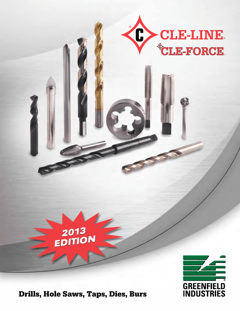 2013 EDITION Drills, Hole Saws, Taps, Dies, Burs Catalog Contents Drills . . . . . . . . . . . . . . . . Hole Saws . . . . . . . . . . . Taps and Dies . . . . . . . . Burs . . . . . . . . . . . . . . . . Index by EDP Number . . Index by Style Number . . . . . . . . . . . . . . . . . . . . . . . . . . . . . . pages 1-67 . . . . 68-69 . . . . 70-90 . . . . 91-98 . . . 99-113 . . . . . 113 Cle-Line is a familiar name to users of quality cutting tools. Cle-Line cutting tools have been manufactured for decades specifically for the construction, maintenance, repair, operating, and industrial markets. This Cle-Line catalog gives you all the tools you need to keep industry working. A wide selection of high-quality drills, hole saws, taps, dies, and burs have been brought together to give you one complete resource for purchasing cutting tools. You can shop this catalog with confidence knowing the high standards of quality and service that come from Cle-Line. Cle-Line tools are sold exclusively through a network of industrial distributors. When you contact your distributor, request Cle-Line for your everyday applications. The Cle-Force tools featured in this catalog deliver outstanding quality at a value price. They are made from top grade materials in modern, technologically advanced factories. From mining the ore to smelting the steel, to manufacturing the blanks, to final fabrication, these tools undergo stringent quality testing at every step of production. Ask your Cle-Line distributor for Cle-Force drills and taps. We’re sure you will be impressed with their performance, durability, and value. Metalcutting Safety (read this before using CLE-LINE and CLE-FORCE products) Modern metalcutting operations involve high energy, high spindle or cutter speeds, and high temperatures and cutting forces. Hot, flying chips may be projected from the workpiece during metalcutting. Although advanced cutting tool materials are designed and manufactured to withstand the high cutting forces and temperatures that normally occur in these operations, they are susceptible to fragmenting in service, particularly if they are subjected to over-stress, severe impact or otherwise abused. Therefore, precautions should be taken to adequately protect workers, observers and equipment against hot, flying chips, fragmented cutting tools, broken workpieces or other similar projectiles. Machines should be fully guarded and personal protective equipment should be used at all times. When grinding advanced cutting tool materials, a suitable means for collection and disposal of dust, mist or sludge should be provided. Overexposure to dust or mist containing metallic particles can be hazardous to health particularly if exposure continues over an extended period of time and may cause eye, skin and mucous membrane irritation and temporary or permanent respiratory disease. Certain existing pulmonary and skin conditions may be aggravated by exposure to dust or mist. Adequate ventilation, respiratory protection and eye protection should be provided when grinding and workers should avoid breathing of and prolonged skin contact with dust or mist. General Industry Safety and Health Regulations, Part 1910, U.S. Department of Labor, published in Title 29 of the Code of Federal Regulations should be consulted. Obtain from CLE-LINE/CLE-FORCE and read the applicable Material Safety Data Sheet before grinding. Cutting tools are only one part of the worker-machinetool system. Many variables exist in machining operations, including the metal removal rate; the workpiece size, shape, strength and rigidity; the chucking and fixturing; the load carrying capability of centers; the cutter and spindle speed and torque limitations; the holder and boring bar overhang; the available power; and the condition of the tooling and the machine. A safe metalcutting operation must take all of these variables, and others, into consideration. CLE-LINE/CLE-FORCE has no control over the end use of its products or the environment into which those products are placed. CLE-LINE/CLE-FORCE urges that its customers adhere to the recommended standards of use of their metalcutting operations. The information included throughout this catalog under the heading “Technical Data” and other recommendations on machining practices referred to herein are only advisory in nature and do not constitute representations or warranties and are not necessarily appropriate for any particular work environment or application. Drills 135° point, black & gold . . . . . . . . . . . . . . . . . . . 135° point, left-hand spiral, black & gold . . . . . . 3/8" reduced shank, 135° point, black & gold . . . cobalt, 135° point, left-hand spiral, straw finish . 22-23 . . 22 . . 23 . . 23 Screw Machine Length Drills 1896 heavy duty, 135° split point, black oxide . . . . . . . 24-27 Extra Length Drills 1803 1805 1806 1807 6” aircraft ext type, 135° split point, black oxide . . 28-29 12” aircraft ext type, 135° split point, black oxide . 28-29 12” extra length, 118° notched point, black oxide . . 30 18” extra length, 118° notched point, black oxide . . 30 Taper Shank Drills 1894 tanged, taper shank, 118° point, black oxide . . . . 31-32 Silver & Deming Reduced Shank Drills 1813 1892 1877 1877M 1/2” red round shank, 118° point, black . . . . . . . 33-34 1/2” red shank w/flats, 118° point, black . . . . . . 33-34 1/2” red shank w/flats, 118° split pt, black & gold . 33-34 1/2" red shank w/flate, 118° split pt, metric, blk . . 34 StylePage Number Description Number Jobber Length 1600 1601 1606 1602 1604 1605 1607 1603 general purpose, black oxide . . . . . . . . . . . . . general purpose, bright finish . . . . . . . . . . . . metric general purpose, black oxide . . . . . . . . heavy duty, black oxide . . . . . . . . . . . . . . . . . heavy duty, black & gold . . . . . . . . . . . . . . . . 3/8" reduced shank, heavy duty black & gold heavy duty, black & gold with flats on shank . c