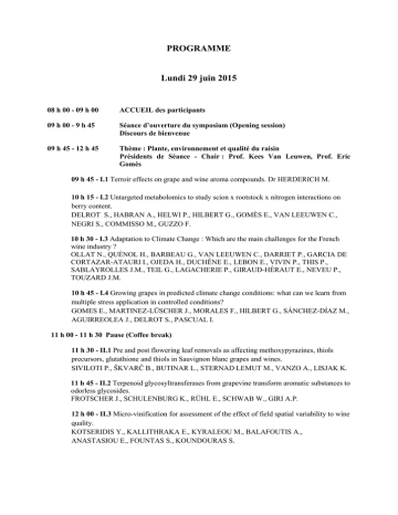 PROGRAMME Lundi 29 juin 2015 08 h 00 - 09 h 00 ACCUEIL des participants 09 h 00 - 9 h 45 Séance d’ouverture du symposium (Opening session) Discours de bienvenue 09 h 45 - 12 h 45 Thème : Plante, environnement et qualité du raisin Présidents de Séance - Chair : Prof. Kees Van Leuwen, Prof. Eric Gomès 09 h 45 - I.1 Terroir effects on grape and wine aroma compounds. Dr HERDERICH M. 10 h 15 - I.2 Untargeted metabolomics to study scion x rootstock x nitrogen interactions on berry content. DELROT S., HABRAN A., HELWI P., HILBERT G., GOMÈS E., VAN LEEUWEN C., NEGRI S., COMMISSO M., GUZZO F. 10 h 30 - I.3 Adaptation to Climate Change : Which are the main challenges for the French wine industry ? OLLAT N., QUÉNOL H., BARBEAU G., VAN LEEUWEN C., DARRIET P., GARCIA DE CORTAZAR-ATAURI I., OJEDA H., DUCHÊNE E., LEBON E., VIVIN P., THIS P., SABLAYROLLES J.M., TEIL G., LAGACHERIE P., GIRAUD-HÉRAUT E., NEVEU P., TOUZARD J.M. 10 h 45 - I.4 Growing grapes in predicted climate change conditions: what can we learn from multiple stress application in controlled conditions? GOMES E., MARTINEZ-LÜSCHER J., MORALES F., HILBERT G., SÁNCHEZ-DÍAZ M., AGUIRREOLEA J., DELROT S., PASCUAL I. 11 h 00 - 11 h 30 Pause (Coffee break) 11 h 30 - II.1 Pre and post flowering leaf removals as affecting methoxypyrazines, thiols precursors, glutathione and thiols in Sauvignon blanc grapes and wines. SIVILOTI P., ŠKVARČ B., BUTINAR L., STERNAD LEMUT M., VANZO A., LISJAK K. 11 h 45 - II.2 Terpenoid glycosyltransferases from grapevine transform aromatic substances to odorless glycosides. FROTSCHER J., SCHULENBURG K., RÜHL E., SCHWAB W., GIRI A.P. 12 h 00 - II.3 Micro-vinification for assessment of the effect of field spatial variability to wine quality. KOTSERIDIS Y., KALLITHRAKA E., KYRALEOU M., BALAFOUTIS A., ANASTASIOU E., FOUNTAS S., KOUNDOURAS S. 12 h 15 - II.4 Polyphenol metabolic and transcriptional profiling of the astringent grape variety Aglianico (Vitis vinifera L. cv.) during berry ripening. RINALDI A., CARPUTO D., FRUSCIANTE L., LANZILLO C., MOIO L., TAMBURRINO A.J., VILLANO C., AVERSANO R. 12 h 30 - II.5 Développement de méthodes sensorielles d’analyse du raisin pour un usage par les professionnels du vin : un outil d’aide à la decision pour le choix des itinéraires oenologiques. SIRET R., PATRON C., CHRETIEN P., GUERIN L., BEAUCHET S., COULON-LEROY C., SYMONEAUX R. 12 h 45 - 14 h 00 Déjeuner à l'extérieur (Lunch outside) 14 h 00 - 15 h 00 Session Posters (Poster session) 15 h 00 - 16 h 30 Thème : Microorganismes du raisin et du vin / Grape and wine microorganisms Présidents de Séance, Chair : Prof. Patricia Taillandier, Dr. Jean-Marie Sablayrolles 15 h 00 - III.1 Microbial landscapes in wine production: is there microbial link to the regional character in wines? Prof. MILLS D.A. 15 h 30 - III.2 New insights into the adaptation of yeast to wine making using comparative genomics. LEGRAS J.L., COI A.L., BIGEY F., GALEOTE V., MARSIT S., COULOUX A., GUY J., DUARTE R.O, SCHULLER D., SAMPAIO J-P., BUDRONI M., DEQUIN S. 15 h 45 - III.3 Biodiversity of wine yeasts: new insights from population genetics. ALBERTIN W., BELY M., MARULLO P., MASNEUF-POMAREDE I. 16 h 00 - III.4 Phylogenomic analysis of Oenococcus oeni reveals specific domestication of strains to cider and wines CAMPBELL SILLS H., EL KHOURY M., FAVIER M., ROMANO A., BIASIOLI F., SPANO G., SHERMAN D., BOUCHEZ O., COTON E., COTON M., OKADA S., TANAKA N., DOLS-LAFARGUE M., LUCAS P. 16 h 15 - III.5 Influence of nutrients and temperature on the production of fermentative aromas in winemaking conditions by an evolved wine strain of Saccharomyces cerevisiae. ROLLERO S., MOURET J.C, SANCHEZ I., ORTIZ-JULIEN A., SABLAYROLLES J.M, DEQUIN S. 16 h 30 - III.6 Hybridization within Saccharomyces genus results in homoeostasis, heterosis and phenotypic novelty in winemaking conditions. MARULLO P., DA SILVA T., ALBERTIN W., BLEIN-NICOLAS M., DILLMANN C., BELY M.,LA GUERCHE S.,SICARD D., MASNEUF-POMAREDE I., ZIVY M., DE VIENNE D. 16 h 45 - 17 h 10 Pause (Coffee break) 17 h 10 - 18 h 10 Thème : Microorganismes du raisin et du vin/ Grape and wine microorganisms Présidents de Séance - Chair : Prof. Claire Le Henaff, Prof. Hervé Alexandre 17 h 10 - III.7 Genome-scale metabolic model of Oenococcus oeni and its application to the analysis of the malolactic fermentation. AGOSIN E., MENDOZA S., CANON P. 17 h 25 - III.8 Proteomic study of the adaptation of Oenococcus oeni to wine conditions. MARGALEF M., ARAQUE I., BORDONS A., REGUANT C. 17 h 40 - III.9 Involvement of yeast-derived peptides in the inhibition of malolactic fermentation and impact of these peptides on the malolactic enzyme activity. RIZK Z., EL RAYESS Y., GHANEM C., MATHIEU F., TAILLANDIER P., NEHME N. 17 h 55 - III.10 Candida pyralidae secretes killer toxins active against Brettanomyces bruxellensis. DIVOL B., MEHLOMAKULU N.N., SETATI M.E. 18 h 15 - 19 h 45 Workshop 1 Microorganismes du raisin et du vin/ Workshop 1 Grape and wine microorganisms Présidents de Séance - Chair : Dr Philippe Marullo, Dr Warren Albertin et Workshop Composés d'Impact/ Impact compounds Présidents de Séance - Chair : Dr Jean-Christophe Barbe, Dr Axel Marchal 19 h 45 Cocktail de bienvenue dans salons du Palais de la Bourse – Welcome cocktail Palais de la Bourse lounges. PROGRAMME 30 Juin 2015 9 h 00 - 10 h 35 Thème : Chimie du vin, procédés, composants du vin à effets physiologiques / Wine chemistry, processes, wine components with physiological effects Présidents de Séance - Chair : Prof. Pierre-Louis Teissedre, Prof. Régis Gougeon 9 h - IV.01 Une perspective historique sur l'analyse de la vigne et du vin - An historical perspective on analyzing the grape and its products Pr JULLIEN L. 9 h 30 - IV.02 Grape and Wine Polyphenomics : progresses in flavanols and stilbenoids metabolite profiling. SAUCIER C., DELCAMBRE A., MOSS R., MAO Q., TAYLOR D., PEDNEAULT K. 9 h 45 - IV.03 Study of polymeric pigments in re