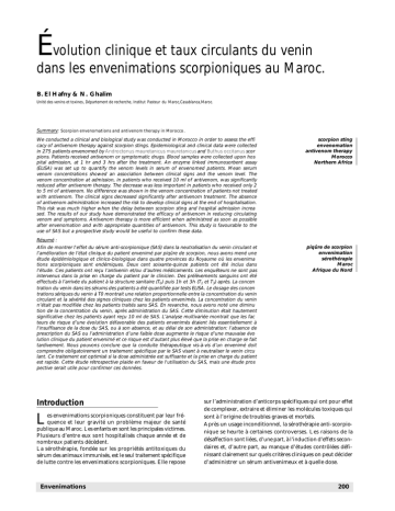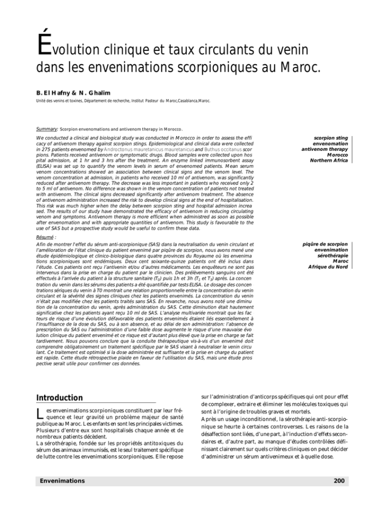 Évolution clinique et taux circulants du venin dans les envenimations scorpioniques au Maroc. B. El Hafny & N. Ghalim Unité des venins et toxines, Département de recherche, Institut Pasteur du Maroc,Casablanca,Maroc. Summary: Scorpion envenomations and antivenom therapy in Morocco. We conducted a clinical and biological study was conducted in Morocco in order to assess the effi cacy of antivenom therapy against scorpion stings. Epidemiological and clinical data were collected in 275 patients envenomed by Androctonus mauretanicus mauretanicus and Buthus occitanus scor pions. Patients received antivenom or symptomatic drugs. Blood samples were collected upon hos pital admission, at 1 hr and 3 hrs after the treatment. An enzyme linked immunosorbent assay (ELISA) was set up to quantify the venom levels in serum of envenomed patients. Mean serum venom concentrations showed an association between clinical signs and the venom level. The venom concentration at admission, in patients who received 10 ml of antivenom, was significantly reduced after antivenom therapy. The decrease was less important in patients who received only 2 to 5 ml of antivenom. No difference was shown in the venom concentration of patients not treated with antivenom. The clinical signs decreased significantly after antivenom treatment. The absence of antivenom administration increased the risk to develop clinical signs at the end of hospitalisation. This risk was much higher when the delay between scorpion sting and hospital admission increa sed. The results of our study have demonstrated the efficacy of antivenom in reducing circulating venom and symptoms. Antivenom therapy is more efficient when administred as soon as possible after envenomation and with appropriate quantities of antivenom. This study is favourable to the use of SAS but a prospective study would be useful to confirm these data. scorpion sting envenomation antivenom therapy Morocco Northern Africa Résumé : Afin de montrer l'effet du sérum anti-scorpionique (SAS) dans la neutralisation du venin circulant et l’amélioration de l’état clinique du patient envenimé par piqûre de scorpion, nous avons mené une étude épidémiologique et clinico-biologique dans quatre provinces du Royaume où les envenima tions scorpioniques sont endémiques. Deux cent soixante-quinze patients ont été inclus dans l’étude. Ces patients ont reçu l’antivenin et/ou d’autres médicaments. Les enquêteurs ne sont pas intervenus dans la prise en charge du patient par le clinicien. Des prélèvements sanguins ont été effectués à l’arrivée du patient à la structure sanitaire (T0) puis 1h et 3h (T1 et T3) après. La concen tration du venin dans les sérums des patients a été quantifiée par tests ELISA. Le dosage des concen trations sériques du venin à T0 montrait une relation proportionnelle entre la concentration du venin circulant et la sévérité des signes cliniques chez les patients envenimés. La concentration du venin n’était pas modifiée chez les patients traités sans SAS. En revanche, nous avons noté une diminu tion de la concentration du venin, après administration du SAS. Cette diminution était hautement significative chez les patients ayant reçu 10 ml de SAS. L’analyse multivariée montrait que les fac teurs de risque d’une évolution défavorable des patients envenimés étaient liés essentiellement à l'insuffisance de la dose du SAS, ou à son absence, et au délai de son administration: l’absence de prescription du SAS ou l’administration d’une faible dose augmente le risque d’une mauvaise évo lution clinique du patient envenimé et ce risque est d’autant plus élevé que la prise en charge se fait tardivement. Nous pouvons conclure que la conduite thérapeutique vis-à-vis d’un envenimé doit comprendre obligatoirement un traitement spécifique par le SAS visant à neutraliser le venin circu lant. Ce traitement est optimisé si la dose administrée est suffisante et la prise en charge du patient est rapide. Cette étude rétrospective plaide en faveur de l'utilisation du SAS, mais une étude pros pective serait utile pour confirmer ces données. Introduction L es envenimations scorpioniques constituent par leur fréquence et leur gravité un problème majeur de santé publique au Maroc. Les enfants en sont les principales victimes. Plusieurs d’entre eux sont hospitalisés chaque année et de nombreux patients décèdent. La sérothérapie, fondée sur les propriétés antitoxiques du sérum des animaux immunisés, est le seul traitement spécifique de lutte contre les envenimations scorpioniques. Elle repose Envenimations piqûre de scorpion envenimation sérothérapie Maroc Afrique du Nord sur l’administration d’anticorps spécifiques qui ont pour effet de complexer, extraire et éliminer les molécules toxiques qui sont à l’origine de troubles graves et mortels. Après un usage inconditionnel, la sérothérapie anti-scorpionique se heurte à certaines controverses. Les raisons de la désaffection sont liées, d’une part, à l’induction d’effets secondaires et, d’autre part, au manque d’études contrôlées définissant clairement sur quels critères cliniques on peut décider d’administrer un sérum antivenimeux et à quelle dose. 200 De nos jours, les techniques de préparation des anticorps, notamment la digestion pepsique des IgG en F(ab’)2 et leur purification contribuent largement à l’augmentation de l’efficacité du sérum et à l’élimination des substances susceptibles d’entraîner des effets indésirables. Cependant, les informations qui permettent de fixer les conditions d’utilisation des sérums sont fondées sur des observations cliniques fragmentaires. Au Maroc, la sérothérapie anti-scorpionique est utilisée depuis plusieurs années. Cependant, elle n’est probablement pas réalisée dans des conditions satisfaisantes de sorte que son efficacité est contes