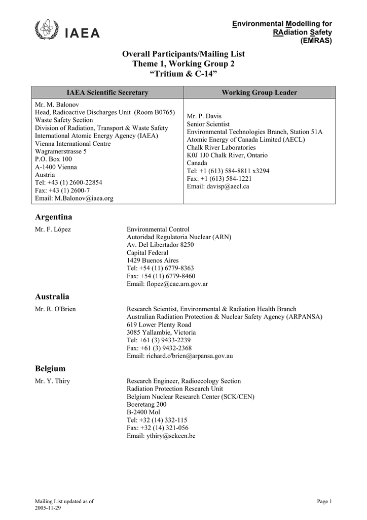 Environmental Modelling for RAdiation Safety (EMRAS) Overall Participants/Mailing List Theme 1, Working Group 2 “Tritium & C-14” IAEA Scientific Secretary Mr. M. Balonov Head, Radioactive Discharges Unit (Room B0765) Waste Safety Section Division of Radiation, Transport & Waste Safety International Atomic Energy Agency (IAEA) Vienna International Centre Wagramerstrasse 5 P.O. Box 100 A-1400 Vienna Austria Tel: +43 (1) 2600-22854 Fax: +43 (1) 2600-7 Email: [email protected] Working Group Leader Mr. P. Davis Senior Scientist Environmental Technologies Branch, Station 51A Atomic Energy of Canada Limited (AECL) Chalk River Laboratories K0J 1J0 Chalk River, Ontario Canada Tel: +1 (613) 584-8811 x3294 Fax: +1 (613) 584-1221 Email: [email protected] Argentina Mr. F. López Environmental Control Autoridad Regulatoria Nuclear (ARN) Av. Del Libertador 8250 Capital Federal 1429 Buenos Aires Tel: +54 (11) 6779-8363 Fax: +54 (11) 6779-8460 Email: [email protected] Australia Mr. R. O'Brien Research Scientist, Environmental & Radiation Health Branch Australian Radiation Protection & Nuclear Safety Agency (ARPANSA) 619 Lower Plenty Road 3085 Yallambie, Victoria Tel: +61 (3) 9433-2239 Fax: +61 (3) 9432-2368 Email: richard.o'[email protected] Belgium Mr. Y. Thiry Mailing List updated as of 2005-11-29 Research Engineer, Radioecology Section Radiation Protection Research Unit Belgium Nuclear Research Center (SCK/CEN) Boeretang 200 B-2400 Mol Tel: +32 (14) 332-115 Fax: +32 (14) 321-056 Email: [email protected] Page 1 Brazil Mrs. S. da Silva Peres Researcher & Inspector Instituto de Radioproteção e Dosimetria (IRD/CNEN) Comissão Nacional de Energia Nuclear Av. Salvador Allende s/nr. P.O. Box 37750, Barra duaTijuca CEP 22780-160 Rio de Janeiro Tel: +55 (21) 3411-8100 Fax: +55 (21) 2442-2699 Email: [email protected] Canada Mr. C. Barbeau Professeur, Laboratoire de radioévologie Département de chimie, Faculté des sciences et de génie Université Laval G1K 7P4 Québec Tel: +1 (418) 656-3537 Fax: +1 (418) 656-7916 Email: [email protected] Mr. I. Benovich Environmental Health Physicist Environment Division (H17 E26), Nuclear Ontario Power Generation 700 University Avenue M5G 1X6 Toronto, Ontario Tel: +1 (416) 592-7154 Fax: +1 (416) 592-2466 Email: [email protected] / [email protected] Mr. S. Chouhan Analyst/Programmer Environmental Technologies Branch, Station 51A Atomic Energy of Canada Limited (AECL) Chalk River Laboratories K0J 1J0 Chalk River, Ontario Tel: +1 (613) 584-8811 x4709 Fax: +1 (613) 584-1221 Email: [email protected] Mr. K. Dormuth Director Atomic Energy of Canada Limited (AECL) 2251 Speakman Drive L5K 1B2 Mississauga, Ontario Tel: +1 (905) 823-9090 x3272 Fax: +1 (905) 855-3325 Email: [email protected] Mr. N. Garisto SENES Consultants Limited 121 Granton Drive, Unit 12 L4B 3N4 Richmond Hill, Ontario Tel: +1 (905) 764-9380 Fax: +1 (905) 764-9368 Email: [email protected] Mr. R. Hugron Direceur Général, Sureté nucléaire Quartier général de la défense national Édifice mgen G.R. Pearkes 101 Colonel by Drive K1A0K2 Ottawa, Ontario Tel: +1 (613) 995-9506 Fax: +1 (613) 992-5537 Email: [email protected] Mailing List updated as of 2005-11-29 Page 2 Mr. J. Johnson Director & CEO International Dosimetry Instruments & Services (IDIAS) Inc. 4535 West 9th Avenue V6R 2E2 Vancouver BC Tel: +1 (604) 222-9840 Email: [email protected] Mr. M. Lupien Advisor, Environmental Studies, Avant-projet - Réfection G-2 Hydro Québec 1650 Champlain St. Suite 201 G9A 4S9 Trois-Rivières, Quebec Tel: +1 (819) 378-4581 x3113 Fax: +1 (819) 694-3911 Email: [email protected] Mr. J. McCulley Health Physicist New Brunswick Power P.O. Box 2000 E3B 4X1 Fredericton, New Brunswick Tel: +1 (506) 548-4401 Fax: +1 (506) 458-4694 Email: [email protected] Mr. B. Neil Senior Scientist N4 Research Associates Inc. 73 Anstead Crescent L1S 3X4 Ajax, Ontario Tel: +1 (905) 683-4444 Email: [email protected] Mrs. L. Swami Chemistry Department Manager Ontario Power Generation 1675 Montgomery Park Road L1V 2R5 Pickering, Ontario Tel: +1 (905) 839-1151/2660 Fax: +1 (905) 837-7240 Email: [email protected] Mr. J. Walker Manager Atomic Energy of Canada Limited (AECL) Chalk River Laboratories K0J 1J0 Chalk River, Ontario Tel: +1 (613) 584-8811 x3193 Fax: +1 (613) 584-9432 Email: [email protected] Ms. T. Yankovich Research Scientist Environmental Technologies Branch, Building 513, Station 51A Atomic Energy of Canada Limited (AECL) Chalk River Laboratories K0J 1J0 Chalk River, Ontario Tel: +1 (613) 584-8811 x4732 Fax: +1 (613) 584-1221 Email: [email protected] China, People's Republic of Mr. S. Luo Mailing List updated as of 2005-11-29 Research Professor, Chairman of, Science & Technology Committee China Institute of Atomic Energy (CIAE) P.O.Box 275 (24) 102413 Beijing Tel: +86 (10) 6935-7209 Fax: +86 (10) 6935-7008 Email: [email protected] Page 3 Mr. Z. Pan Director Committee of Scientific & Technology (CNNC) P.O. Box 2102-16 100822 Beijing Tel: +86 (10) 6853-1320 Fax: +86 (10) 6853-9146 Email: [email protected] / [email protected] Mr. Y. Zhang Professor, Division of Radiation Protection and Environmental China Institute of Atomic Energy (CIAE) P.O.Box 275 (24) 102413 Beijing Tel: +86 (10) 6935-8181 Fax: +86 (10) 6935-8270 Email: [email protected] Czech Republic Mr. J. Horyna Inspector, Radiation Protection in Nuclear Fuel Cycle State Office for Nuclear Safety (SÚJB) Senovazne namesti 9 110 00 Prague 1 Tel: +420 (221) 624-448 Fax: +420 (221) 624-710 Email: [email protected] Denmark Mr. S. Jørgensen Professor (Environmental Chemistry) Department of Analytical & Pharmaceutical Chemistry Danish University of Pharmaceutical Sciences Universitetsparken 2 DK-2100 Copenhagen Ø Tel: +45 (35) 306-281 Fax: +45 (35) 306-013 Email: [email protected] Finland Mr. V. Suolanen Research Scientist, Nuclear Energy VTT Technical Research Centre of Finland Lämpömiehenkuja 3 P.O. Box 1604 FIN-02044 VTT Espoo Tel: +358 (20) 722-5063 Fax: +358 (20) 722-5000 Email: 
