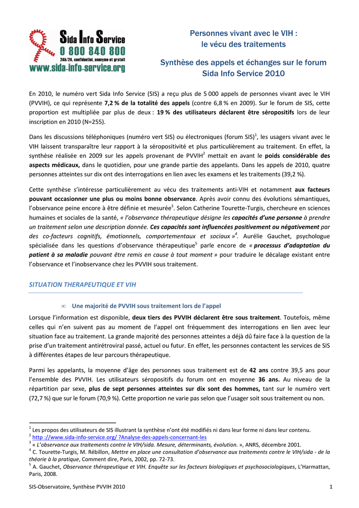 Personnes vivant avec le VIH : le vécu des traitements Synthèse des appels et échanges sur le forum Sida Info Service 2010 En 2010, le numéro vert Sida Info Service (SIS) a reçu plus de 5 000 appels de personnes vivant avec le VIH (PVVIH), ce qui représente 7,2 % de la totalité des appels (contre 6,8 % en 2009). Sur le forum de SIS, cette proportion est multipliée par plus de deux : 19 % des utilisateurs déclarent être séropositifs lors de leur inscription en 2010 (N=255). Dans les discussions téléphoniques (numéro vert SIS) ou électroniques (forum SIS)1, les usagers vivant avec le VIH laissent transparaître leur rapport à la séropositivité et plus particulièrement au traitement. En effet, la synthèse réalisée en 2009 sur les appels provenant de PVVIH2 mettait en avant le poids considérable des aspects médicaux, dans le quotidien, pour une grande partie des appelants. Dans les appels de 2010, quatre personnes atteintes sur dix ont des interrogations en lien avec les examens et les traitements (39,2 %). Cette synthèse s’intéresse particulièrement au vécu des traitements anti-VIH et notamment aux facteurs pouvant occasionner une plus ou moins bonne observance. Après avoir connu des évolutions sémantiques, l’observance peine encore à être définie et mesurée3. Selon Catherine Tourette-Turgis, chercheure en sciences humaines et sociales de la santé, « l’observance thérapeutique désigne les capacités d’une personne à prendre un traitement selon une description donnée. Ces capacités sont influencées positivement ou négativement par des co-facteurs cognitifs, émotionnels, comportementaux et sociaux »4. Aurélie Gauchet, psychologue spécialisée dans les questions d’observance thérapeutique5 parle encore de « processus d’adaptation du patient à sa maladie pouvant être remis en cause à tout moment » pour traduire le décalage existant entre l’observance et l’inobservance chez les PVVIH sous traitement. SITUATION THERAPEUTIQUE ET VIH • Une majorité de PVVIH sous traitement lors de l’appel Lorsque l’information est disponible, deux tiers des PVVIH déclarent être sous traitement. Toutefois, même celles qui n’en suivent pas au moment de l’appel ont fréquemment des interrogations en lien avec leur situation face au traitement. La grande majorité des personnes atteintes a déjà dû faire face à la question de la prise d’un traitement antirétroviral passé, actuel ou futur. En effet, les personnes contactent les services de SIS à différentes étapes de leur parcours thérapeutique. Parmi les appelants, la moyenne d’âge des personnes sous traitement est de 42 ans contre 39,5 ans pour l’ensemble des PVVIH. Les utilisateurs séropositifs du forum ont en moyenne 36 ans. Au niveau de la répartition par sexe, plus de sept personnes atteintes sur dix sont des hommes, tant sur le numéro vert (72,7 %) que sur le forum (70,9 %). Cette proportion ne varie pas selon que l’usager soit sous traitement ou non. 1 Les propos des utilisateurs de SIS illustrant la synthèse n’ont été modifiés ni dans leur forme ni dans leur contenu. http ://www.sida-info-service.org/ ?Analyse-des-appels-concernant-les 3 « L’observance aux traitements contre le VIH/sida. Mesure, déterminants, évolution. », ANRS, décembre 2001. 4 C. Tourette-Turgis, M. Rébillon, Mettre en place une consultation d’observance aux traitements contre le VIH/sida - de la théorie à la pratique, Comment dire, Paris, 2002, pp. 72-73. 5 A. Gauchet, Observance thérapeutique et VIH. Enquête sur les facteurs biologiques et psychosociologiques, L’Harmattan, Paris, 2008. 2 SIS-Observatoire, Synthèse PVVIH 2010 1 Situation des PVVIH par rapport au traitement traitement au moment de l’appel, Sida Info Service 2010 Sous traitement lors de l'appel 65,4 % - N = 1 151 Sans traitement lors de l'appel 34,6 % - N = 609 • Changement récent ou envisagé Suit un premier traitement Traitement en cours Aucun traitement actuellement Jamais pris de traitement Rupture, arrêt du TT Traitement envisagé ou proposé 9,1 % 21,1 % 68,7 % 52,4 % 17,2 % 10,3 % 20 % Diagnostic de la séropositivité et mise sous traitement Au moment de l’appel, la moitié des PVVIH sous traitement a été diagnostiquée séropositive depuis plus de dix ans : 50,1 % contre 12,1 % des PVVIH sans traitement lors de l’appel et 39,9 % de l’ensemble des PVVIH. PVVIH De fait, les personnes ne sont pas nécessairement nécessa mises sous traitement nt lors du diagnostic et la probabilité d’une mise sous traitement s’accroît avec les années (graphique 1). Parmi les personnes qui suivent un premier traitement, plus de sept sur dix ont été diagnostiquées séropositives depuis moins de cinq ans (76,7 %) et cinq sur dix depuis moins d’un an (52,9 %). % Ces chiffres montrent une mise sous traitement aitement relativement « tôt » dans le suivi médical des appelants atteints. atteints Parmi les PVVIH devant changer de traitement ou venant d’en changer, près de la moitié d’entre elles ont découvert leur séropositivité il y a plus de 15 ans (47,6 (47, %). Si le changement de traitement est plus fréquent quand l’infection est ancienne (graphique graphique 1), toutefois, près d’un tiers des ruptures ou arrêts de traitement concerne des personnes diagnostiquées depuis moins de 5 ans (30,2 %). Parmi les informations mations médicales recueillies lors des échanges, seules deux PVVIH sous traitement sur dix mentionnent une charge virale indétectable (23,8 % contre 1,3 % des personnes sans traitement lors de l’appel)) soit trois fois moins que dans l’ensemble de la population française traitée (83 ( % en 20086). Cette spécificité explique le poids de la question du traitement dans les échanges avec les PVVIH sollicitant SIS et met en exergue la diversité des situations tuations face au traitement qui sont souvent à l’origine des appels (proposition d’un