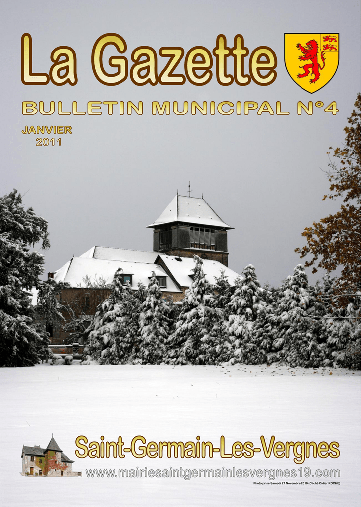 Photo prise Samedi 27 Novembre 2010 (Cliché Didier ROCHE) LE MOT DU MAIRE…………………………………………………………………………………. 1 INFOS MAIRIE………………………………………………………………………………………. 2-6 BUDGET……………………………………………………………………………………………... 7 TRAVAUX……………………………………………………………………………………………. 8-9 ÉCOLE……………………………………………………………………………………………….. 10-12 COMMERCES & ENTREPRISES………………………………………………………………… 13-15 ASSOCIATIONS……………………………………………………………………………………. 16 ESPACE PHOTOS…………………………………………………………………………………. 17-29 SAINT-GERMAIN AUTREFOIS…………………………………………………………………... 30 ESPACE INFORMATIQUE………………………………………………………………………... 31-32 INFOS PRATIQUES………………………………………………………………………………... 33-39 ENVIRONNEMENT…………………………………………………………………………………. 40-42 TOUS AU NUMÉRIQUE…………………………………………………………………………... 43-45 INTERVIEWS (Marjolaine PAITEL et Claude FADAT)………………………………………. 46 ETAT CIVIL………………………………………………………………………………………….. 47 FESTIVITÉS & COMMÉMORATIONS 2011……………………………………………………. 48 ANNONCEURS……………………………………………………………………………………... 49-52 MAIRIE DE SAINT-GERMAIN-LES-VERGNES Le Bourg 19330 SAINT-GERMAIN-LES-VERGNES Téléphone : 05 55 29 32 33 - Fax : 05 55 29 42 30 Courriel : [email protected] Site Internet : mairiesaintgermainlesvergnes19.com Dépôt légal : Juillet 2008 - Bulletin Municipal « La Gazette N°4 de Janvier 2011 » Nombre de tirage : 550 exemplaires Directeur de Publication : Didier ROCHE. Conception et Réalisation : Didier ROCHE. Comité de Rédaction : Alain PENOT, Odile BOUYOUX, Cathy MAURY, Philippe CHEMARTIN, Nathalie CASTANET, Martin PEYRAT, Angèle REYNIER, Pascale DEVAUCHELLE, Didier ROCHE. LE MOT DU MAIRE Chers administrés, Voici une nouvelle année qui commence. Je tiens à vous présenter à vous tous, au nom du conseil municipal et en mon nom personnel, tous nos vœux de bonne et heureuse année 2011. Les collectivités subissent de profondes mutations : réforme territoriale, réforme financière et contexte de crise qui entraînent une maîtrise de plus en plus rigoureuse de la dépense publique et l’obligation de structurer nos objectifs prioritaires. Malgré tout cela, la municipalité a réussi à reconduire les mêmes taux d’imposition depuis mars 2008 et espère pouvoir les maintenir en 2011. Cela n’empêche pas notre commune de progresser : le cap des mille habitants a été franchi, dix sept enfants sont inscrits dans notre micro-crèche, nous poursuivons la concertation pour la révision de la carte communale dans le respect de l’environnement l’amélioration continue de l’état de nos routes. ainsi que Je remercie les annonceurs pour leur précieux soutien, les bénévoles qui font vivre notre village, ainsi que tous ceux qui ont contribué à l’élaboration de cette gazette. Le Maire, Meilleurs vœux à tous ! Alain PENOT. De gauche à droite : Valéry GALLIOT, Régine ESPALIOUX, Sandrine LACAILLE, Sabine MERPILLAT , Mathilde BOUILLAGUET, Jacqueline HÉBRARD, Thierry LEFEVRE, Daniel SOULAS, Noël MARTINIE, Claude FADAT, C hr i st i a ne ROUGIER, Fl ore nc e BOUCHETEIL. 1 INFOS MAIRIE LES COMMISSIONS COMMUNALES Commission Plis et Appel d’Offres : Alain PENOT Odile BOUYOUX Philippe CHEMARTIN Agnès DELMAS-TROUSSELIER Nathalie CASTANET Louis PLANCHOT Commission Finances : - Responsable : Odile BOUYOUX - Membres : Alain PENOT Pascale DEVAUCHELLE Louis PLANCHOT Francine MEYER CCAS : Alain PENOT Cathy MAURY Odile BOUYOUX Nathalie CASTANET Nathalie DENIS Pascale DEVAUCHELLE Communauté de Communes : - Titulaire : Alain PENOT - Suppléant : Odile BOUYOUX SDIS : - Titulaire : Angèle REYNIER - Suppléant : Agnès DELMAS-TROUSSELIER SIRTOM : - Titulaires : Angèle REYNIER Louis PLANCHOT - Suppléants : Philippe CHEMARTIN Pascale DEVAUCHELLE Gestion des Salles-Huttes-EtangsSports-Tourisme : - Responsable : Martin PEYRAT - Membres : Alain PENOT Nathalie CASTANET Philippe CHEMARTIN Didier ROCHE Cathy MAURY Nathalie DENIS Syndicat des Eaux du Maumont : - Titulaires : Cathy MAURY Odile BOUYOUX - Suppléants : Pascale DEVAUCHELLE Angèle REYNIER Fleurissement : - Responsable : Cathy MAURY - Membres : Odile BOUYOUX Angèle REYNIER Pascale DEVAUCHELLE Nathalie DENIS S. Intercommunal d’Électrification Martin PEYRAT de Tulle Campagne Nord : Agnès DELMAS-TROUSSELIER - Titulaires : Angèle REYNIER Communication et Information : Philippe CHEMARTIN - Responsable : - Suppléants : Didier ROCHE Pascale DEVAUCHELLE - Membres : Odile BOUYOUX Alain PENOT Pascale DEVAUCHELLE Voirie- Assainissement-Eclairage Martin PEYRAT Public-Cimetière : Gilles MAUSSET - Responsable : Didier ROCHE Environnement-Urbanisme- Membres : Agriculture-Développement durable : Alain PENOT - Responsable : Angèle REYNIER Louis PLANCHOT Agnès DELMAS-TROUSSELIER - Membres : Philippe CHEMARTIN Alain PENOT Louis PLANCHOT Philippe CHEMARTIN Pascale DEVAUCHELLE Achats de Fournitures et Matériel : Odile BOUYOUX - Responsable : Christophe TREILLE Gilles MAUSSET Cathy MAURY - Membres : Didier ROCHE Alain PENOT Agnès DELMAS-TROUSSELIER Gestion du Personnel : Alain PENOT NUMÉROS MUNICIPAUX UTILES