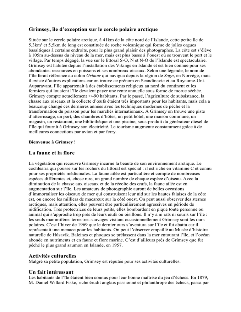 Grímsey, île d’exception sur le cercle polaire arctique Située sur le cercle polaire arctique, à 41km de la côte nord de l’Islande, cette petite île de 5,3km² et 5,5km de long est constituée de roche volcanique qui forme de jolies orgues basaltiques à certains endroits, pour le plus grand plaisir des photographes. La côte est s’élève à 105m au-dessus du niveau de la mer, mais est plus basse à l’ouest où se trouvent le port et le village. Par temps dégagé, la vue sur le littoral S-O, N et N-O de l’Islande est spectaculaire. Grímsey est habitée depuis l’installation des Vikings en Islande et est bien connue pour ses abondantes ressources en poissons et ses nombreux oiseaux. Selon une légende, le nom de l’île ferait référence au colon Grímur qui navigua depuis la région de Sogn, en Norvège, mais il existe d’autres explications car on trouve ce prénom en Scandinavie et au Royaume-Uni. Auparavant, l’île appartenait à des établissements religieux au nord du continent et les fermiers qui louaient l’île devaient payer une rente annuelle sous forme de morue séchée. Grímsey compte actuellement +/-90 habitants. Par le passé, l’agriculture de subsistance, la chasse aux oiseaux et la collecte d’œufs étaient très importants pour les habitants, mais cela a beaucoup changé ces dernières années avec les techniques modernes de pêche et la transformation du poisson pour les marchés internationaux. À Grímsey on trouve une piste d’atterrissage, un port, des chambres d’hôtes, un petit hôtel, une maison commune, un magasin, un restaurant, une bibliothèque et une piscine, sous-produit du générateur diesel de l’île qui fournit à Grímsey son électricité. Le tourisme augmente constamment grâce à de meilleures connections par avion et par ferry. Bienvenue à Grímsey ! La faune et la flore La végétation qui recouvre Grímsey incarne la beauté de son environnement arctique. Le cochléaria qui pousse sur les rochers du littoral est spécial : il est riche en vitamine C et connu pour ses propriétés médicinales. La faune ailée est particulière et compte de nombreuses espèces différentes et, chose rare, un grand nombre de chaque espèce d’oiseau. Avec la diminution de la chasse aux oiseaux et de la récolte des œufs, la faune ailée est en augmentation sur l’île. Les amateurs de photographie auront de belles occasions d’immortaliser les oiseaux de mer qui construisent leur nid sur les hautes falaises de la côte est, ou encore les milliers de macareux sur la côté ouest. On peut aussi observer des sternes arctiques, mais attention, elles peuvent être particulièrement agressives en période de nidification. Très protectrices de leurs petits, elles bombardent en piqué toute personne ou animal qui s’approche trop près de leurs œufs ou oisillons. Il n’y a ni rats ni souris sur l’île : les seuls mammifères terrestres sauvages visitant occasionnellement Grímsey sont les ours polaires. C’est l’hiver de 1969 que le dernier ours s’aventura sur l’île et fut abattu car il représentait une menace pour les habitants. On peut l’observer empaillé au Musée d’histoire naturelle de Húsavík. Baleines et phoques se prélassent dans la mer entourant l’île, et l’océan abonde en nutriments et en faune et flore marine. C’est d’ailleurs près de Grímsey que fut pêché le plus grand saumon en Islande, en 1957. Activités culturelles Malgré sa petite population, Grímsey est réputée pour ses activités culturelles. Un fait intéressant Les habitants de l’île étaient bien connus pour leur bonne maîtrise du jeu d’échecs. En 1879, M. Daniel Willard Fiske, riche érudit anglais passionné et philanthrope des échecs, passa par Grímsey sur un bateau de voyageurs. Quand il entendit parler de la vie sur l’île et de la passion des habitants pour ce jeu, il décida d’offrir un jeu d’échec à chaque foyer ainsi qu’une somme d’argent considérable à la communauté pour soutenir leurs projets. Les habitants de Grímsey célèbrent sa mémoire chaque année le 11 novembre, jour de son anniversaire. Il y a une école primaire à Grímsey, mais il faut quitter l’île pour poursuivre ses études. L’église de Grímsey Au 11e siècle, Jón Ögmundsson, un des premiers évêques catholiques d’Islande, consacra une église à Grímsey. Elle était dédiée à St. Olaf, saint patron de la Norvège. Il était décrété qu’il devrait toujours y avoir 2 prêtres à l’église pour célébrer quotidiennement la messe, mais 2 fois par jour lors d’occasions spéciales. La pratique du christianisme est moins fervente de nos jours, mais il existe des archives recensant environ 50 prêtres et, plus tard, des révérends qui ont servi sur l’île. L’église actuelle fut construite en 1867 puis agrandie et rénovée en 1932. En 1878, un artiste local se chargea de peindre l’autel. C’est la copie d’une œuvre de Leonardo da Vinci. On dit que les promesses de dons et les donations faites à l’église réalisent les espoirs et résolvent les problèmes personnels. Grímsey, joyau du cercle polaire arctique Sentiers de randonnée Commencez votre promenade à pied près de la mer, là où la piste d’atterrissage se termine. Le sentier longe les falaises de Básavík. Ne vous approchez pas trop près du bord car les macareux ont rendu certaines parties du terrain instable en creusant leurs nids. À partir de là, le sentier mène à la partie la plus septentrionale de l’île, Eyjarfót, puis aux falaises situées les plus à l’est. Le chemin continue jusqu’au phare Grenivíkurvita à la pointe sud de l’île. Depuis le phare, marchez vers le port à Sanvík en passant devant l’église Miðgarðakirkja. Cette promenade vous permettra de photographier le paysage et la vie sauvage, mais faites attention aux nids creusés par les macareux le long de la falaise. Bienvenue à Gríms