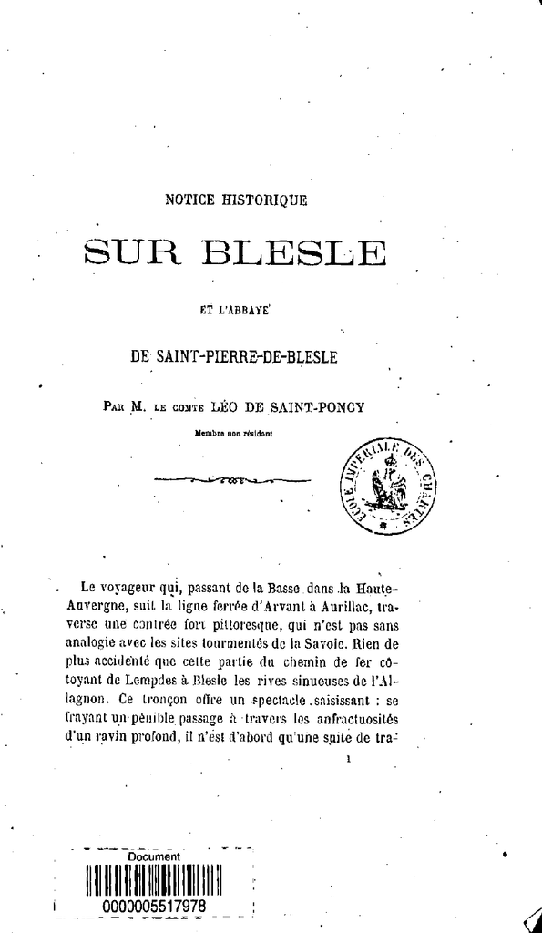 NOTICE HISTORIQUE SUR BLESLE ET L'ABBAYE DE SAINT—PIERRE—DE—BLESLE PAR M. LE COMTE LÉO DE SAINT-PONCY Membro 'ni, résidant Le voyageur qui, passant de la Basse dans la HauteAuvergne, suit la ligue ferrée d'Arvant à Aurillac, traverse unecanlrée fort pittoresque, qui n'est pas sans analogie avec les sites tourmentés de In Savoic. Rien de plus accidtité que cette partie du chemin de fer côtoyant de Lempdes à, fliesle les rives sinueuses de l'AIlagnon. Ce tronçon offre un spectacle saisissant se frayant un' pénible passage t travers les anfractuosités d'un ravin profond, il n'ést d'abord qu'une suite de tra2 Document o ii i Il il iii vo ii Ili E Ili 0000005517978 NOTICE RISTORIQIJE SUR BLESLE vaux d'art d'une hardiesse surprenante. Le train s'engage dans une vallée hérissée de roches formidables, et si resserrée, que la rivière, la route impériale et la voie ferrée, qui la sillonnent, semblent se heurter sans cesse, se touchent et parfois se superposent par défaut d'espace. Les tunnels, les viaducs, les tranchées s'accumulent et ne laissent que quelques échappées de vue, tantôt pour montrer de verl.es prairies, eu plonger sur de petits vallons apparaissant comme de fraîches oasis entre les parois abruptes des coteaux parsemés de vigne, 011 pour découvrir sur la créte, d'uii roc sourcilleux les imposants débris d'une ruine féodale. La route semble n'être qu'an cordoir formé par deux murailles de montagnes se rapprochant ou s'éloignant tour-à-tour, mais - finalement enserrant la vallée de fort près. L'Allagnon, écumant dans son lit trop étroit, tantôt murmure entre lés rochers sur un fond de cailloux, tantôt court entre les oseraies et les saules qui le voilent, animant la vallée par ses eahx hâtives et poissonneuses. Au-dessus des pentes rapides les cimes (les monts avancent la couronne de basalte qui brunit leur front. Ensuite k ce chaos succède un paysage moins sévêre le bassin s'évase; le convoi s'arrête, au milieu de riantes prairies, à la station dite de Bleste. Mais ce n'est là qu'une gare isolée, adossée au moulin qui conserve le nom et la tôurelie (le l'ancien castel de Babory. Li cité de Blesle est à deux kilomètres k l'ouest, dans un pli de montagnes. Il faut franchir un pont de structure coquette jeté sur l'Allagnon, puis un ponceau sur la rivière de Sionne, un antre encore sur le ruisseau de Voirèze; et.ce n'est qu'après avoir traversé ce troisième r- - ET L'ABBAYE DE SÀIP4T-PIEIkRE-DE-BLESLE cours d'eau, qu'on aperçoit devant soi, au fond de la gorge, une petite ville d'aspect singulier, avec sa grosse tour icosagone, son noir clocher, ses pignons pointus -et le cercle de collines industrieusement cultivées qui l'enferment de toutes parts c'est Blesle. Une série de tourelles rangées le long dune sorte de boulevard élevé sur les anciens fossés, comme l'indique son nom de l'allai (circonvallation), révèle une enceinte fortifiée, dont d'autres vestiges, des pans de murs délabrés, des bastions tronqués attestent sur d'autres points l'existence. A la pointe occidentale une tour assise sur un roc surplombe la vieille cité, sur laquelle elle étendait sa protection, lui servant k la fois de vigie et de bastille. Quelques maisons avec leurs fenêtres en trèfles, leurs meneaux sculptés, leurs haies étroites, leurs portes ogivales, une surtout dite des AD-glais; des ruelles entières bâties en encorbellement, ayant 'k leurs angles des Madones, des images de Saints enchâssées dans des niches en pierre, reflètênt une vision du moyen-âge, dont le cachet est vivement empreint sur les anciennes constructions de Blesle. Quatrè de ses monuments atlirent l'attention,.savoir la belle église romane de SaintPierre, le clocher gothique de Saint-Martin, la tour à vingt angles du vieux château, la tourelle aiguë de l'hospice. Le cours de cette Notice mettra en relief ce qui -a trait à chacune de ces antiquités, qui se découpent vivement dans le coup d'oeil jeté sur Blesle â vol d'oiseau d'une éminence voisine. A cet aspect surgit d'abord l'étonnement de trouver un gros bourg, qualifié de ville dès le- moyen-âge, et aujourd'hui chef-lieu de canton, en un pareil emplacement peu propice 'u l'actès et au L NOTICE HISTORIQUE SUR BLESLE développement d'une cité, car celle-ci est nécessaireent captive entre les côtes qui l'étouffent, et elle na d'issue que par trois défilés ressemblant k d'étroits goulets. La situation de 1)Iesle ne s'explique que par son origine monastique. Ce site enfoui dans une vallée profonde, alors impénétrable, an milieu des rochers et des bois, était parfaitement approprié it la destination conventuelle. En effet, de même que les seigneurs laïques recherchaient les lieu, élevés pour bâtir leur aire dans un but de domination, les ordres monastiques préféraient, dans une pensée de sécurité et de bien-être, les endroits abrités, les solitudes écartées, loin des chemins fréquentés par les routiers, le plus souvent dans une vallée fertile, au bord d'un ruisseau ou d'un élang. Bientôt autour du moutier s'établissaient des vassaux; une population deservireurs 'et de paysans, se serrant auprès de la maison religieuse, formait par son accroissement successif une bourgade, puis )enfln une ville. La plupart des communes de France sont composées de groupes juxtaposés à un château ou à un convent. Telle est Forigine. de Blesle (en latin lJlasila, Blasilia, Blasica, dont l'abbaye eut primitivement la seigneurie complète, c'est-à-dire la haute, moyenne et basse justice. Les lieux, comme les personnes, retiennent à Ions les âges quelque chose de leur physionomie primitive; ici le caractère claustral semble indélébile. Une sorte le recueillement mélancolique plane sur celle vallée faite jour le silence, le calme, la retraite, où l'écho du passé résonne plus fort que les bruits dit présent. En dépit des voies nouvelles de communication, des m