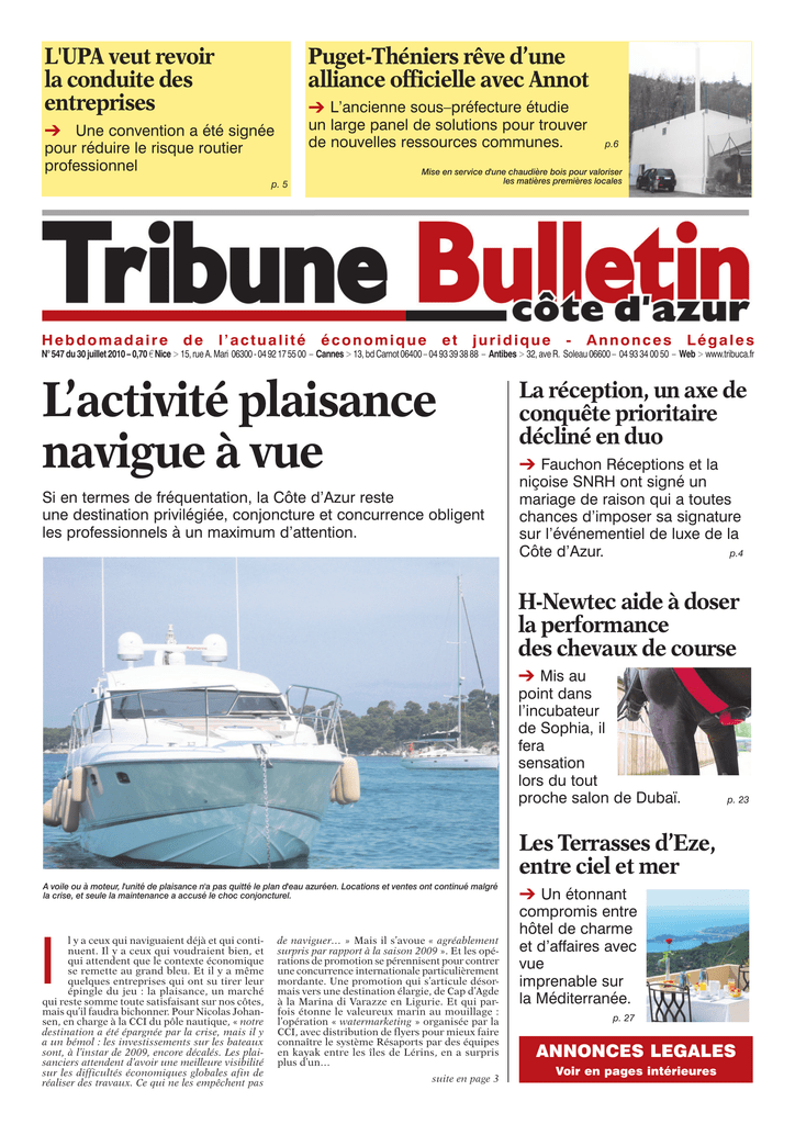 L'UPA veut revoir la conduite des entreprises Puget-Théniers rêve d’une alliance officielle avec Annot ➔ Une convention a été signée un large panel de solutions pour trouver de nouvelles ressources communes. ➔ L’ancienne sous–préfecture étudie pour réduire le risque routier professionnel p. 5 Hebdomadaire de l’actualité p.6 Mise en service d'une chaudière bois pour valoriser les matières premières locales économique et juridique - Annonces Légales N° 547 du 30 juillet 2010 – 0,70 a Nice > 15, rue A. Mari 06300 - 04 92 17 55 00 – Cannes > 13, bd Carnot 06400 – 04 93 39 38 88 – Antibes > 32, ave R. Soleau 06600 – 04 93 34 00 50 – Web > www.tribuca.fr L’activité plaisance navigue à vue Si en termes de fréquentation, la Côte d’Azur reste une destination privilégiée, conjoncture et concurrence obligent les professionnels à un maximum d’attention. La réception, un axe de conquête prioritaire décliné en duo ➔ Fauchon Réceptions et la niçoise SNRH ont signé un mariage de raison qui a toutes chances d’imposer sa signature sur l’événementiel de luxe de la p.4 Côte d’Azur. H-Newtec aide à doser la performance des chevaux de course ➔ Mis au point dans l’incubateur de Sophia, il fera sensation lors du tout proche salon de Dubaï. p. 23 Les Terrasses d’Eze, entre ciel et mer A voile ou à moteur, l'unité de plaisance n'a pas quitté le plan d'eau azuréen. Locations et ventes ont continué malgré la crise, et seule la maintenance a accusé le choc conjoncturel. I l y a ceux qui naviguaient déjà et qui continuent. Il y a ceux qui voudraient bien, et qui attendent que le contexte économique se remette au grand bleu. Et il y a même quelques entreprises qui ont su tirer leur épingle du jeu : la plaisance, un marché qui reste somme toute satisfaisant sur nos côtes, mais qu’il faudra bichonner. Pour Nicolas Johansen, en charge à la CCI du pôle nautique, « notre destination a été épargnée par la crise, mais il y a un bémol : les investissements sur les bateaux sont, à l’instar de 2009, encore décalés. Les plaisanciers attendent d’avoir une meilleure visibilité sur les difficultés économiques globales afin de réaliser des travaux. Ce qui ne les empêchent pas de naviguer… » Mais il s’avoue « agréablement surpris par rapport à la saison 2009 ». Et les opérations de promotion se pérennisent pour contrer une concurrence internationale particulièrement mordante. Une promotion qui s’articule désormais vers une destination élargie, de Cap d’Agde à la Marina di Varazze en Ligurie. Et qui parfois étonne le valeureux marin au mouillage : l’opération « watermarketing » organisée par la CCI, avec distribution de flyers pour mieux faire connaître le système Résaports par des équipes en kayak entre les îles de Lérins, en a surpris plus d’un… suite en page 3 ➔ Un étonnant compromis entre hôtel de charme et d’affaires avec vue imprenable sur la Méditerranée. p. 27 ANNONCES LEGALES Voir en pages intérieures Revue de presse Sortir EXPOSITION Trésors d’épaves Au Parc Phoenix, 405 Promenade des Anglais, Nice. Jusqu’au 15 septembre 2010, de 9h30 à 19h– 2€, gratuit moins de 12 ans. Renseignements 04.92.29.77.00 ➔ Le fruit des fouilles archéologiques officielles menées sur trois ans par les plongeurs de l’association «Anao, l’aventure sous-marine» en rade de Villefranche-surmer. Un patrimoine unique au monde par sa diversité, qui raconte à travers des milliers d’objets rares l’histoire du comté de Nice. La semaine de Jean-Jacques Ninon ➜ www.ninon-avocat.com Celui-ci (article 68-2) "peut saisir d'office la Cour de justice de la République sur avis conforme de la commission des requêtes", actuellement présidée par Gérard Palisse, doyen à la chambre criminelle de la Cour de cassation. Nadal préfère attendre qu'on le saisisse, mais n'exclut pas d'examiner une requête hors circuit judiciaire. S'il donnait son feu vert, quelle bombe ! Eric Woerth - Conseils de pro Jeudi 22 juillet, la garde des Sceaux, Michèle AlliotMarie devrait annoncer sa décision de généraliser à toutes les prisons françaises les mesures proposées par Pierre Botton et mises en œuvre depuis trois mois à la prison de Nanterre pour améliorer la situation et les conditions d'admission des primo-délinquants lors de leur arrivée en détention. Coup de téléphone gratuit à la famille, kit sanitaire, cellules d'accueil repeintes, court-métrage sur leur premier contact avec la vie en prison, affichage de la Déclaration des droits de l'homme, interdiction (surtout) des fouilles intimes, ainsi que l'extension à tous les lieux de détention français de ces dispositions constituent un succès pour Pierre Botton et sa fondation, Les prisons du cœur. La saisine du Conseil constitutionnel sur un sujet voisin, celui des gardes à vue, n'est peut-être pas étrangère à la rapidité de cette décision du ministère de la Justice. MUSIQUE Les Concerts du Cloître à Nice Du 13 juillet au 14 août, Monastère de Cimiez, place Jean-Paul II. Horaires et tarifs variables suivant concerts. Renseignements: 0.800.950.850 (numéro vert). ➔ Rendez-vous incontournable des mélomanes, les concerts du Cloître offrent l’occasion d’écouter les plus belles œuvres du répertoire interprétées par de très grands solistes internationaux, dans le cadre magnifique des jardins entourant l’église franciscaine de Cimiez. Au programme concertos, récitals, musique de chambre mais aussi master-classes publiques. HUMOUR 150ème anniversaire du rattachement de Nice à la France Richard Cairaschi à Castagniers (place du village le 3 août à 21 heures) et à l’Escarène (place Camous le 4 août à 21 heures). Estivales du Conseil général. Gratuit. www.cg06.fr ou numéro vert 0.805.566.560 ➔ Quand l’humoriste et l’homme de théâtre le plus créatif du pays niçois nous livre sa p