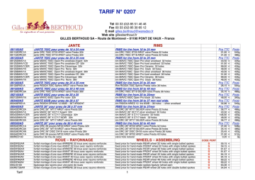 TARIF N° 0207 Tél 00 33 (0)3 85 51 46 46 Fax 00 33 (0)3 85 30 65 12 E mail [email protected] Web site gillesberthoud.fr GILLES BERTHOUD SA – Route de Montrevel – 01190 PONT DE VAUX – France 0800A JANTE RIMS 081100AS JANTE 700C pour pneu de 18 à 24 mm RIMS for tire from 18 to 24 mm 081132DRC1A 081132DRC2A jante DRC 700C ST22 ARGT valve Presta 32tr jante DRC 700C ST18 ARGT valve Presta 32tr rim DRC 700C ST22 ARGT valve Presta 32 holes rim DRC 700C ST18 ARGT valve Presta 32 holes 081200AS JANTE 700C pour pneu de 20 à 25 mm RIMS for tire from 20 to 25 mm 081232MAV1A 081232MAV1CD 081232MAV1CER 081232MAV1N 081236MAV1A 081236MAV1CD 081236MAV1CER 081236MAV1N jante MAVIC 700C Open Pro anodisée Argent 32tr jante MAVIC 700C Open Pro anodisée CD 32tr jante MAVIC 700C Open Pro Céramique 32tr jante MAVIC 700C Open Pro Noire 32tr jante MAVIC700C Open Pro anodisée Argent 36tr jante MAVIC 700C Open Pro anodisée CD 36tr jante MAVIC 700C Open Pro Céramique 36tr jante MAVIC 700C Open Pro Noire 36tr rim MAVIC 700C Open Pro silver anodised 32 holes rim MAVIC 700C Open Pro hard anodised 32 holes rim MAVIC 700C Open Pro Céramic 32 holes rim MAVIC 700C Open Pro black 32 holes rim MAVIC700C Open Pro silver anodised 36 holes rim MAVIC 700C Open Pro hard anodised 36 holes rim MAVIC 700C Open Pro Céramic 36 holes rim MAVIC 700C Open Pro black 36 holes 081300AS JANTE 700C pour pneu de 25 à 35 mm RIMS for tire from 25 to 35 mm 081336RIG1A jante RIGIDA 700C Sphinx ARGT valve Presta 36tr Rim RIGIDA 700C Sphinx Presta valve 36 holes 081500AS JANTE 700C pour pneu de 30 à 40 mm RIMS for tire from 30 to 40 mm 081536DRC3A jante DRC 700C ST19 ARGT valve Presta 36tr rim DRC 700C ST19 SILVER valve Presta 36 holes 082100AS JANTE 650C pour pneu de 20 à 25 RIMS for tire from 20 to 25mm 082132MAV1N jante MAVIC 650C Open Pro noire 32tr rim MAVIC 650C Open Pro black 32 holes 083400AS JANTE 650B pour pneu de 28 à 37 RIMS for tire from 28 to 37 mm real wide. 083436RIG1A jante RIGIDA SPHINX 12 650B – 36T ARGENT rim RIGIDA ARIES 12- tire 650B – 36 holes – silver anodised 085400AS JANTE 26" pour pneu de 28 à 37 mm RIMS for tire from 28 to 37mm 085432DRC2A 085432MAV1A 085432MAV1CER 085432MAV1N 085436DRC2A jante DRC 26" MT17 ARGT valve Presta 32tr jante MAVIC 26" XC717 Argent 32tr jante MAVIC 26" X C717 Céramique 32tr jante MAVIC 26" X C717 NOIR 32tr jante DRC 26" MT17 ARGT valve Presta 36tr rim DRC 26" MT17 SILVER valve Presta 32 holes rim MAVIC 26" XC717 silver anodised 32 holes rim MAVIC 26" X C717 Céramic 32 holes rim MAVIC 26" X C717 black 32 holes rim DRC 26" MT17 SILVER valve Presta 36 holes 085500AS JANTE 26" pour pneu de 30 à 40 mm RIMS for tire from 30 to 40 mm 085532DRC1A 085536DRC3A 085536DRC4N 085540DRC1A 089RED100 jante DRC 26 pouces MT22 ARGT valve Presta 32tr jante DRC 26" MT19 ARGT valve Presta 36tr jante DRC 26" DISC DH18 noire valve Presta 36tr jante DRC 26 pouces MT22 ARGT valve Presta 40tr réducteur de trou de valve rim DRC 26" MT22 ARGT valve Presta 32 holes rim DRC 26" MT19 SILVER valve Presta 36 holes rim DRC 26" DISC DH18 noire valve Presta 36 holes rim DRC 26" MT22 ARGT valve Presta 40 holes valve hole reducer 0900A 090DIR32AR 090DIR32AV 090DIR36AR 090DIR36AV 090DIR40AR 090DIR40AV 090DIR48AR 090DIR48AV 090LIG100 090RET28AR Tarif ROUE – RAYONNAGE forfait montage d'une roue ARRIERE 32 trous avec rayons renforcés forfait montage d'une roue AVANT 32 trous avec rayons renforcés forfait montage d'une roue ARRIERE 36 trous avec rayons renforcés forfait montage d'une roue AVANT 36 trous avec rayons renforcés forfait montage d'une roue ARRIERE 40 trous avec rayons renforcés forfait montage d'une roue AVANT 40 trous avec rayons renforcés forfait montage d'une roue ARRIERE 48 trous avec rayons renforcés forfait montage d'une roue AVANT 48 trous avec rayons renforcés ligaturage des rayons pour une paire de roues forfait montage d'une roue ARRIERE 28 trous avec rayons rétreints WHEELS – ASSEMBLING fixed price for hand-made REAR wheel 32 holes with single butted spokes fixed price for hand-made FRONT wheel 32 holes with single butted spokes fixed price for hand-made REAR wheel 36 holes with single butted spokes fixed price for hand-made FRONT wheel 36 holes with single butted spokes fixed price for hand-made REAR wheel 40 holes with single butted spokes fixed price for hand-made FRONT wheel 40 holes with single butted spokes fixed price for hand-made REAR wheel 48 holes with single butted spokes fixed price for hand-made FRONT wheel 48 holes with single butted spokes fixed price for hand-made spokes ligature (wheel pair) fixed price for hand-made REAR wheel 28 holes with double butted spokes 1 Prix TTC Poids 21,00 € 21,00 € 540g 486g Prix TTC Poids 43,50 51,00 99,00 48,00 43,50 51,00 99,00 48,00 € € € € € € € € 435g 435g 435g 435g 435g 435g 435g 435g Prix TTC Poids 28,15 € 564g Prix TTC Poids 35,10 € 486g Prix TTC Poids 48,00 € 390g Prix TTC Poids 32,96 € 540g Prix TTC Poids 36,77 43,50 106,00 48,00 36,77 CODE PORT G G G G G G G G G G € € € € € 486g 420g 420g 420g 486g Prix TTC Poids 21,00 35,10 25,45 21,00 0,20 € € € € € 59,15 59,15 61,67 61,67 64,19 64,19 69,22 69,22 63,36 54,94 € € € € € € € € € € 508g 486g 420g 512g 3g 090RET28AV 090RET32AR 090RET32AV 090RET36AR 090RET36AV forfait montage d'une roue AVANT 28 trous avec rayons rétreints forfait montage d'une roue ARRIERE 32 trous avec rayons rétreints forfait montage d'une roue AVANT 32 trous avec rayons rétreints forfait montage d'une roue ARRIERE 36 trous avec rayons rétreints forfait montage d'une roue AVANT 36 trous avec rayons rétreints 2200A 2210AS fixed price for hand-made FRONT wheel 28 holes with double butted spokes fixed price for hand-made REAR wheel 32holes with double butted spokes fixed price for hand-made FRONT wheel 32holes with double butted spokes fixed price for hand-made REAR wheel 36holes with double butted spokes fixed price for hand-ma
