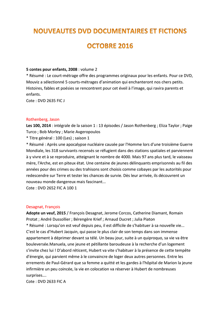 5 contes pour enfants, 2008 : volume 2 * Résumé : Le court-‐métrage offre des programmes originaux pour les enfants. Pour ce DVD, Mouviz a sélectionné 5 courts-‐métrages d’animation qui enchanteront nos chers petits. Histoires, fables et poésies se rencontrent pour cet éveil à l’image, qui ravira parents et enfants. Cote : DVD 2635 FIC J Rothenberg, Jason Les 100, 2014 : intégrale de la saison 1 : 13 épisodes / Jason Rothenberg ; Eliza Taylor ; Paige Turco ; Bob Morley ; Marie Avgeropoulos * Titre général : 100 (Les) ; saison 1 * Résumé : Après une apocalypse nucléaire causée par l'Homme lors d'une troisième Guerre Mondiale, les 318 survivants recensés se réfugient dans des stations spatiales et parviennent à y vivre et à se reproduire, atteignant le nombre de 4000. Mais 97 ans plus tard, le vaisseau mère, l'Arche, est en piteux état. Une centaine de jeunes délinquants emprisonnés au fil des années pour des crimes ou des trahisons sont choisis comme cobayes par les autorités pour redescendre sur Terre et tester les chances de survie. Dès leur arrivée, ils découvrent un nouveau monde dangereux mais fascinant... Cote : DVD 2652 FIC A 100 1 Desagnat, François Adopte un veuf, 2015 / François Desagnat, Jerome Corcos, Catherine Diamant, Romain Protat ; André Dussollier ; Bérengère Krief ; Arnaud Ducret ; Julia Piaton * Résumé : Lorsqu’on est veuf depuis peu, il est difficile de s'habituer à sa nouvelle vie... C’est le cas d’Hubert Jacquin, qui passe le plus clair de son temps dans son immense appartement à déprimer devant sa télé. Un beau jour, suite à un quiproquo, sa vie va être bouleversée.Manuela, une jeune et pétillante baroudeuse à la recherche d’un logement s’invite chez lui ! D’abord réticent, Hubert va vite s’habituer à la présence de cette tempête d’énergie, qui parvient même à le convaincre de loger deux autres personnes. Entre les errements de Paul-‐Gérard que sa femme a quitté et les gardes à l'hôpital de Marion la jeune infirmière un peu coincée, la vie en colocation va réserver à Hubert de nombreuses surprises…. Cote : DVD 2633 FIC A Chernysheva, Natalia Les Anim mômes, 2016 / Natalia Chernysheva * Résumé : De la savane africaine aux plaines vietnamiennes, un voyage extraordinaire sur le thème de l'animalité en six films d'animation. Cote : DVD 2628 FIC J Jia, Zhang-‐Ke Au-‐delà des montagnes, 2015 / Zhang-‐Ke Jia, Zhao Tao ; Jing Dong Liang ; Yi Zhang ; Sylvia Chang * Résumé : Chine, fin 1999. Tao, une jeune fille de Fenyang est courtisée par ses deux amis d’enfance, Zang et Lianzi. Zang, propriétaire d'une station-‐service, se destine à un avenir prometteur tandis que Liang travaille dans une mine de charbon. Le cœur entre les deux hommes, Tao va devoir faire un choix qui scellera le reste de sa vie et de celle de son futur fils, Dollar. Sur un quart de siècle, entre une Chine en profonde mutation et l’Australie comme promesse d’une vie meilleure, les espoirs, les amours et les désillusions de ces personnages face à leur destin. Cote : DVD 2642 FIC A Schwentke, Robert Au-‐delà du mur, 2016 : Divergente 3 / Robert Schwentke, Noah Oppenheim, Adam Cooper, Bill Collage, Veronica Roth ; Shailene Woodley ; Théo James ; Jeff Daniels * Titre général : Divergente ; 3 * Résumé : Sous le choc, Tris et Quatre doivent fuir et franchir le mur encerclant Chicago. Pour la première fois, ils quittent la seule ville et famille qu'ils aient connues. Mais au delà du mur se trouve un monde hostile qu'ils vont devoir affronter. Tris et Quatre doivent rapidement déterminer en qui ils peuvent avoir confiance alors qu’une bataille menaçant l’humanité toute entière est sur le point d'éclater... Cote : DVD 2650 FIC A Div 3 Booth, Harry L'Autobus à impériale, 1971 : 17 épisodes / Harry Booth, Roy Simpson ; Peter Firth ; Brinsley Forde ; Gilian Bailey ; Michael Audreson ; Douglas Simmonds * Résumé : À Londres, une bande de cinq garçons et de deux filles, a choisi pour terrain de jeux et quartier général un autobus à impériale (bus à étage, en anglais : double decker) abandonné dans un hangar désaffecté. Pour éloigner d'éventuels intrus, Prof', l'intellectuel de la bande, a inventé un ingénieux mécanisme de poulies à combinaison secrète qui permet d'accéder au hangar et au bus. Les jeunes gens passent leur temps à danser et à chanter, à inventer de drôles de machines et à faire parfois des bêtises. Mais voici qu'un homme d'affaires sans scrupule, Monsieur Beaumont, veut raser le hangar où se trouve le bus pour y construire un parking ...Cote : DVD 2613 FIC J Aut Duguay, Christian Belle et Sébastien 2, 2015 : l'aventure continue / Christian Duguay, Fabien Suarez, Juliette Sales, Cécile Aubry ; Félix Bossuet ; Tcheky Karyo ; Thierry Neuvic * Titre général : Belle et Sébastien ; 2 * Résumé : Septembre 1945. Au village, on a fêté la fin de la guerre. Sébastien a grandi, il a maintenant 10 ans. Belle et lui attendent impatiemment le retour d’Angelina... Mais Angelina ne revient pas. Elle a disparu dans un accident d’avion au cœur des forêts transalpines. Tout le village a perdu espoir. Tout le village sauf César : le grand père de Sébastien connaît un homme, Pierre, qui pourrait les aider à retrouver Angelina. Mais avant de sauver la jeune femme, l’enfant et son chien vont devoir braver mille dangers, traverser mille épreuves et affronter un secret. Un secret qui va changer la vie de Belle et de Sébastien à tout jamais. L’aventure continue... Cote : DVD 2654 FIC J Bel 2 Winter, Terence Boardwalk empire, 2013 : intégrale de la saison 4 : 12 épisodes / Terence Winter ; Steve Busceni ; Kelly Macdonald ; Michael Shannon * Titre général : Boardwalk empire ; quatrième saison * Résumé : Atlantic City, février 1924 : 8 mois après la fin de la saison 3, Nucky Thompson essaye d'apaiser les tensions après avoir tout