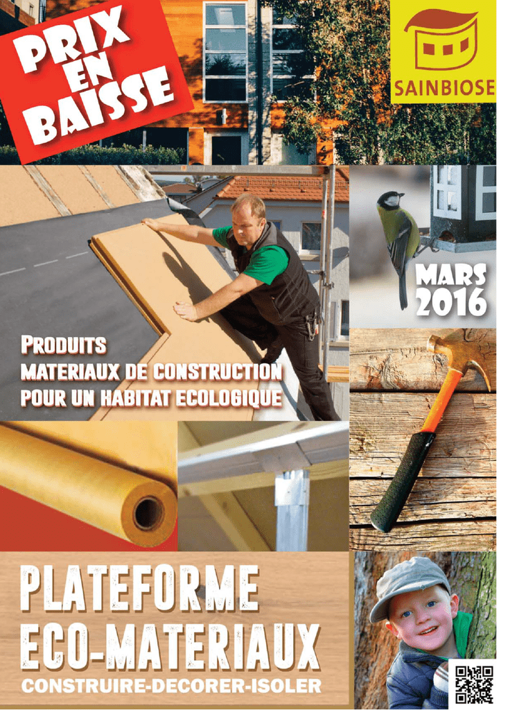 Stocks Notre espace de 2000m² d’entrepôt couvert et la plateforme de 7000m² nous permettent de garantir une disponibilité permanente de nos produits. Qualité Tous nos produits sont sélectionnés selon des critères rigoureux, à la fois pour leurs qualités techniques et pour leur impact écologique, tant au point de vue de la santé que de l’empreinte sur l’environnement. La plupart d’entre eux disposent d’avis techniques prouvant leurs caractéristiques, ainsi que de nombreux labels reconnus en France comme à l’étranger. Enfin, la transparence est une de nos exigences et nous mettons à disposition de nos clients la composition de nos produits dans leur intégralité. N’hésitez pas à consulter nos fiches techniques sur notre site www.sainbiose.com Prix Notre volume d’achat nous permet de proposer les meilleurs prix du marché. Cependant, nous accordons des remises complémentaires, soit : - Pour des palettes complètes - Sur devis, pour des commandes importantes - En fin de chantier, sur l’ensemble des différents matériaux achetés chez nous. Transports Conseils Tous nos produits sont exposés dans un showroom de 150m². Venez voir nos produits et discuter de votre projet avec un conseiller qui vous apportera son assistance pour le suivi de votre projet de construction écologique. Implantés à Meyzieu, nous livrons partout en France, par la poste pour les petits produits (voir encadré) ou par transporteur pour les commandes plus conséquentes, grâce à un réseau de messagerie affilié à nos services. N’hésitez pas à nous faire une demande de cotation! Nous disposons de notre camion grue et pouvons vous livrer directement sur chantier. Frais de Port Valable uniquement pour les peintures, pigments, colles, étanchéïté, visserie,électricité et traitement de l’eau - 12 € pour les commandes inférieures à 80 € - Gratuit pour les commandes supérieures à 80 € Zone géographique: France métropolitaine Paiement: par CB à distance, chèque bancaire, postal, ou virement. Sommaire Construire ►Briques.............................................4 ►Mur et sol chauffant........................5 ►Chaux................................................6 ►Pisé....................................................7 ►Panneaux Gypse cellulose..........8-9 ►Plaque Fermacell sol.....................10 ►Divers Fermacell / plaque plâtre...11 ►Panneaux bois................................12 ►Bois charpente...............................13 ►Ossature....................................12-14 ►Fixation isolant/Visserie...........16-17 Isoler ►Chanvre..........................................19 ►Fibre de bois flexible....................20 ►Cellulose........................................22 ►Isolation phonique........................23 ►Fibre de bois rigide.................24-25 ►Liège..............................................26 ►Roseau...........................................26 ►Isolation par l’extérieur................27 ►Etanchéité respirante..............28-31 Aménager&Décorer ►Bardage .......................................32 ►Revêtements muraux .................33 ►Dalles liège/Linoleum.............34-35 ►Parquets..................................36-37 ►Lames de terrasses.....................38 ►Colles............................................39 ►Traitements des bois............. 40-41 ►Traitements des sols............. 42-43 ►Enduits.................................... 44-47 ►Peintures................................. 48-51 Outillage ►Petits outils........................52-53 ►Location machines............54-55 Electricité ►Electricité biotique.............56-57 Eau ►Récupération d’eau...........58-61 ►Traitement de l’eau............64-65 Energies ►Puits Canadien...................62-63 ►Ventilation...........................66-69 Sanitaires ►Toilettes sèches......................71 ►Bloc isolant de construction chanvre Granulat de chanvre avec un liant hydraulique naturel. Ce système constructif non-porteur permet de nombreuses applications : - Isolation rapportée par l’extérieur (idéal sur pisé, pierre, torchis ou béton...) - Cloison de séparation (chambre, garage...) - Construction ossature bois porteuse (apporte de la masse thermique..). Parfaitement respirant, il supporte des enduits de finition terre, chaux, plâtre... Se coupe et se colle à la chaux et sable, ciment ou plâtre. Les enduits de finition sont très peu onéreux : chaux + sable ou enduit terre. Sert de masse thermique et phonique, résiste au feu et aux insectes. Lambda : 0.075 ; 20 cm brique = 35 cm béton cellulaire = 10 cm fibre de bois. Au final rentable si calcul = facile mise en oeuvre + temps + enduit + brique Epais seur Dim. Cm Nb m² Conso colle Poids kg/Un M² /pal Nb Résist /pal therm 6.2 16.2 90 Ref M² €HT M² €TTC Unité Unité €HT €TTC 1.3 BQCH100 27.45 32.83 5.21 6.25 60 2 BQCH150 41.24 49.33 7.50 9.00 45 2.7 BQCH200 55.04 65.83 10.67 12.80 2.7 BQCH300 83.07 99.35 10.67 12.80 10 cm 30x60 5.5 2.5 kg/m² 15 cm 30x60 5.5 3.8 kg/m² 9.3 10.8 20 cm 30x60 5.5 5 kg/m² 12.4 8.2 30 cm 20X60 8.3 10 kg/m² 12.4 8.2 45 MORTIER COLLE Sac de 28 KG BQCHMCOL28 13.37 16.00 13.92 16.70 Qualité intérieure et extérieure ►Briques de terre moulées ou extrudées Les briques moulées sont faites à la presse avec de la terre crue et une très faible proportion de liant hydraulique. Les briques extrudées sont de la terre crue. Utilisables pour la réalisation de structure porteuse ou parement intérieur, en cloison, remplissage de colombage ou en parement devant l’isolant. Le scellement se fait à la terre ou la chaux, la finition peut être telle quelle, enduite ou peinte avec de la terre ou chaux. Parfait régulateur hygrométrique et masse servant d’accumulateur thermique. Apporte une ambiance incomparable. Type Dim. (cm) Nb m² à Nb m² sur Poids plat c