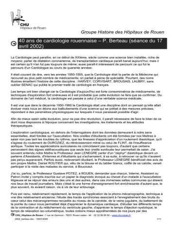 Groupe Histoire des Hôpitaux de Rouen 40 ans de cardiologie rouennaise – P. Berteau (séance du 17 avril 2002) La Cardiologie peut paraître, en ce début de XXIème, siècle comme une science bien installée, riche de moyens; parler de dilatation coronarienne, de transplantation cardiaque paraît banal aujourd’hui; mais il est certain qu'il n'en fut pas toujours de même; aussi paraît-il intéressant de parcourir ce qui fut le parcours d'un Cardiologue au cours de quarante années. Il était courant de dire, vers les années 1950-1955, que la Cardiologie était la partie de la Médecine qui recourait au plus petit nombre de médicaments; on parlait à peine de spécialité. Pourtant, des noms illustres émaillent l’histoire de cette discipline : HARVEY, CORVISART, BROUSAIS, LAUBRY, sans oublier SENAC qui publia le premier traité de cardiologie en français. Les temps ont bien changé car la Cardiologie d'aujourd'hui est forte consommatrice de médicaments, de techniques d'exploration fort onéreuses et il est probable que cette évolution ne fera que se confirmer. Du domaine de l’art médical, la cardiologie est passée à celui d’une véritable science médicale. Il est vrai que dans la décennie 1950-1960 la Cardiologie était une discipline dont on pensait qu'elle allait évoluer mais nous en étions aux balbutiements d'une science qui se prêtait à des mesures précises, répondant à des paramètres physiologiques sur lesquels il nous paraissait possible d'agir. Afin de mieux saisir cette évolution, pour ne pas dire révolution, il paraît nécessaire de faire le bilan de ce dont nous disposions à l'époque concernant les investigations, les traitements et les attitudes thérapeutiques. L'exploration cardiologique, en dehors de l'interrogatoire dont les données demeurent à notre sens essentielles, était fondée sur l'auscultation. Nos oreilles d'étudiants ont été formées par nos Maîtres à saisir non pas tant les troubles du rythme, que les finesses d'appréciation d'un roulement diastolique, qu'il s'agisse du roulement de DUROZIEZ, du rétrécissement mitral ou celui de FLINT, de l'insuffisance aortique. Toutes les appréciations auriculaires ne coïncidaient pas toujours, d'autant que certains percevaient des signes stéthacoustiques que seule leur oreille surdouée leur permettait de saisir. J'ai souvent entendu notre Maître le Professeur Jean LENEGRE parler d'un "zéphyr" diastolique devant un parterre d'Assistants, d'Internes et d'étudiants qui s'acharnaient, à sa suite, à retrouver ce qu'ils n'avaient pas perçu auparavant. Parfois aussi, redevenant étudiant, le Professeur LENEGRE bénéficiait des avis de son propre Maître, Daniel ROUTIER qui, vêtu de la blouse et du tablier blancs, coiffé de sa calotte, venait participer à la visite des malades du service, à Boucicaut. J'ai vu, parfois, le Professeur Gustave POTEZ, à ROUEN, demander que chacun, Interne, Assistant ou Patron invité y compris inscrive sur un papier le diagnostic évoqué au chevet d'un malade à l'auscultation litigieuse et se réjouir des erreurs des uns et des autres, dans ces immenses salles communes qui étaient nos lieux de travail journaliers. Mais c'était là une forme d'enseignement fort enrichissante d'autant que, le plus souvent, ils avaient raison, vis à vis de leur entourage. Puis est venu, relativement rapidement, le temps de l'application de la phono-mécanographie, technique à vrai dire relativement ancienne; l'étude des tracés synchrones associant à l'enregistrement des bruits du cœur celui des mécanogrammes recueillis au niveau de la carotide, de la veine jugulaire, du battement de la pointe du cœur nous permettait déjà d'apprécier la dynamique cardiaque, d'étudier les différents temps de la contraction et du relâchement du ventricule gauche, d'apprécier le temps d'éjection systolique, le temps de relaxation iso-volumétrique, toutes notions mieux appréhendées de nos jours par des CHU_Hôpitaux de Rouen - 1 rue de Germont - 76031 Rouen cedex - tél. : 02 32 88 89 90 – www.chu-rouen.fr 2002_berteau.doc - 18/07/2005 1/11 techniques plus sophistiquées, mais auxquelles nous avions déjà accès à cette époque. Rendons à MAREY et à CHAUVEAU la part qui leur revient dans la réalisation d'enregistrements graphiques et notamment en ce qui concerne les premiers tracés cardiographiques publiés à l'Académie des Sciences en 1861. Les enregistreurs électrocardiographiques dont nous disposions étaient des appareils à enregistrement photographique nécessitant un développement des bandes enregistrées; il s'agissait bien évidemment d'appareils mono-pistes, même si des appareils multipistes (trois au maximum!) faisaient leur apparition. Le premier Rouennais à s'équiper d'un tel matériel fut le Docteur FRIEDEL. Un immense progrès se fit jour lorsque au galvanomètre à corde succédèrent les amplificateurs à lampe puis à transistors, avec les appareils à plume chauffante, permettant une relative miniaturisation, mais surtout un enregistrement nous donnant la lecture immédiate du tracé. Malheureusement l'anti-parasitage n'était pas toujours efficace et, dans certains services, l'enregistrement des électrocardiogrammes se faisait dans l'isolation d'une cage de FARADAY. Il nous fallait avoir un bon contact cutané et, avant de poser les électrodes, nous frottions la peau avec un onguent décapant fourni par la Pharmacie centrale. La demande, d'ailleurs, était loin d'être celle que nous connaissons aujourd'hui: les Hôpitaux de Rouen possédaient au total trois enregistreurs, l'un à l’Hôtel-Dieu, le second à l'Hospice Général, devenu en 1961 l'Hôpital Charles NICOLLE, le troisième enfin à l'Hôpital de Bois-Guillaume. Tous les services de ces hôpitaux qui souhaitaient un enregistrement électrocardiographique pour un patient le demandaient soit dans le service du Docteur DELAPORTE à l’Hôtel-Dieu, où le Docteur P