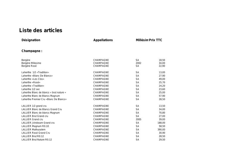 Liste des articles Désignation Appellations MillésimPrix TTC Bergère Bergère Millesime Bergère Rosé CHAMPAGNE CHAMPAGNE CHAMPAGNE SA 2002 SA 18,50 34,00 22,90 Laherthe 1/2 «Tradition» Laherthe «Blanc De Blancs» Laherthe «Les Clos» Laherthe «Rosé» Laherthe «Tradition» Laherthe 1/2 sec Laherthe Blanc de blancs « brut nature » Laherthe Blanc de Blancs Magnum Laherthe Premier Cru «Blanc De Blancs» CHAMPAGNE CHAMPAGNE CHAMPAGNE CHAMPAGNE CHAMPAGNE CHAMPAGNE CHAMPAGNE CHAMPAGNE CHAMPAGNE SA SA SA SA SA SA SA SA SA 13,00 27,90 49,00 25,70 24,20 23,60 25,00 57,90 28,50 LALLIER 1/2 grand cru LALLIER Blanc de Blancs Grand Cru LALLIER Blanc de blancs Magnum LALLIER Brut Grand cru LALLIER Grand cru LALLIER Jéroboam Grand cru LALLIER Magnum R0.10 LALLIER Mathusalem LALLIER Rosé Grand Cru LALLIER Brut R0.12 LALLIER Brut Nature R0.12 CHAMPAGNE CHAMPAGNE CHAMPAGNE CHAMPAGNE CHAMPAGNE CHAMPAGNE CHAMPAGNE CHAMPAGNE CHAMPAGNE CHAMPAGNE CHAMPAGNE SA SA SA SA 2005 SA SA SA SA SA SA Champagne : 13,50 34,00 70,80 27,00 39,00 188,00 58,50 390,00 30,90 28,50 29,50 Laurent Perrier Laurent Perrier «Rosé» Laurent Perrier Cage Rosé Laurent Perrier «Ultra Brut» Laurent Perrier Grand Siècle CHAMPAGNE CHAMPAGNE CHAMPAGNE CHAMPAGNE CHAMPAGNE SA SA SA SA SA 29,00 66,00 90,00 48,30 115,00 Pascal Doquet 1er Cru Le Mont Aimé Pascal Doquet 1er Cru Vertus Pascal Doquet Grand Cru Le Mesnil CHAMPAGNE CHAMPAGNE CHAMPAGNE 2005 2004 2002 43,90 42,10 56,60 Salon CHAMPAGNE 1999 290,00 Ulysse Collin Maillons Ulysse Collin Pierrières Ulysse Collin Roises Ulysse Collin Rosé de Saigniée CHAMPAGNE CHAMPAGNE CHAMPAGNE CHAMPAGNE SA SA SA SA Ameztia Rosé IROULEGUY 2015 9,20 Bouscassé Frimaire PACHERENC 2000 46,00 Brana "Blanc" IROULEGUY 2014 18,00 Dagueneau «Jardins De Babylone» JURANCON 2007 99,00 Egia Tegia « Dena dela » IGP SA 10,00 Gutizia Rosé IROULEGUY 2015 9,50 Harry «Doux» Harry «Sec» COTES DE GASCOGNE COTES DE GASCOGNE 2015 2015 5,80 4,30 60,00 60,00 80,50 62,40 SUD OUEST Blancs et Rosés : Haugarot «André Jean» Haugarot «Camahor» Haugarot "Sonqué tà tu" JURANCON JURANCON JURANCON 2014 2015 2014 16,00 8,90 10,50 Millet "Gros Manseng" Millet "ugni blanc/ colombard » Millet 1/2 « ugni blanc/colombard » Millet 1/2 «Egiodola» Millet Oppidum Millet Rosé «Egiodola» Millet Sauvignon COTES DE GASCOGNE COTES DE GASCOGNE COTES DE GASCOGNE COTES DE GASCOGNE COTES DE GASCOGNE COTES DE GASCOGNE COTES DE GASCOGNE 2015 2015 2015 2015 2015 2015 2015 6,70 4,30 3,10 3,10 6,90 4,90 5,50 Montus Blanc PACHERENC SEC 1999 19,20 Troteligotte CSV IGP LOT 2015 9,20 Ameztia Ameztia 1/2 rouge IROULEGUY IROULEGUY 2014 2014 13,80 7,10 Bouscassé MADIRAN 2009 15,90 Brana Axeria Brana BIZI BERRI Brana rouge IROULEGUY IROULEGUY IROULEGUY 2012 2008 2012 28,50 58,00 19,50 Brin "Ptit Brin" Brin de Temps GAILLAC GAILLAC 2014 2012 7,50 14,90 Colombière Vinum Colombiere "Coste Rouge" FRONTON FRONTON 2014 2011 8,00 14,90 Ilarria Ilarria Magnum IROULEGUY IROULEGUY 2013 2012 14,70 27,00 SUD OUEST Rouges : Ilarria Nature IROULEGUY 2011 21,40 Jonc Blanc «Sens Du Fruit» BERGERAC 2013 8,20 Mas Del Périé "Le Vin Qui Rap" Mas Del Périé "You Fuck My Wine " Mas Del Périé "Omar m'a Abuser" Vin De France Vin De France Vin De France Mas Del Perie "Tu vins plus aux soirées" Vin De France MAS DEL PERIE "Les Escures" MAS DEL PERIE " La Roque" MAS DEL PERIE "Les Acacias" MAS DEL PERIE "La pièce" CAHORS CAHORS CAHORS CAHORS SA SA SA SA 2013 2013 2012 2009/2010 10,00 9,90 9,90 9,90 10,00 15,00 25,00 49,00 Millet «Merlot / Cabernet Franc» Millet 1/2 Merlot / Cabernet Franc Millet Merlot Selection COTES DE GASCOGNE COTES DE GASCOGNE COTES DE GASCOGNE 2014 2014 2014 4,90 3,10 6,60 Montus MADIRAN 2010 23,50 Pech Abuzé Pech «Badinerie» BUZET BUZET 2008 2007 15,40 21,90 Troteligotte Knom Troteligotte Kor Troteligotte KPot CAHORS CAHORS CAHORS 2014 2015 2015 7,50 9,00 9,00 Beauséjour 1er Grand Cru Classé B Beauséjour 1er Grand Cru Classé B ST EMILION GRAND CRU ST EMILION GRAND CRU 2006 2001 77,90 93,10 Bellevue LUSSAC ST EMILION 2010 13,30 Pavillon de Taillefer ST EMILION GRAND CRU 2013 29,90 Fontbonne BORDEAUX 2014 5,00 Bordeaux Rouges : Gombaude Guillot POMEROL 2010 58,00 HAUT BRION (Quantité limitée) PESSAC LEOGNAN 2007 390,00 Haut Marbuzet ST ESTHEPHE 2012 42,00 Le Puy "Emilien" Le Puy "Barthélemy" Le Puy "Emilien" Magnum CÔTES DE FRANCS CÔTES DE FRANCS CÔTES DE FRANCS 2012 2010 2012 23,90 89,00 52,00 Les Graves de Viaud "Les Cadets" Les Graves de Viaud "Terroir" CÔTES DE BOURG CÔTES DE BOURG 2014 2012 9,50 13,90 Mac Carthy 1/2 Mac Carthy Mac Carthy Magnum ST ESTHEPHE ST ESTHEPHE ST ESTHEPHE 2012 2012 2012 13,00 23,70 48,00 Mancèdre 2007 Mancèdre magnum PESSAC LEOGNAN PESSAC LEOGNAN 2012 2012 16,80 35,40 Château Margaux (Quantité limitée) MARGAUX 1989 790,00 Micalet Micalet Cuvée Spéciale Micalet Magnum HAUT MEDOC HAUT MEDOC HAUT MEDOC 2014 2006 2014 13,30 15,90 35,00 MOUTON ROTHSCHILD (Quantité limitée) PAUILLAC 1992 420,00 Rose Sarron 1/2 Rose Sarron GRAVES GRAVES 2014 2014 6,00 8,60 Tire Pé Diem Tire Pé La Côte Tire Pé Tradition BORDEAUX BORDEAUX BORDEAUX 2014 2014 2014 7,20 11,90 10,50 Bordeaux Blancs : Alliance Sauternes Magnum Alliance Sauternes Alliance Définition Alliance Esquisse Alliance Déclinaison SAUTERNES SAUTERNES IGP ATLANTIQUE IGP ATLANTIQUE IGP ATLANTIQUE 2010 2011 2014 2014 2012 95,00 39,60 24,00 22,00 24,00 Climens Cypres de Climens Barsac Barsac 2003 2008 210,00 39,00 Fontbonne BORDEAUX Le Puy "Marie - Cécile" VIN DE France 2013 26,00 Rose Sarron 1/2 Blanc Rose Sarron Anais Rose Sarron GRAVES GRAVES GRAVES 2014 2014 2014 5,00 9,90 7,10 YQUEM SAUTERNES 1996 278,00 DRC ECHEZEAUX (Quantité limitée) DRC RICHEBOURG (Quantité limitée) DRC SAINT VIVANT (Quantité limitée) ECHEZEAUX RICHEBOURG ROMANEE ST VIVANT 2007 2007 2007 950,00 1100,00 790,00 Livera Chapelle Chambertin Livera Côtes de nuits Villages Livera Fixin CHAPELLE CHAMBERTIN COTES DE NUITS VILLAGES FIXIN 2007 