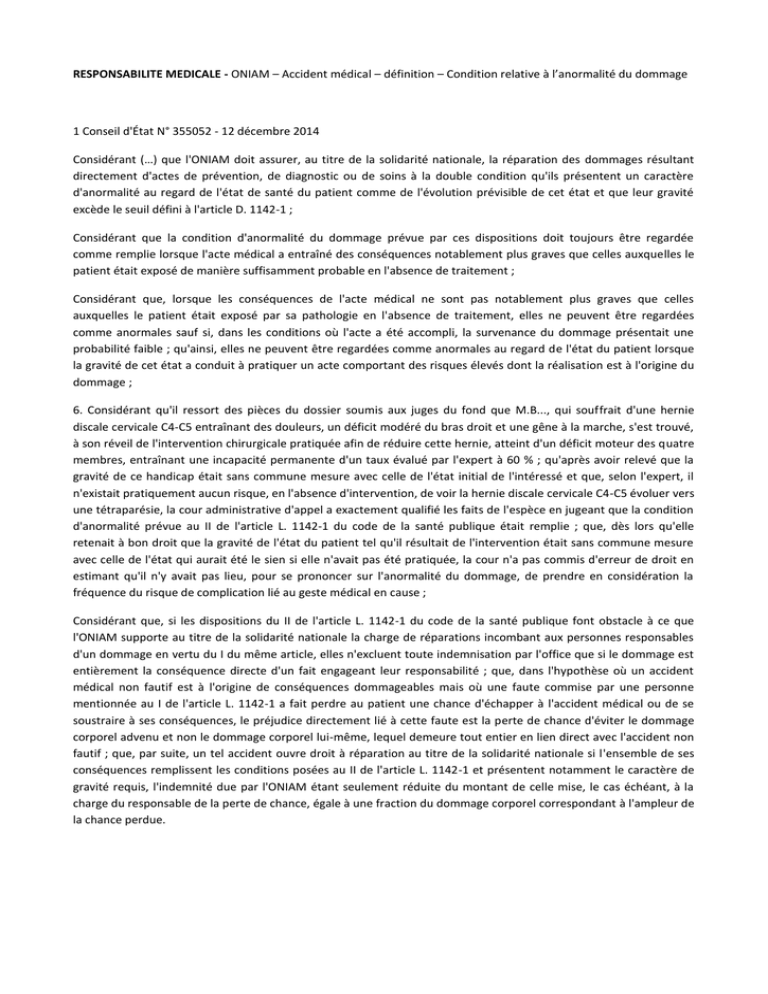RESPONSABILITE MEDICALE - ONIAM – Accident médical – définition – Condition relative à l’anormalité du dommage 1 Conseil d'État N° 355052 - 12 décembre 2014 Considérant (…) que l'ONIAM doit assurer, au titre de la solidarité nationale, la réparation des dommages résultant directement d'actes de prévention, de diagnostic ou de soins à la double condition qu'ils présentent un caractère d'anormalité au regard de l'état de santé du patient comme de l'évolution prévisible de cet état et que leur gravité excède le seuil défini à l'article D. 1142-1 ; Considérant que la condition d'anormalité du dommage prévue par ces dispositions doit toujours être regardée comme remplie lorsque l'acte médical a entraîné des conséquences notablement plus graves que celles auxquelles le patient était exposé de manière suffisamment probable en l'absence de traitement ; Considérant que, lorsque les conséquences de l'acte médical ne sont pas notablement plus graves que celles auxquelles le patient était exposé par sa pathologie en l'absence de traitement, elles ne peuvent être regardées comme anormales sauf si, dans les conditions où l'acte a été accompli, la survenance du dommage présentait une probabilité faible ; qu'ainsi, elles ne peuvent être regardées comme anormales au regard de l'état du patient lorsque la gravité de cet état a conduit à pratiquer un acte comportant des risques élevés dont la réalisation est à l'origine du dommage ; 6. Considérant qu'il ressort des pièces du dossier soumis aux juges du fond que M.B..., qui souffrait d'une hernie discale cervicale C4-C5 entraînant des douleurs, un déficit modéré du bras droit et une gêne à la marche, s'est trouvé, à son réveil de l'intervention chirurgicale pratiquée afin de réduire cette hernie, atteint d'un déficit moteur des quatre membres, entraînant une incapacité permanente d'un taux évalué par l'expert à 60 % ; qu'après avoir relevé que la gravité de ce handicap était sans commune mesure avec celle de l'état initial de l'intéressé et que, selon l'expert, il n'existait pratiquement aucun risque, en l'absence d'intervention, de voir la hernie discale cervicale C4-C5 évoluer vers une tétraparésie, la cour administrative d'appel a exactement qualifié les faits de l'espèce en jugeant que la condition d'anormalité prévue au II de l'article L. 1142-1 du code de la santé publique était remplie ; que, dès lors qu'elle retenait à bon droit que la gravité de l'état du patient tel qu'il résultait de l'intervention était sans commune mesure avec celle de l'état qui aurait été le sien si elle n'avait pas été pratiquée, la cour n'a pas commis d'erreur de droit en estimant qu'il n'y avait pas lieu, pour se prononcer sur l'anormalité du dommage, de prendre en considération la fréquence du risque de complication lié au geste médical en cause ; Considérant que, si les dispositions du II de l'article L. 1142-1 du code de la santé publique font obstacle à ce que l'ONIAM supporte au titre de la solidarité nationale la charge de réparations incombant aux personnes responsables d'un dommage en vertu du I du même article, elles n'excluent toute indemnisation par l'office que si le dommage est entièrement la conséquence directe d'un fait engageant leur responsabilité ; que, dans l'hypothèse où un accident médical non fautif est à l'origine de conséquences dommageables mais où une faute commise par une personne mentionnée au I de l'article L. 1142-1 a fait perdre au patient une chance d'échapper à l'accident médical ou de se soustraire à ses conséquences, le préjudice directement lié à cette faute est la perte de chance d'éviter le dommage corporel advenu et non le dommage corporel lui-même, lequel demeure tout entier en lien direct avec l'accident non fautif ; que, par suite, un tel accident ouvre droit à réparation au titre de la solidarité nationale si l'ensemble de ses conséquences remplissent les conditions posées au II de l'article L. 1142-1 et présentent notamment le caractère de gravité requis, l'indemnité due par l'ONIAM étant seulement réduite du montant de celle mise, le cas échéant, à la charge du responsable de la perte de chance, égale à une fraction du dommage corporel correspondant à l'ampleur de la chance perdue. 2 Conseil d'État N° 365211 - 12 décembre 2014 3. Considérant (…) que l'ONIAM doit assurer, au titre de la solidarité nationale, la réparation des dommages résultant directement d'actes de prévention, de diagnostic ou de soins à la double condition qu'ils présentent un caractère d'anormalité au regard de l'état de santé du patient comme de l'évolution prévisible de cet état et que leur gravité excède le seuil défini à l'article D. 1142-1 ; Considérant que la condition d'anormalité du dommage prévue par ces dispositions doit toujours être regardée comme remplie lorsque l'acte médical a entraîné des conséquences notablement plus graves que celles auxquelles le patient était exposé de manière suffisamment probable en l'absence de traitement ; Considérant que, lorsque les conséquences de l'acte médical ne sont pas notablement plus graves que celles auxquelles le patient était exposé par sa pathologie en l'absence de traitement, elles ne peuvent être regardées comme anormales sauf si, dans les conditions où l'acte a été accompli, la survenance du dommage présentait une probabilité faible ; qu'ainsi, elles ne peuvent être regardées comme anormales au regard de l'état du patient lorsque la gravité de cet état a conduit à pratiquer un acte comportant des risques élevés dont la réalisation est à l'origine du dommage ; Considérant que, pour juger que les conséquences dommageables de l'intubation subie par Mme A...ne pouvaient être regardées comme anormales au regard de son état comme de l'évolution prévisible de celui-ci, la cour administ