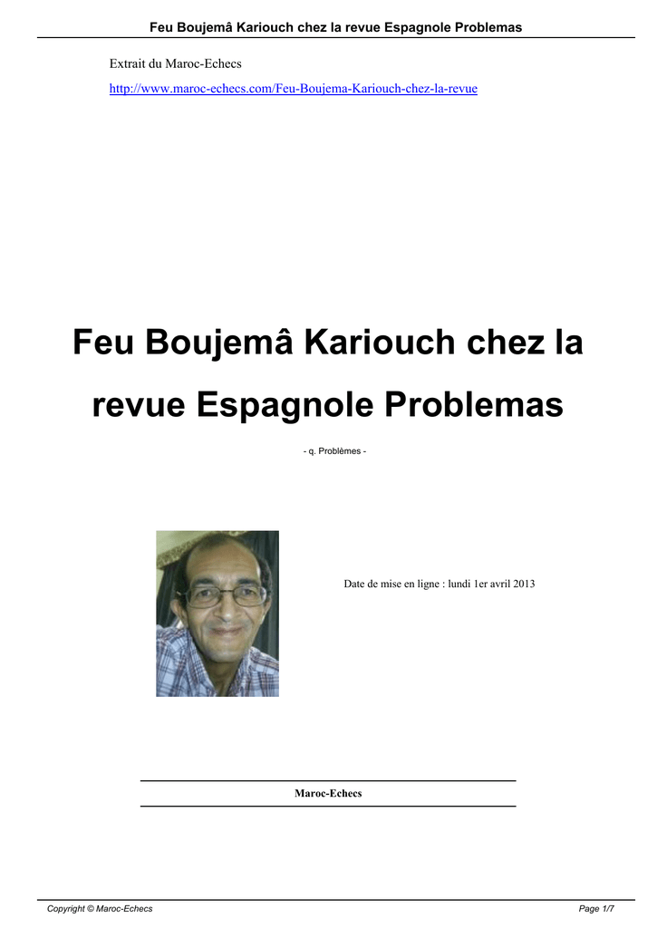 Feu Boujemâ Kariouch chez la revue Espagnole Problemas Extrait du Maroc-Echecs http://www.maroc-echecs.com/Feu-Boujema-Kariouch-chez-la-revue Feu Boujemâ Kariouch chez la revue Espagnole Problemas - q. Problèmes - Date de mise en ligne : lundi 1er avril 2013 Maroc-Echecs Copyright © Maroc-Echecs Page 1/7 Feu Boujemâ Kariouch chez la revue Espagnole Problemas Concours de composition Jubilé SEPA-80, 2015 La Sociedad Española de Problemistas de Ajedrez, pour célébrer le 80ème anniversaire de sa fondation, organise un concours de composition de problèmes de mat direct en 2 et 3 coups, à thème libre. Délai de réception des originauxjusqu'au 31 octobre 2014. Le jugement sera publié dans le premier bulletin Problemas de 2015. -Directeur : Imanol Zurutuza, et Juge pour les deux sections, José Antonio Coello, Juge International. Les originaux, qui devront être envoyés à la direction électronique [email protected] (adresse postale alternative : José Antonio Coello, C/ Simón de Anda 17 - 5º dcha. 01012 Vitoria-Gasteiz, Espagne), seront publiés dans le bulletin Problemas pendant les années 2013 et 2014. Problemas avril 2013 Voir page 36 Participants du Mémorial Boujemâ Kariouch : section mats aidés en 2 coups Ashot UZUNYAN (1) , Jean CARF (2) , Zoltán LABAI (3,4) , Abdelaziz ONKOUD (5,13,14,15,16,18), Vladislav BUNKA (6) , Shaul SHAMIR (7*) , Paz EINAT (7*) , Dieter MULLER (8*,9*,10*,11*) , Franz PACHL (8*,9*,10*) , Michal DRAGOUN (11*) , Antanas VILKAUSKAS (12*) , Zlatko MIHAJLOSKI (17) , Vitaly MEDINTSEV (19) , Alexandre PANKRATIEV (20) Valery BARSUKOV (21) , Luis Miguel MARTIN (22). Michal DRAGOUN & Dieter MULLER MT Boujemâ Kariouch Maroc Echecs 2012 1° Prix Copyright © Maroc-Echecs Page 2/7 Feu Boujemâ Kariouch chez la revue Espagnole Problemas Aidé en 2 coups 2 solutions 1 Prize Nr 11 Kb1-Kb4 Analogous play, orthogonalt and diagonalt, sacrifices of unpinned white pieces and nice mates. I like it ! 1.Fd7 (1.F ?) Td4 2.ç×d4 Fd6! 1.Tf3 (1.T ?) Fa4 2.b×a4 Tb7! Luis Miguel MARTIN MT Boujemâ Kariouch Maroc Echecs 2012 2° Prix Aidé en 2 coups 2 solutions 2 Prize Nr 22 Kc1-Kh3 Surprisingly first black moves and then line opening and unpins on the same square. Copyright © Maroc-Echecs Page 3/7 Feu Boujemâ Kariouch chez la revue Espagnole Problemas 1.Th6 Dç6 2.Cç4 D×h6! 1.Dh7 Dç2 2.Fç4 D×h7! Vitaly MEDINTSEV MT Boujemâ Kariouch Maroc Echecs 2012 1° mention d'honneur Aidé en 2 coups 2 solutions 1 HM Nr 19 Ke4-Kd7 Beautifuls models with functionswechsel between Qd1-Bh1 and Rd5-Ke5. 1.T×b5 (1.Tç5 ?, 1.Td6 ?) R×d4 2.Ré8 Fç6! 1.C×g6 (1.Cç6 ?, Cf3 ?) R×d3 2.Rç6 Dé8! Abdelaziz ONKOUD MT Boujemâ Kariouch Maroc Echecs 2012 2° mention d'honneur Copyright © Maroc-Echecs Page 4/7 Feu Boujemâ Kariouch chez la revue Espagnole Problemas Aidé en 2 coups 2 solutions 2 HM Nr 14 Ke7-Kc4 Blacks first move is to allow white mate in second. Queen c5 pins in both solutions. Models but some heavy position. 1.Cé×ç7 Cç3+ 2.Rd4 Dh8! 1.T×a7 Cd4+ 2.Rç3 C×b5! Valery BARSUKOV MT Boujemâ Kariouch Maroc Echecs 2012 1° Recommandé Aidé en 2 coups b)b6 en b5 1 Com Nr 21 Kb3-Kc5 Black Quenn unpins own Knight, which later close own lines. Nice idea, but pity that in A 1Qd4 also blocks which not happen in B. a)1.Dd4 (1.Df2 ?) g×f5 2.Cg2 f6! b)1.Dé5 (1.Dg5 ?) d×é3 2.Cg3 é4! Abdelaziz ONKOUD MT Boujemâ Kariouch "Le Chameau" Maroc Echecs 2012 2° Recommandé Copyright © Maroc-Echecs Page 5/7 Feu Boujemâ Kariouch chez la revue Espagnole Problemas Aidé en 2 coups 2 solutions 2 Com Nr 18 Ke8-Kc6 Pin models in a attractive Position. 1.T×é6 Rf8 2.Té5 Fé8! 1.Tf×g6 Fa7 2.Tg5 Cd4! Arrêtez-le chameau ! Le roi blanc est assis sur le dos d'un chameau. Le roi noir symbolise le chameau. Les pièces blanches et noires coopèrent afin d'arrêter le chameau. La Tour noire opère des croche-pieds pour stopper le chameau (captures du couple Fg6/Cé6 et contre-mesures Tg5 et Té5 ). Le Fd4 s'accroche à la tête du chameau (1...Fa7) , le Cé6 arrête le chameau (2...Cd4#). Le Roi blanc recule en tirant sur la corde (1...Rf8) , le Fg6 arrête le chameau (2...Fé8#). Dieter MULLER & Franz PACHL MT Boujemâ Kariouch Maroc Echecs 2012 Copyright © Maroc-Echecs Page 6/7 Feu Boujemâ Kariouch chez la revue Espagnole Problemas 3° Recommandé Aidé en 2 coups 2 solutions b)-Ce8 3 Com Nr 9 Kc2-Kd5 Nice K-star with good economi a)1.Fd7 ç8=C 2.Ré6 Cç7! 1.T×é3 T×f5+ 2.Ré4 Cd6! b)1.Rç4 Td8 2.Tç5 T×d4! 1.Rç6 T×ç8 2.Td8 ç×d8=D! Copyright © Maroc-Echecs Page 7/7