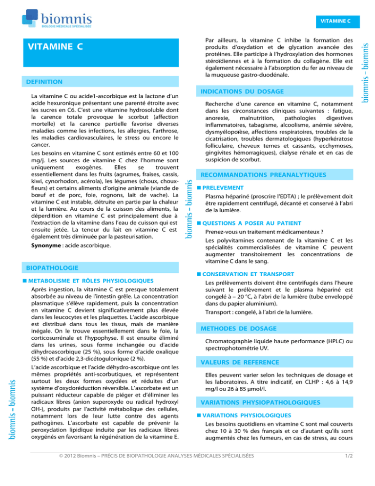 VITAMINE C VITAMINE C Par ailleurs, la vitamine C inhibe la formation des produits d’oxydation et de glycation avancée des protéines. Elle participe à l’hydroxylation des hormones stéroïdiennes et à la formation du collagène. Elle est également nécessaire à l’absorption du fer au niveau de la muqueuse gastro-duodénale. DEFINITION La vitamine C ou acide1-ascorbique est la lactone d’un acide hexuronique présentant une parenté étroite avec les sucres en C6. C’est une vitamine hydrosoluble dont la carence totale provoque le scorbut (affection mortelle) et la carence partielle favorise diverses maladies comme les infections, les allergies, l’arthrose, les maladies cardiovasculaires, le stress ou encore le cancer. Les besoins en vitamine C sont estimés entre 60 et 100 mg/j. Les sources de vitamine C chez l’homme sont uniquement exogènes. Elles se trouvent essentiellement dans les fruits (agrumes, fraises, cassis, kiwi, cynorhodon, acérola), les légumes (choux, chouxfleurs) et certains aliments d’origine animale (viande de bœuf et de porc, foie, rognons, lait de vache). La vitamine C est instable, détruite en partie par la chaleur et la lumière. Au cours de la cuisson des aliments, la déperdition en vitamine C est principalement due à l’extraction de la vitamine dans l’eau de cuisson qui est ensuite jetée. La teneur du lait en vitamine C est également très diminuée par la pasteurisation. Synonyme : acide ascorbique. BIOPATHOLOGIE METABOLISME ET RÔLES PHYSIOLOGIQUES Après ingestion, la vitamine C est presque totalement absorbée au niveau de l’intestin grêle. La concentration plasmatique s’élève rapidement, puis la concentration en vitamine C devient significativement plus élevée dans les leucocytes et les plaquettes. L’acide ascorbique est distribué dans tous les tissus, mais de manière inégale. On le trouve essentiellement dans le foie, la corticosurrénale et l’hypophyse. Il est ensuite éliminé dans les urines, sous forme inchangée ou d'acide dihydroascorbique (25 %), sous forme d’acide oxalique (55 %) et d’acide 2,3-dicétogulonique (2 %). L’acide ascorbique et l’acide déhydro-ascorbique ont les mêmes propriétés anti-scorbutiques, et représentent surtout les deux formes oxydées et réduites d’un système d’oxydoréduction réversible. L’ascorbate est un puissant réducteur capable de piéger et d’éliminer les radicaux libres (anion superoxyde ou radical hydroxyl OH-), produits par l’activité métabolique des cellules, notamment lors de leur lutte contre des agents pathogènes. L’ascorbate est capable de prévenir la peroxydation lipidique induite par les radicaux libres oxygénés en favorisant la régénération de la vitamine E. INDICATIONS DU DOSAGE Recherche d’une carence en vitamine C, notamment dans les circonstances cliniques suivantes : fatigue, anorexie, malnutrition, pathologies digestives inflammatoires, tabagisme, alcoolisme, anémie sévère, dysmyélopoïèse, affections respiratoires, troubles de la cicatrisation, troubles dermatologiques (hyperkératose folliculaire, cheveux ternes et cassants, ecchymoses, gingivites hémorragiques), dialyse rénale et en cas de suspicion de scorbut. RECOMMANDATIONS PREANALYTIQUES PRELEVEMENT Plasma hépariné (proscrire l’EDTA) ; le prélèvement doit être rapidement centrifugé, décanté et conservé à l’abri de la lumière. QUESTIONS A POSER AU PATIENT Prenez-vous un traitement médicamenteux ? Les polyvitamines contenant de la vitamine C et les spécialités commercialisées de vitamine C peuvent augmenter transitoirement les concentrations de vitamine C dans le sang. CONSERVATION ET TRANSPORT Les prélèvements doivent être centrifugés dans l’heure suivant le prélèvement et le plasma hépariné est congelé à – 20 °C, à l’abri de la lumière (tube enveloppé dans du papier aluminium). Transport : congelé, à l’abri de la lumière. METHODES DE DOSAGE Chromatographie liquide haute performance (HPLC) ou spectrophotométrie UV. VALEURS DE REFERENCE Elles peuvent varier selon les techniques de dosage et les laboratoires. A titre indicatif, en CLHP : 4,6 à 14,9 mg/l ou 26 à 85 μmol/l. VARIATIONS PHYSIOPATHOLOGIQUES VARIATIONS PHYSIOLOGIQUES Les besoins quotidiens en vitamine C sont mal couverts chez 10 à 30 % des français et ce d’autant qu’ils sont augmentés chez les fumeurs, en cas de stress, au cours © 2012 Biomnis – PRÉCIS DE BIOPATHOLOGIE ANALYSES MÉDICALES SPÉCIALISÉES 1/2 VITAMINE C de la croissance, de la grossesse, de la lactation, de la sénescence et au cours des états de fatigue, qu’ils soient saisonniers ou consécutifs à des efforts sportifs par exemple. VARIATIONS PATHOLOGIQUES Il n’existe pas de système de stockage de la vitamine C. La concentration plasmatique en vitamine C est donc le reflet des apports récents. La carence en vitamine C est responsable de scorbut. Le scorbut infantile est exceptionnel : il peut apparaître entre 6 et 18 mois, chez un nourrisson ne recevant qu’une alimentation artificielle, sans aucun complément sous forme de jus de fruits frais. Les premiers signes sont la perte d’appétit et la chute de poids chez un nourrisson qui pleure lorsqu’on le manipule. Chez l’adulte, il n’est actuellement pas rare d’observer des hypovitaminoses C qui s’expriment par des symptômes non spécifiques (asthénie, perte de poids, céphalées et une moindre résistance aux infections), mais aussi par une peau sèche, des cheveux ternes et cassants, des troubles de la cicatrisation et, parfois, par des ecchymoses ou une gingivite hémorragique. Un déficit en vitamine C est également fréquent au cours de nombreuses maladies : maladies infectieuses, anémies, dysmyélopoïèse, syndromes hémorragiques, affections rhumatismales, allergiques, patients en dialyse rénale, atteints de malabsorption chronique et au cours de la nutrition parentérale non supplémentée