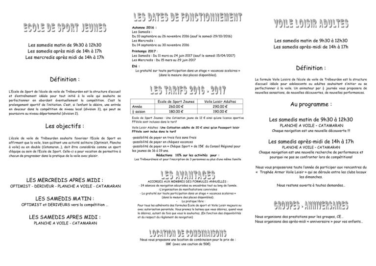 Les samedis matin de 9h30 à 12h30 Les samedis après midi de 14h à 17h Les mercredis après midi de 14h à 17h Définition : L’Ecole de Sport de l’école de voile de Trébeurden est la structure d’accueil et d’entraînement idéale pour tout initié à la voile qui souhaite se perfectionner en abordant éventuellement la compétition. C’est le prolongement sportif de l’initiation. C’est, si l’enfant le désire, une entrée en douceur dans la compétition de niveau local (division 3), qui peut se poursuivre au niveau départemental (division 2). Les objectifs : L’école de voile de Trébeurden souhaite favoriser l’Ecole de Sport en affirmant que la voile, bien qu’étant une activité solitaire (Optimist, Planche à voile) ou en double (Catamaran…), doit être considérée comme un sport d’équipe au sein de l’Ecole de Sport. Celle-ci a pour vocation de permettre à chacun de progresser dans la pratique de la voile avec plaisir. LES MERCREDIS APRES MIDI : OPTIMIST - DERIVEUR - PLANCHE A VOILE - CATAMARAN LES SAMEDIS MATIN : OPTIMIST et DERIVEURS vers la compétition … LES SAMEDIS APRES MIDI : Automne 2016 : Les Samedis : Du 10 septembre au 26 novembre 2016 (sauf le samedi 29/10/2016) Les Mercredis : Du 14 septembre au 30 novembre 2016 Printemps 2017 : Les Samedis : Du 11 mars au 24 juin 2017 (sauf le samedi 15/04/2017) Les Mercredis : Du 15 mars au 29 juin 2017 Eté : La gratuité sur toute participation dans un stage « vacances scolaires » (dans la mesure des places disponibles). Les samedis matin de 9h30 à 12h30 Les samedis après-midi de 14h à 17h Définition : La formule Voile Loisirs de l’école de voile de Trébeurden est la structure d’accueil idéale pour adolescents ou adultes souhaitant s’initier ou se perfectionner à la voile. Un animateur par ½ journée vous proposera de nouvelles sensations, de nouvelles découvertes, de nouvelles performances. Année ½ saison Ecole de Sport Jeunes 260.00 € 180.00 € Voile Loisir Adultes 290.00 € 190.00 € Ecole de Sport Jeunes : Une Cotisation jeune de 12 € ainsi qu’une licence sportive FFVoile sont incluses dans le tarif Voile Loisir Adultes : Une Cotisation adulte de 20 € ainsi qu’un Passeport loisir FFVoile sont inclus dans le tarif -possibilité de payer en trois fois sans frais -possibilité de payer en chèques vacances -possibilité de payer en « Chèque Sport » de 15€ du Conseil Régional pour les jeunes de 16 à 19 ans. Réductions 10% sur les activités pour : Les Trébeurdinais et pour l’inscription de 3 personnes ou plus d’une même famille Au programme : Les samedis matin de 9h30 à 12h30 PLANCHE A VOILE – CATAMARAN Chaque navigation est une nouvelle découverte !!! Les samedis après-midi de 14h à 17h PLANCHE A VOILE – CATAMARAN Chaque navigation est une nouvelle recherche de performance et pourquoi ne pas se confronter lors de compétitions! Nous vous proposerons toute l’année de participer aux rencontres du « Trophée Armor Voile Loisir » qui se déroule entre les clubs locaux les dimanches. ACCORDES AUX MEMBRES DES FORMULES ANNUELLES : - 24 séances de navigation sécurisées ou encadrées tout au long de l’année. -L’organisation de manifestations conviviales - La gratuité sur toute participation dans un stage « vacances scolaires » (dans la mesure des places disponibles). La pratique libre : Pour tous les adhérents des formules Ecole de sport et Voile Loisir majeurs ou avec autorisation parentale. Vous prenez le bateau que vous désirez, quand vous le désirez, autant de fois que vous le souhaitez. (En fonction des disponibilités et du respect du règlement de navigation) PLANCHE A VOILE - CATAMARAN Nous vous proposons une location de combinaison pour le prix de : 18€ (avec une caution de 50€) Nous restons ouverts à toutes demandes… Nous organisons des prestations pour les groupes, CE… Nous organisons des après-midi « anniversaire » pour vos enfants… L’EVT : UNE ECOLE DE CHAMPIONS ! Après avoir débuté tous jeunes par des stages « jardin des mers » puis « moussaillons », après avoir pratiqué l’OPTIMIST pendant les vacances puis toute l’année au sein de L’ECOLE DE SPORT DE L’ECOLE DE VOILE DE TREBEURDEN, nos jeunes brillent … : … En 2014 Baptiste devient : LES FORMULES ANNUELLES 2016 – 2017 L’Ecole de Voile de Trébeurden est une association « loi 1901 » CHAMPION DE France CHAMPION D’EUROPE Elle est gérée par un Conseil d’Administration représentant l’ensemble des adhérents. En dériveur équipe Elle est affiliée à la fédération française de voile et est agréée Ecole française de Voile. … En 2015 Marine est sacrée : VICE-CHAMPIONNE DU MONDE A KARATSU AU JAPON En dériveur 420 Pour Maïwenn, Pierre-Maël et Mathieu, de très belles performances ! Pour tous nos autres compétiteurs, beaucoup de plaisir sur l’eau et des résultats encourageants ! VENEZ LES REJOINDRE ! ! ! ECOLE DE VOILE DE TREBEURDEN 3 ROUTE DE TRAOU - MEUR 22560 TREBEURDEN Téléphone: 02.96.23.51.35 E. Mail [email protected] Portable: 06.07.16.47.69 Site Internet : www.ev-trebeurden.com