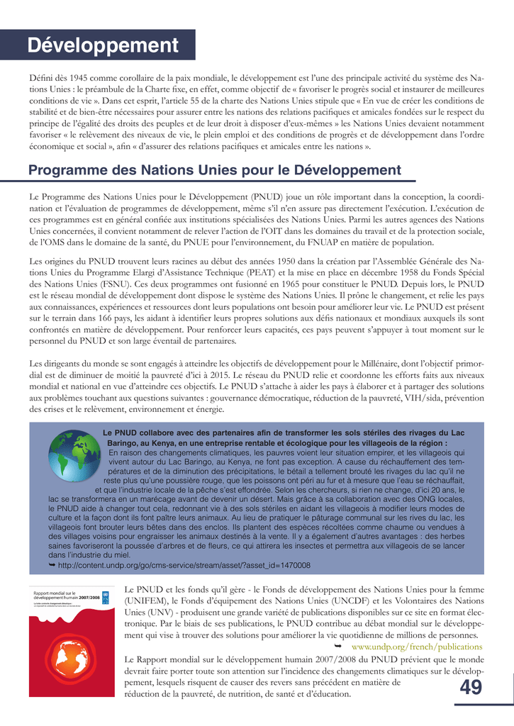 Développement Défini dès 1945 comme corollaire de la paix mondiale, le développement est l’une des principale activité du système des Nations Unies : le préambule de la Charte fixe, en effet, comme objectif de « favoriser le progrès social et instaurer de meilleures conditions de vie ». Dans cet esprit, l’article 55 de la charte des Nations Unies stipule que « En vue de créer les conditions de stabilité et de bien-être nécessaires pour assurer entre les nations des relations pacifiques et amicales fondées sur le respect du principe de l’égalité des droits des peuples et de leur droit à disposer d’eux-mêmes » les Nations Unies devaient notamment favoriser « le relèvement des niveaux de vie, le plein emploi et des conditions de progrès et de développement dans l’ordre économique et social », afin « d’assurer des relations pacifiques et amicales entre les nations ». Programme des Nations Unies pour le Développement Le Programme des Nations Unies pour le Développement (PNUD) joue un rôle important dans la conception, la coordination et l’évaluation de programmes de développement, même s’il n’en assure pas directement l’exécution. L’exécution de ces programmes est en général confiée aux institutions spécialisées des Nations Unies. Parmi les autres agences des Nations Unies concernées, il convient notamment de relever l’action de l’OIT dans les domaines du travail et de la protection sociale, de l’OMS dans le domaine de la santé, du PNUE pour l’environnement, du FNUAP en matière de population. Les origines du PNUD trouvent leurs racines au début des années 1950 dans la création par l’Assemblée Générale des Nations Unies du Programme Elargi d’Assistance Technique (PEAT) et la mise en place en décembre 1958 du Fonds Spécial des Nations Unies (FSNU). Ces deux programmes ont fusionné en 1965 pour constituer le PNUD. Depuis lors, le PNUD est le réseau mondial de développement dont dispose le système des Nations Unies. Il prône le changement, et relie les pays aux connaissances, expériences et ressources dont leurs populations ont besoin pour améliorer leur vie. Le PNUD est présent sur le terrain dans 166 pays, les aidant à identifier leurs propres solutions aux défis nationaux et mondiaux auxquels ils sont confrontés en matière de développement. Pour renforcer leurs capacités, ces pays peuvent s’appuyer à tout moment sur le personnel du PNUD et son large éventail de partenaires. Les dirigeants du monde se sont engagés à atteindre les objectifs de développement pour le Millénaire, dont l’objectif primordial est de diminuer de moitié la pauvreté d’ici à 2015. Le réseau du PNUD relie et coordonne les efforts faits aux niveaux mondial et national en vue d’atteindre ces objectifs. Le PNUD s’attache à aider les pays à élaborer et à partager des solutions aux problèmes touchant aux questions suivantes : gouvernance démocratique, réduction de la pauvreté, VIH/sida, prévention des crises et le relèvement, environnement et énergie. Le PNUD collabore avec des partenaires afin de transformer les sols stériles des rivages du Lac Baringo, au Kenya, en une entreprise rentable et écologique pour les villageois de la région : En raison des changements climatiques, les pauvres voient leur situation empirer, et les villageois qui vivent autour du Lac Baringo, au Kenya, ne font pas exception. A cause du réchauffement des températures et de la diminution des précipitations, le bétail a tellement brouté les rivages du lac qu’il ne reste plus qu’une poussière rouge, que les poissons ont péri au fur et à mesure que l’eau se réchauffait, et que l’industrie locale de la pêche s’est effondrée. Selon les chercheurs, si rien ne change, d’ici 20 ans, le lac se transformera en un marécage avant de devenir un désert. Mais grâce à sa collaboration avec des ONG locales, le PNUD aide à changer tout cela, redonnant vie à des sols stériles en aidant les villageois à modifier leurs modes de culture et la façon dont ils font paître leurs animaux. Au lieu de pratiquer le pâturage communal sur les rives du lac, les villageois font brouter leurs bêtes dans des enclos. Ils plantent des espèces récoltées comme chaume ou vendues à des villages voisins pour engraisser les animaux destinés à la vente. Il y a également d’autres avantages : des herbes saines favoriseront la poussée d’arbres et de fleurs, ce qui attirera les insectes et permettra aux villageois de se lancer dans l’industrie du miel. http://content.undp.org/go/cms-service/stream/asset/?asset_id=1470008 Le PNUD et les fonds qu’il gère - le Fonds de développement des Nations Unies pour la femme (UNIFEM), le Fonds d’équipement des Nations Unies (UNCDF) et les Volontaires des Nations Unies (UNV) - produisent une grande variété de publications disponibles sur ce site en format électronique. Par le biais de ses publications, le PNUD contribue au débat mondial sur le développement qui vise à trouver des solutions pour améliorer la vie quotidienne de millions de personnes. www.undp.org/french/publications Le Rapport mondial sur le développement humain 2007/2008 du PNUD prévient que le monde devrait faire porter toute son attention sur l’incidence des changements climatiques sur le développement, lesquels risquent de causer des revers sans précédent en matière de réduction de la pauvreté, de nutrition, de santé et d’éducation. 49 Les Objectifs du Millénaire pour le Développement Le 8 septembre 2000, lors de l’ouverture de la 55ème session de l’Assemblée Générale des Nations Unies, les 191 Etats Membres de l’ONU ont adopté les huit Objectifs du Millénaire pour le Développement (OMD) et se sont engagés à les réaliser d’ici 2015. Ces objectifs sont directement inspirés du Rapport du Millénaire, publié en avril 2000 par le Secrétaire général des Nations Unies K