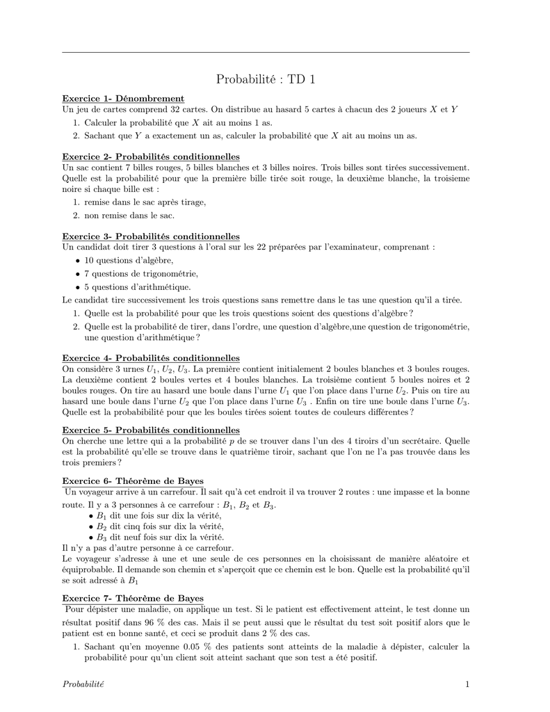 Probabilité : TD 1 Exercice 1- Dénombrement Un jeu de cartes comprend 32 cartes. On distribue au hasard 5 cartes à chacun des 2 joueurs X et Y 1. Calculer la probabilité que X ait au moins 1 as. 2. Sachant que Y a exactement un as, calculer la probabilité que X ait au moins un as. Exercice 2- Probabilités conditionnelles Un sac contient 7 billes rouges, 5 billes blanches et 3 billes noires. Trois billes sont tirées successivement. Quelle est la probabilité pour que la première bille tirée soit rouge, la deuxième blanche, la troisieme noire si chaque bille est : 1. remise dans le sac après tirage, 2. non remise dans le sac. Exercice 3- Probabilités conditionnelles Un candidat doit tirer 3 questions à l’oral sur les 22 préparées par l’examinateur, comprenant : • 10 questions d’algèbre, • 7 questions de trigonométrie, • 5 questions d’arithmétique. Le candidat tire successivement les trois questions sans remettre dans le tas une question qu’il a tirée. 1. Quelle est la probabilité pour que les trois questions soient des questions d’algèbre ? 2. Quelle est la probabilité de tirer, dans l’ordre, une question d’algèbre,une question de trigonométrie, une question d’arithmétique ? Exercice 4- Probabilités conditionnelles On considère 3 urnes U1 , U2 , U3 . La première contient initialement 2 boules blanches et 3 boules rouges. La deuxième contient 2 boules vertes et 4 boules blanches. La troisième contient 5 boules noires et 2 boules rouges. On tire au hasard une boule dans l’urne U1 que l’on place dans l’urne U2 . Puis on tire au hasard une boule dans l’urne U2 que l’on place dans l’urne U3 . Enfin on tire une boule dans l’urne U3 . Quelle est la probabibilité pour que les boules tirées soient toutes de couleurs différentes ? Exercice 5- Probabilités conditionnelles On cherche une lettre qui a la probabilité p de se trouver dans l’un des 4 tiroirs d’un secrétaire. Quelle est la probabilité qu’elle se trouve dans le quatrième tiroir, sachant que l’on ne l’a pas trouvée dans les trois premiers ? Exercice 6- Théorème de Bayes Un voyageur arrive à un carrefour. Il sait qu’à cet endroit il va trouver 2 routes : une impasse et la bonne route. Il y a 3 personnes à ce carrefour : B1 , B2 et B3 . • B1 dit une fois sur dix la vérité, • B2 dit cinq fois sur dix la vérité, • B3 dit neuf fois sur dix la vérité. Il n’y a pas d’autre personne à ce carrefour. Le voyageur s’adresse à une et une seule de ces personnes en la choisissant de manière aléatoire et équiprobable. Il demande son chemin et s’aperçoit que ce chemin est le bon. Quelle est la probabilité qu’il se soit adressé à B1 Exercice 7- Théorème de Bayes Pour dépister une maladie, on applique un test. Si le patient est effectivement atteint, le test donne un résultat positif dans 96 % des cas. Mais il se peut aussi que le résultat du test soit positif alors que le patient est en bonne santé, et ceci se produit dans 2 % des cas. 1. Sachant qu’en moyenne 0.05 % des patients sont atteints de la maladie à dépister, calculer la probabilité pour qu’un client soit atteint sachant que son test a été positif. Probabilité 1 2. Sous les mêmes conditions calculer la probabilité pour qu’un client soit atteint sachant que deux tests (indépendants) ont été positifs. Exercice 8 - Récurrence Deux joueurs A et B lancent deux dés parfaits à tour de rôle et c’est A qui commence. Il sera gagnant s’il obtient un total de 6 lors d’un lancer, auquel cas le jeu est fini, sinon c’est au tour de B. B gagne et le jeu se termine s’il obtient un total de 7, sinon A rejoue. A quel joueur le jeu est-il profitable ? Exercice 9 - Examen 2007 Un centre de production fabrique des puces électroniques dont certaines peuvent être défectueuses. Au bout de la chaîne de fabrication des puces, celles-ci sont contrôlées par un testeur électronique. Malheureusement, à ce stade de la fabrication, avant la soudure des connexions et la mise en boîtier, il n’est pas possible de réaliser un test exhaustif. En conséquence, une puce mauvaise est déclarée mauvaise par le testeur avec une probabilité β < 1. Qui plus est, une puce bonne n’est déclarée bonne par le testeur qu’avec une probabilité γ ≤ 1. Le responsable de l’atelier des puces ne connaît pas la probabilité α qu’une puce soit mauvaise. On définit les évènements suivants : - C1 = la puce est bonne, - C0 = la puce est mauvaise, - T1 = la puce est déclarée bonne par le testeur, - T0 = la puce est déclarée mauvaise par le testeur. 1. (a) Exprimer P (C0 ), P (T0 /C0 ), P (T1 /C1 ), P (T0 /C1 ) et P (C1 ) en fonction de α, β, γ. (b) En déduire la probabilité qu’une puce soit déclarée mauvaise par le testeur. (c) Application : des études antérieures ont montré que, pour le testeur utilisé, β = 0.9 et γ = 0.95. Représenter graphiquement P (T0 ) en fonction de α et interpréter les résultats pour α = 0 et α = 1. 2. (a) Exprimer en fonction de α, β et γ la probabilité qu’une puce déclarée mauvaise par le testeur soit réellement mauvaise. (b) En déduire la probabilité qu’une puce déclarée mauvaise par le testeur soit bonne. (c) Application : β = 0.9 et γ = 0.95. Représenter graphiquement les deux probabilités précédentes en fonction de α et interpréter. 3. Exprimer la probabilité qu’une puce déclarée bonne par le testeur soit mauvaise. (Remarque : le P (C0 ) peut servir à exprimer l’efficacité du testeur.) rapport R = P (C 0 /T1 ) Exercice 10 - Le probleme de Chicago - Examen 2008 1. Dans une salle de danse, il y a n couples mariés et pas de célibataires. Les danseurs choisissent chacun une danseuse au hasard. Quelle est la probabilité pour que chacun danse avec sa femme ? 2. Après la danse, chaque personne va s’assoir au hasard sur l’une des 2n chaises qui sont dans la salle. Or ces chaises sont