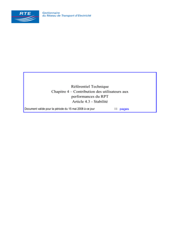 Référentiel Technique Chapitre 4 – Contribution des utilisateurs aux performances du RPT Article 4.3 - Stabilité Document valide pour la période du 15 mai 2008 à ce jour 11 pages Référentiel Technique Chapitre 4 – Contribution des utilisateurs aux performances du RPT Article 4.3 - Stabilité Page : 2/12 Document valide pour la période du 15 mai 2008 à ce jour Utilisateur concerné : producteur, distributeur 1 RAPPEL DES EXIGENCES REGLEMENTAIRES - Article 8.3 du cahier des charges de la concession à EDF du réseau d’alimentation générale en énergie électrique (avenant du 10 avril 1995 à la convention du 27 novembre 1958). - Article 12 du décret 2003-588 du 27 juin 2003 relatif aux prescriptions techniques générales de conception et de fonctionnement auxquelles doivent satisfaire les installations en vue de leur raccordement au réseau public de transport d’électricité [1]. - Articles 23 et 24 de l’arrêté du 4 juillet 2003 relatif aux prescriptions techniques de conception et de fonctionnement pour le raccordement au réseau public de transport d’une installation de production d’énergie électrique [2]. - Article 19 de l’arrêté du 6 octobre 2006 relatif aux prescriptions techniques de conception et de fonctionnement pour le raccordement au réseau public de transport d’un réseau public de distribution. - Arrêté du 27 octobre 2006 modifiant l’arrêté du 17 mars 2003 modifié relatif aux prescriptions techniques de conception et de fonctionnement pour le raccordement à un réseau public de distribution d’une installation de production d’énergie électrique. 2 ENJEUX POUR LE SYSTEME ELECTRIQUE ET LES UTILISATEURS Le maintien de la stabilité des groupes de production sur le réseau électrique lors d’un « événement normal » est un enjeu important pour le système électrique vis-à-vis de la sûreté de son fonctionnement, de l’équilibre production-consommation et de la qualité de l’onde de tension. Par événement normal, on entend notamment : • changement de consigne sur l’installation de production (ex : changement de consigne sur le régulateur de tension) ; • ouverture d’une ligne sur le réseau public de transport (changement de schéma d’exploitation) ; • court-circuit normalement éliminé sur le réseau public de transport. Lors de ces évènements, les risques associés à une perte de stabilité des groupes de production sont : • le déclenchement d’un ou plusieurs groupes de production, affectant l’équilibre production-consommation ; • l’apparition de battements de tension et d’oscillations de puissance, affectant la qualité de l’onde de tension ; Référentiel Technique Chapitre 4 – Contribution des utilisateurs aux performances du RPT Article 4.3 - Stabilité Page : 3/12 Document valide pour la période du 15 mai 2008 à ce jour • l’extension de la perte de stabilité d’un groupe à d’autres groupes de production, entraînant une rupture de synchronisme sur une zone. La conséquence peut être un écroulement du réseau sur la zone considérée, voire sur plusieurs zones adjacentes. 3 MISE EN ŒUVRE DES EXIGENCES PAR LES PRODUCTEURS ET LES DISTRIBUTEURS Le producteur doit vérifier la stabilité de son installation, préalablement à son raccordement, par des études sur logiciels dont il doit communiquer les résultats à RTE (cf. article 23 de l’arrêté [2]). Ces études, à l’exception de l’étude du comportement sur creux de tension, sont des études génériques effectuées à l’aide de schémas de réseau simplifiés standards où l’installation de production est mise en antenne sur un réseau de tension et fréquence constantes (“réseau infini”) au travers de son transformateur et de réactances de liaison. Ces réactances sont paramétrées en fonction de deux valeurs (a) et (b) standards en fonction de la puissance de l’installation : à Installation > 800 MW : a = 0,05 p.u ; b = 0,60 p.u ; à Installation > 250 MW et ≤ 800 MW : a = 0,05 p.u ; b = 0,54 p.u ; à Installation ≤ 250 MW : a = 0,05 p.u ; b = 0,30 p.u ; la base des p.u étant la tension Udim et la puissance apparente nominale de l’alternateur. De plus, pour les études de stabilité sur court-circuit, le temps d’application du défaut est également un temps standard dépendant du niveau de tension : à en HTB3 : T = 85 ms ; à en HTB2 : T = 85 ms ; à En HTB1 : T = 150 ms ; Si l’installation comporte plusieurs groupes, le producteur doit réaliser les études décrites cidessous pour chacun des groupes de l’installation. L’ensemble de ces études et critères de stabilité définissent un niveau minimal de performance en matière de stabilité. Si ces études montrent que l’installation n’est pas capable de vérifier certains critères de stabilité spécifiés dans le présent article, le raccordement peut être alors conditionné à la mise en place de dispositions à la charge du producteur permettant de ne pas perturber le fonctionnement du réseau. Pour cela, RTE réalise des études de stabilité complémentaires à celles du producteur (cf. article 2.1). En revanche, si l’installation de production satisfait ces exigences minimales et si les études de stabilité sur réseau réel (cf. article 2.1) menées par RTE identifient des contraintes de stabilité sur le réseau suite à l’insertion de l’installation de production, alors, la modification du schéma de raccordement, le renforcement du réseau, l’adaptation des protections installées sur les ouvrages RTE avoisinants, ou les limitations de production de puissance active ou réactive de l’installation sont à la charge de RTE. Comme pour les renforcements de réseau pour contraintes de transit, les limitations de fonctionnement prises en attendant l’adaptation Référentiel Technique Chapitre 4 – Contribution des utilisateurs aux performances du RPT Article 4.3 - Stabilité Page : 4/12 Document