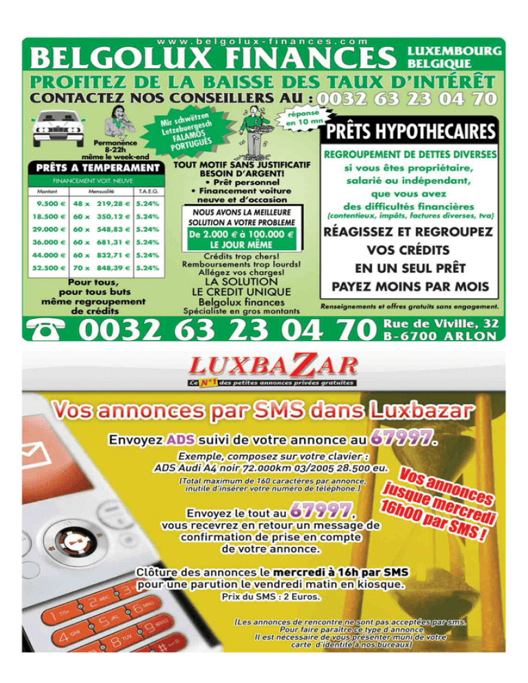 EMPLOI ARBEIT ACHATS ANKAUF Restaurator, suche neue ■ Diplom herausforderungen im denkmalschutz-sacral und profan, europaweit, referenzen vorhanden, gern zum adel, Tel. +4915785709173 Recherche/Suche ■ Cherche mécanicien Poids Lourds, pr. tr. occ. pelle sur pneus case poclain 688p, Tel. 621193374 Recherche/Suche ■ Ech 29, sichen en lëtz. Bauerebetrieb, cdi, temps plein, oder Pärdsstall, wou ech kann schaffen, léieren, wunnen an liëwen, Tel. 621471277 ou 27994535 ■ Homme ch. trav. comme agriculteur, beauc. d'expér., décl., Tel. 691713583 ■ Homme ch. trav. dans l'agriculture, et dans les vignes, décl., Tel. 691680046 ■ Jardinier 32ans, avec expér. 6 ans, fait tous travaux dans votre jard., prix bas, décl., Tel. 691786551 ARTISANAT HANDWERK ■ Ch. maçon, toiturier, pomblier, peintre et électricien pour trav. de rénovat. d'une ferme à Roussy le Bourg, Tel. 621369979 ■ Ch. prof. de toiture société au Luxemb., pour augmentation en volume de la maison, Tel. 691677577 ou SMS ■ Peintre fait tous types de travaux, peinture, platre, plaquiste, fibre de verre, tâpisserie, enduit, parquer, bien soigné et propre, pour particulier, décl., Tel. +32486135151 ou 661168337 AGRO-ALIMENTAIRE AGRAR-ERNÄHRUNG ■ Ch. vendeur/vendeuse, pour vente de fromages et salaisons sur les foires et les marchés, Tel. 691685104 Recherche/Suche Recherche/Suche ■ Ch. trav. come chef, sous-chef, cdd, temps plein, commis de cuisine, Tel. +33751295535 ■ J.f. ch. travail comme, cdd, temps plein, préparatrice, (tri, scanning, emballage, étiquetage), de commandes, dynamique, esprit d'équipe, belle présentation, Tel. +32486135151 ★ Autorecycling Gillen paye le meilleur prix pour vos voitures de ferrailles, Ch représentant parlant Russe et Chinois, Tel. 621182665 ADMINISTRATION VERWALTUNG Recherche/Suche ■ Ch. trav. comme réceptionniste, ou téléphoniste au sud du pays, langues parlées et écrites fr., lux., all. et port., décl, Tel. 691248760 ■ Ch. trav. secrétariat adminstr., femme sérieuse, Tel. +33659275830 ou 621224567 ■ Dame av. expér., parlant franç., port. et angl., ch. travail comme secrétaire ou réceptionniste, Tel. 621637053 ■ J. h. ch. trav. de bureau, secrétariat, réceptionniste, parle 8 langues, décl., Tel. 691200667 ■ Secrétaire, aide-comptable, cdi, temps plein, rech. emploi sud du Gdl, expér. + de 10 ans, franç. mat., bases all., angl., Tel. 621294524 AGRICULTURE FORET PECHE ACKERWIRTSCHAFT WALD ANGELN ARTS GRAPHIQUES IMPRIMERIE GRAPHIK-DESIGN DRUCK ■ Ch. à habiller une vitre de 3m av. des décorations, et aménager une salle de 30m2, merci de me faire des propositions, Tel. 661837151 Recherche/Suche ■ Designer ch. emploi comme, cdi, temps plein, graphic designer/illustrateur, photoshop, corel draw, illustrator, Tel. 621517157 ARCHITECTURE ET BTP ARCHITEKTUR ■ Ch. personne, pour installation portail électrique(parlophone): électro-mécanicien, Tel. 621193374 ■ Rech. maçon coffreur qualifié, urgent, pour particulier, Tel. +33686869769 Recherche/Suche ■ Architecte portugais, cdi, temps plein, urgent, ch. trav., expérience de 8 ans au Portugal, tr. beau portefeuille = AutoCad = salaire minimum! libre de suite!, Tel. 621733274 ■ Ch. trav. comme peintre qualifié, 22 ans d'expér., décl., Tel. 621465116 ■ Stage dessinateur bâtiment, je suis actuellement en formation sur le logiciel autocad. je recherche un stage non rémunéré comme dessinateur, Tel. 661879447 AUTOMOBILE ■ Ch. mécanicien auto. expér., polyvalent pr. tr. occ., Tel. 621193374 ■ Ch. peintre carrossier, pour peinture moto, urgent, Tel. 621252002 ■ Accepte trav. de peinture, faux-plafonds, laminat, scandatex, carrelages, décl., Tel. 621708911 ■ Accepte trav. de peinture, carrelages, façade, isolation, chape, finition int. et maçonnerie, décl., Tel. 691671460 Arbeiter guter Anstreicher, Tapeten, Skandatex, Gipsarbeiten, alle Renovierungen, Tel. 691997441 ■ Carreleur ch. travail décl., Tel. 621598301 ou 691817474 ■ Carreleur qualifié fait tous trav. de carrelage, maçonnerie, dispo. de suit, beauc. d'expér., décl., Tel. 621641729 ■ Ch. trav., fait petits trav. autour de la maison, Tel. 621397993 ■ Ch. trav. comme carreleur, qualifié, disponible de suite, décl., Tel. 691666454 ■ Ch. trav. comme carreleur, décl., Tel. 691709395 ■ Ch. trav. comme maçon, dans bâtiment, Tel. 621225176 ■ Ch. trav. inox, Tel. 621252002 ■ Ch. travail, tt type de rénovation, décl., Tel. 691505303 ■ Cherche des models en coiffure, pour application couleur ou mèche, Tel. 661199186 ■ Dame sérieuse avec expér. ch. emploi de retoucheuse, dans le prêt à porter, libre de suite, accepte remplacem., décl., Tel. +33662103203 ■ Electricien sérieux, temps plein, 10 ans d'expér. ch. trav. dans électricité, dans maison, appart., sdb et ciuisine, nouveau ou rénovations, dispo. de suite, décl., Tel. 691693789 ■ Fliesenleger sucht Arbeit, angemeldet, Tel. 691598053 ■ Fliesenleger-Mauerer, mit langjähriger Erfahrung, sucht Arbeit bei Hausrenovierung, u.s.w., angemeldet, Tel. 691505303 ■ Handwerker sucht Arbeit, im Haus und Garten, angem., Tel. 26908377 ■ Homme ch. petit trav. dans ferme, décl., Tel. 621242337 ch. tout travaux de ■ Homme construction, urgent, décl., Tel. 691763482 ■ Homme ch. trav. comme maçon, disp. de suite, décl., Tel. 691748407 ■ Homme ch. trav. de peinture, décl., Tel. 691745630 ch. travail, de pose ■ Homme porte/fenêtre, porte gge, parquet, volet, placard, réparation volet, décl., Tel. 621367875 ■ Homme effectue tous trav. de peinture, enduit, plâtre, papier peint, façade, peinture int., finitions, décl., Tel. 691980031 ■ J. homme ch. trav. de rénovation, 8 ans d'exp., peintre tapis, pose carrelage, parquet, rénov. sdb, cuis., élec., sanitaire, tt type de bricolage, décl., Tel. 621671954 ■ Maçon ch. travail décl., Tel. 621598301 ou 691817474 ap. 17h 2 LUXBAZAR Kostenlose private Kleinanzei