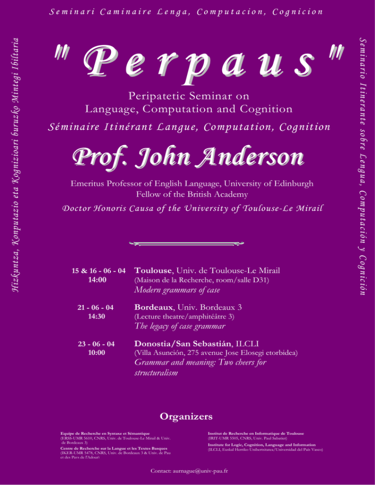 " Perpaus" Hizkuntza, Konputazio eta Kognizioari buruzko Mintegi Ibiltaria Hizkuntza, Konputazio eta Kognizioari buruzko Mintegi IbiltariaHizkuntza, Konputazio eta Kognizioari buruzko Peripatetic Seminar on Language, Computation and Cognition Séminaire Itinérant Langue, Computation, Cognition Prof. John Anderson Emeritus Professor of English Language, University of Edinburgh Fellow of the British Academy Doctor Honoris Causa of the University of Toulouse-Le Mirail 15 & 16 - 06 - 04 14:00 Toulouse, Univ. de Toulouse-Le Mirail (Maison de la Recherche, room/salle D31) Modern grammars of case 21 - 06 - 04 14:30 Bordeaux, Univ. Bordeaux 3 (Lecture theatre/amphitéâtre 3) The legacy of case grammar 23 - 06 - 04 10:00 Donostia/San Sebastián, ILCLI (Villa Asunción, 275 avenue Jose Elosegi etorbidea) Grammar and meaning: Two cheers for structuralism Organizers Equipe de Recherche en Syntaxe et Sémantique (ERSS-UMR 5610, CNRS, Univ. de Toulouse-Le Mirail & Univ. de Bordeaux 3) Centre de Recherche sur la Langue et les Textes Basques (IKER-UMR 5478, CNRS, Univ. de Bordeaux 3 & Univ. de Pau et des Pays de l'Adour) Institut de Recherche en Informatique de Toulouse (IRIT-UMR 5505, CNRS, Univ. Paul Sabatier) Institute for Logic, Cognition, Language and Information (ILCLI, Euskal Herriko Unibertsitatea/Universidad del País Vasco) Contact: [email protected] Seminario Itinerante sobre Lengua, Computación y Cognición Hizkuntza, Konputazio eta Kognizioari buruzko Mintegi Ibiltaria Seminari Caminaire Lenga, Computacion, Cognicion