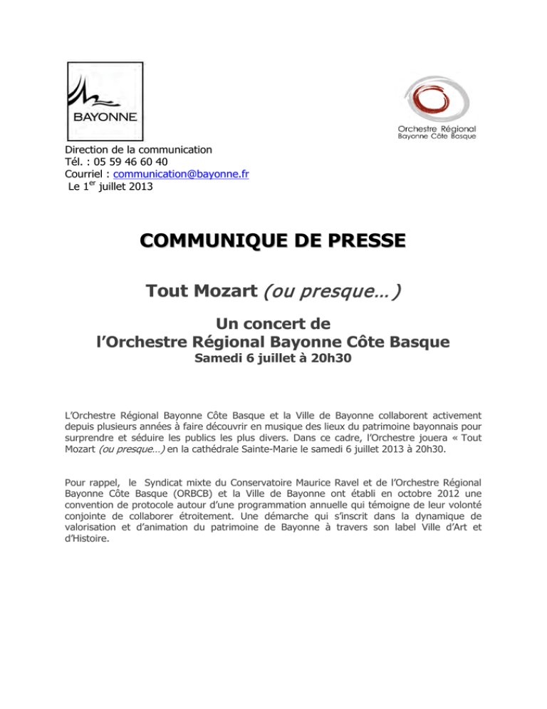 Direction de la communication Tél. : 05 59 46 60 40 Courriel : [email protected] Le 1er juillet 2013 COMMUNIQUE DE PRESSE Tout Mozart (ou presque… ) Un concert de l’Orchestre Régional Bayonne Côte Basque Samedi 6 juillet à 20h30 L’Orchestre Régional Bayonne Côte Basque et la Ville de Bayonne collaborent activement depuis plusieurs années à faire découvrir en musique des lieux du patrimoine bayonnais pour surprendre et séduire les publics les plus divers. Dans ce cadre, l’Orchestre jouera « Tout Mozart (ou presque…) en la cathédrale Sainte-Marie le samedi 6 juillet 2013 à 20h30. Pour rappel, le Syndicat mixte du Conservatoire Maurice Ravel et de l’Orchestre Régional Bayonne Côte Basque (ORBCB) et la Ville de Bayonne ont établi en octobre 2012 une convention de protocole autour d’une programmation annuelle qui témoigne de leur volonté conjointe de collaborer étroitement. Une démarche qui s’inscrit dans la dynamique de valorisation et d’animation du patrimoine de Bayonne à travers son label Ville d’Art et d’Histoire. Tout Mozart (ou presque… ) Wolfgang Amadeus Mozart : Ultime escale de notre périple musical: un jardin d'absolu. Absolue beauté, absolue harmonie, absolue grandeur, émouvant, absolument. Fratres de l'Estonien Arvo Pärt servira d'introduction poétique à l'univers somptueux de ces deux chefs d'œuvre mozartiens. Un souffle venu d'ailleurs et deux monuments sonores à la gloire de l'homme et de son créateur: la Symphonie Jupiter et la Grande Messe en ut mineur représentent peutêtre une partie du testament universel du compositeur autrichien face à l'humanité. Wolfgang Amadeus Mozart Symphonie n°41 kv551 "Jupiter" (1788) Grande Messe kv427 pour Soli, chœur et orchestre (1783) Arvo Pärt Fratres pour cordes et percussions (2010) Anne Paumard et Véronique Couchot (soprani), Sébastien Paulini (ténor), Daniel Boulin (basse), Chœurs de l’ORBCB Chef de chœur : Laëtitia Casabianca Direction : Philippe Forget L’Orchestre Régional Bayonne Côte Basque > L’Orchestre Régional Bayonne Côte Basque (ORBCB) est une formation de 35 musiciens à laquelle se joint une quinzaine de musiciens supplémentaires selon les besoins de la programmation. Crée ne 1974, il s’est donné pour mission la diffusion mais aussi l’accompagnement des publics à travers un parcours artistique de qualité toujours innovant. Une belle programmation est proposée au public chaque année, reflet de la vitalité de l’établissement et de son territoire. Chaque saison de l’ORBCB est construite avec ses partenaires de proximité, en réponse aux attentes locales. L’ORBCB est porté conjointement avec le Conservatoire Maurice Ravel par l’Agglomération Côte Basque Adour (Bayonne, Biarritz, Anglet, Boucau, Bidart) ainsi que les villes de Saint-Jean-de-Luz et Hendaye. Philippe Forget, chef d’orchestre > Philippe Forget se forme auprès de Philippe Cambreling, puis de Wolfgang Harrer à Budapest avant de suivre James Conlon à l'Opéra-Bastille. Il est chef d'orchestre associé à la Camerata de Bourgogne avant d'être nommé chef d'orchestre en Résidence depuis 2008 auprès de l'Orchestre Régional Bayonne-Côte Basque où il y dirige plusieurs productions symphoniques chaque saison. C'est un invité régulier de grandes formations tel que l'Opéra National de Lyon. Il a également dirigé l'Orchestre National de Lyon, l'Orchestre Symphonique de Campinas/Sao Paulo, l'Orchestre National de Thessalonique et avec lequel il entame une nouvelle collaboration (septembre 2013 : Verdi/Wagner et mai 2014 : Lutoslawski/Rachmaninov).En 2012, son opéra de chambre Macbeth est créé avec la Compagnie de l'Opéra-Théâtre et les solistes de l'Orchestre National de Lyon. Philippe Forget est un ardent défenseur des répertoires français d'hier et d'aujourd'hui et inscrit régulièrement à son répertoire les oeuvres de M.Ravel, Cl.Debussy, F.Poulenc, D.Milhaud, G.Pierné, O.Greif, Ph.Fénelon, Ph.Hersant, V.D'Indy... Il est aussi très présent dans de nombreux festivals et programmations en France et à l'étranger : Festival de Verbier (Suisse), Festivals de Ramsgate et d'Edimbourg (UK), Festivals ENARTE et Theatro da Paz (Brésil), Cami Hall et Brandeis University de New-York, Festivals d'Ambronay, Automne en Normandie, France Musique, Studio de l'Opéra de Paris, radios et télévisions libanaise, brésilienne. Il dirigera à l'Opéra National de Lyon en décembre 2013 Les Contes d'Hoffman et en février 2014 Tender Land ainsi que la création de Roland Auzet Steve V, en tournée en 2014 et 2015 (Opéra de Limoges). Anne Paumard et Véronique Couchot (soprani) Sébastien Paulini (ténor), Baniel Boulin (basse) > A l’occasion de son concert Tout Mozart (ou presque), l’ORBCB met à l’honneur d’anciens élèves du conservatoire Maurice Ravel. Aujourd’hui artistes professionnels ou amateurs, ils poursuivent chacun leur passion pour le chant lyrique en approfondissant leur formation ou en intégrant des chœurs et des productions nationales de qualité. Chacun ayant déjà pu participer à des spectacles lyriques de la saison de l’Orchestre Régional Bayonne Côte Basque (La Veuve Joyeuse de Franz Lehar ou Le Messie d’Haendel), c’est avec plaisir qu’ils reviennent pour ce grand concert de la saison estivale, dans ce lieu fabuleux qu’est la Cathédrale de Bayonne. Pratique > Tarif : 35 € / réduit : 29 € / étudiants et jeunes de 12-20 ans: 15 € / enfants - de 12 et élèves CRR: gratuit / formule Piccolo (un adulte + un élève mineur): 15 € Billetterie et réservations à l’Office de tourisme de Bayonne +33 (0) 820 42 64 64, sur www.ticketnet.fr et sur www.fnac.com, ou sur place le soir du concert. Plus d’informations : www.orbcb.fr / www.bayonne.fr