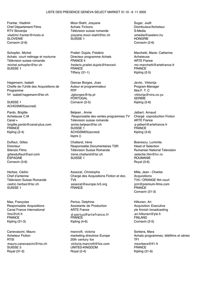 LISTE DES PRESENCE GENEVA SELECT MARKET 31.10 - 6 .11 2005 Frantar, Vladimir Chef Département Films RTV Slovenjia [email protected] SLOVENIE Cornavin (2-6) Moor-Stahl, Josyane Achats Fictions Télévision suisse romande [email protected] SUISSE 1 Sugar, Judit Distributeur/Acheteur S-Media [email protected] HONGRIE Cornavin (2-6) lispre Schopfer, Michel Achats court métrage et nocturne Télévision suisse romande [email protected] SUISSE 1 lispre Prallet- Dujols, Frédéric Directeur programme Achats FRANCE 4 frederic.prallet.dujols@france4. FRANCE tv Tiffany (31-1) lispre Marchetti, Marie- Catherine Acheteuse ARTE France [email protected] FRANCE Kipling (2-5) Hagemann, Isabell Cheffe de l’Unité des Acquisitions de Programme tsr [email protected] Garcao Borges, Joao Auteur et programmateur RTP [email protected] PORTUGAL Cornavin (2-5) lispre Jevtic, Viktorija Program Manager Nira F. T. C [email protected] SERBIE Kipling (3-6) lispre Beljean , Annie Responsable des ventes programmes TV Télévision suisse romande [email protected] SUISSE 1 ACHGSM05(accred) lispre () Jalbert, Arnaud Chargé coproduction Fiction ARTE France [email protected] FRANCE Kipling (3-6) SUISSE 1 ACHGSM05(accred) préinvit 2005 Pardo, Brigitte Acheteuse C.M Canal + [email protected] FRANCE Kipling (2-4) Duffaut, Gilles Directeur Silenzio Films [email protected] ESPAGNE Cornavin (3-6) Challand, Irène Responsable Documentaires TSR Télévision Suisse Romande [email protected] SUISSE 1 Boerescu, Luminita Head of Selection Rumanian National Television [email protected] ROUMANIE Royal (3-6) Herbez, Cédric Chef d’antenne Télévision Suisse Romande [email protected] SUISSE 1 Assezat, Christophe Chargé des Acquisitions Fiction et doc. TV5 [email protected] FRANCE Mille, Jean - Charles Acquisitions TV5 / ORANGE film court [email protected] FRANCE Cornavin (31-3) Mas, Françoise Responsable Acquisitions Canal France International [email protected] FRANCE Kipling (31-3) lispre Pertus, Delphine Assistante de Production ARTE France [email protected] FRANCE Kipling (4-6) Hiltunen, Ari Acquisition Executive yle finnish broadcasting [email protected] FINLAND Cornavin (2-5) lispre Canevascini, Mauro Acheteur Fiction RTSI [email protected] SUISSE 3 Royal (31-3) marcroft, victoria marketing directrice Europe 20th century fox [email protected] UNITED-KINGDOM Royal (2-4) lispre Sorbera, Mara Achats programmes, téléfilms et séries TF1 [email protected] FRANCE Kipling (31-6) lispre lispre lispre LISTE DES PRESENCE GENEVA SELECT MARKET 31.10 - 6 .11 2005 Krovakova, Helena In charge of Feature Films Acquisition Czech Television [email protected] Czech Republic Kipling (1-4) ACHGSM05 MARKET Yao, Guo Qiang Acheteur Cine TV [email protected] FRANCE Kipling (2-5) Gaucher, Catherine Directrice adjointe Acquisitions FRANCE 4 [email protected] FRANCE Tiffany (31-1) lispre Hadji, Olga Head of Acquisition ERT HELLENIC BROADCASTING CORP [email protected] GRECE Kipling (3-5) lispre zannetti, alessandra Acquisitions and Co-productions raisat s.p.a. [email protected] ITALIE Kipling (3-5) Geambasu, Cornelia Roxana Acquisition & Sales exécutive ROMANIAN TELEVISION [email protected] ROUMANIE Royal (3-6) Larrieu, Roger-André Chargé Corproductions Internationales FRANCE 3 [email protected] FRANCE Royal (2-4) GARIC, Tatjana Nira F.T.C. Serbie Kipling (3-6) lispre HABIB, CATHERINE Acquisitions Orange film court FRANCE lispre BRUNAUD, Jérôme Sale Agent [email protected] ALLEMAGNE Kipling (2-4)