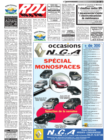 L' NDEPENDANT Annonce tites s Pe Centre Auto Feu Vert de ARQUES Recherche MÉCANICIEN Divers Achète Meubles , Objets anciens , etc... Successions S.LUGEZ - ST-OMER 쏼 03 21 98 55 24 - Port. 06 87 12 05 98 MarieMadeleine MAURIES ANTIQUITÉS achète anciens meubles, objets, bibelots, porte, boiseries, cheminées, fer forgé, statues, successions, débarras, etc... COULOMBY - 03 21 95 30 43 Envoyer lettre de motivation + CV à Achète meubles anciens, bibelots, lustres, pendules, cheminées, boiseries, vitraux, statues, tables, fauteuils. Débarras complet maison. Denis Mauries, Coulomby. Tél. 03 21 39 72 57, réf. 4280 Vds poulets blancs, roux et pintades démarrés, du 12 au 28 juin. Jean-Paul Carpentier, 7 rue d’Ecuire, 62560 Thiembronne. Tél. 03 21 39 56 35, réf. 4474 Vds cse retraite coffret de chantier EDF 100€, cintreuse à fer à béton 30€, volige décorative 18mm 3€ /m2, groupe électrogène 1500w 70€, touret à meuler Peugeot 40€ , bureau bois 30€ , armoire bureau métal 40€. Tél. 06 76 85 00 73, réf. 4557 Donne remblai contre enlèvement, possibilité chargement (Coulomby). Tél. 03 21 39 72 57, réf. 4565 Salon d’angle en simili cuir, 100€. Abri de jardin en métal, 60€. Meuble ancien 300€. Rameur David Douillet, 50€. Tél. 03 28 41 46 93 Vds buffet parisien chêne 280€. Coiffeuse 100€. Buffet art. déco 1930, 130€. Vitrines 130€ . Buffet 1940, 100€ . Salon tissu 150€. Tél. 03 28 42 28 33, 06 29 53 22 56. Vends hangar métallique fer I, long. 45 m, larg. 25 m, h. 9 m, à démonter. Tél. 03 28 42 18 07 ap. 18 h. Cause déménagement vends marcheur neuf, 100€ . Canapé divan neuf, bois et velours, 400€. Tél. 06 15 01 25 21. Vends presse petits ballots marque John Deere N224. Tél. 03 28 40 19 96. Vends micro-tracteur Iseki, 15 cv, diesel, 4 roues motrices relevage 3 points. Tél. 03 28 42 54 09. Vends chambre fille pin rose nacré, lit 1 pers. + chevet + chiffonnier + bureau, T.B.E., 230€. Tél. 03 28 49 07 69. Vds poules de réforme, 2€ vivantes ou 4€ pac. 10 achetées 1 gratuite, à Fiefs. Tél. 03 21 04 61 70 ou 03 21 04 66 75 Vds diverses pièces Mercedes E série W211, 1 capot avant + calandre (phares ronds), 1 capot avant + pare choc ar série W210, etc. Tél. 03 21 67 48 57 le soir Vds poulains Connemara (2M 1F) nés en 2006. Couvée canards de barbarie avec la mère. Tél. 03 21 04 64 58 Cède, cimetière de Le Parcq, concession perpétuelle 4 places, avec caveau neuf, sans monument, moins 25% du prix actuel. Tél. 03 22 46 08 08 Vds remorque 9t, essieu neuf, en l’état. Tél. 03 21 41 15 66 le soir ou 06 08 18 75 07 Vds jument et pouliche boulonnaise, très douce, cause surnombre. Tél. 03 21 73 39 88 HR Vds anon 15 mois, déclaré, pucé. Tél. 03 21 81 67 94 Vds 2 chiots griffon korthall (2M), nés le 22/02, mère 2ALV 466. Tél. 03 21 86 16 58 ou 06 07 71 67 50 Vds 2e coupe RGI sur pied,5t pulpes sèches 160€/t, foin 2006, auge roul 6m fond refait 700€. Tél. 06 79 18 23 86 rég Auxi. Cherche bois sur pied ou déjà coupé. Tél. 06 03 88 12 79 A réserver chiots setter gordon, 5M 2F, nés le 31/05, mère 2CCK 031, chasse. Tél. 06 14 19 27 82 Vds jument SF 11 ans, pleins papiers, 1,70m au garrot, très douce, baie, 2.000€. Tél. 03 21 06 08 56 Eleveur vend viande de porc (1/2 piétrain) ou bovine (primipare limousine), très gde qualité, caissette ou 1/2 carcasse (porc), px intér. Bomy. Tél. 03 21 95 72 69, réf. 4442 Annonce tites s e P FEU VERT SARL MENTOR 29 Av. des Frais Fonds 62510 ARQUES Sté propose job d’été à étudiante sérieuse, pour activité à temps partiel. Tél. 06 08 62 46 33, réf. 4682 Transport Dumont frigorifique recherche urgent chauffeurs permis E/C, FCOS oblig, poste basé à Aire/La Lys. Tél. 03 21 28 00 28, réf. 408G Recherche magasinier vendeur en matériel agricole. Tél. 03 21 27 14 31, réf. 426G Emploi OPEL ST-OMER RECHERCHE RESPONSABLE VO Minimum BAC + 2, Solide expérience automobile indispensable Contactez pour RDV, Patrick LEMOINE au 03 21 38 67 76 SOCIÉTÉ DE 61 LOCATION DE MATÉRIEL recherche 1 chauffeur routier SPL pour conduite porte chars, connaissances en mécanique et bras grue exigées 1 mécanicien/chef d’atelier 1 électro-mécanicien de maintenance avec connaissances en groupe électrogène exigées Envoyer CV et lettre de motivation à la Société M.E.I. 23 bis, route des 7 Planètes, BP 22, 59380 BIERNE 콯 03 28 20 60 29 A votre service pr pose parquet, tapiss, peint, entretien espaces verts, travaux intér extér. Part avec réf. Paiement CESU (chq empl serv universel), tél. 03 21 98 52 63 ou 06 60 53 08 51, réf. 414G Entreprise Travaux Agricoles et T.P. Recherche CHAUFFEUR POLYVALENT Famille d’accueil agréée recherche personnes âgées H ou F, valides, semi-valides ou invalides. Tél. 03 21 86 56 38, réf. 424G *Stock cumulé des concessions r de Calais et St Ome Eleveur vend viande de porc (1/2 piétrain) ou bovine (primipare limousine), très gde qualité, caissette ou 1/2 carcasse (porc), px intér. Bomy. Tél. 03 21 95 72 69, réf. 4652 Vds chiots chihuahua, 1M 2F (mère 2DFV 786). Tél. 03 21 12 10 80, réf. 4653 Vds bélier race sulfok pour reproduction ou viande 2€ 60/kg + donne fumier d’âne et mouton contre enlèvement. Tél. 03 21 39 21 64 ou 06 28 38 96 94, réf. 4673 Vds vélo d’appart tt équipé 300€, vds TV 67 Manhatan 300€. Tél. 06 08 26 20 52, réf. 4674 Vds porte de garage basculante standard, 1 scarificateur à gazon Bosch servi 1 fois. Tél. 03 21 98 03 18, réf. 4675 Vds remorque pour motoculteur, plateau 1m x 1m60, en l’état, 500€ et broyeur watermatic, 150€. Tél. 03 21 93 83 92, réf. 4676 Vds poulets blancs démarrés vaccinés, du 22 juin au 4 juillet. Upen d’Amont Delettes. Tél. 03 21 95 50 21, réf. 4677 Vds remorque carlu 4 roues 5T, fourragère ridelle tube élargi 450€ , rem 4r bois 250€, élévateur tapis plat 6m 150€, dist zaf 803, 300€. Tél. 03 28 43 62 46, réf. 4678 V
