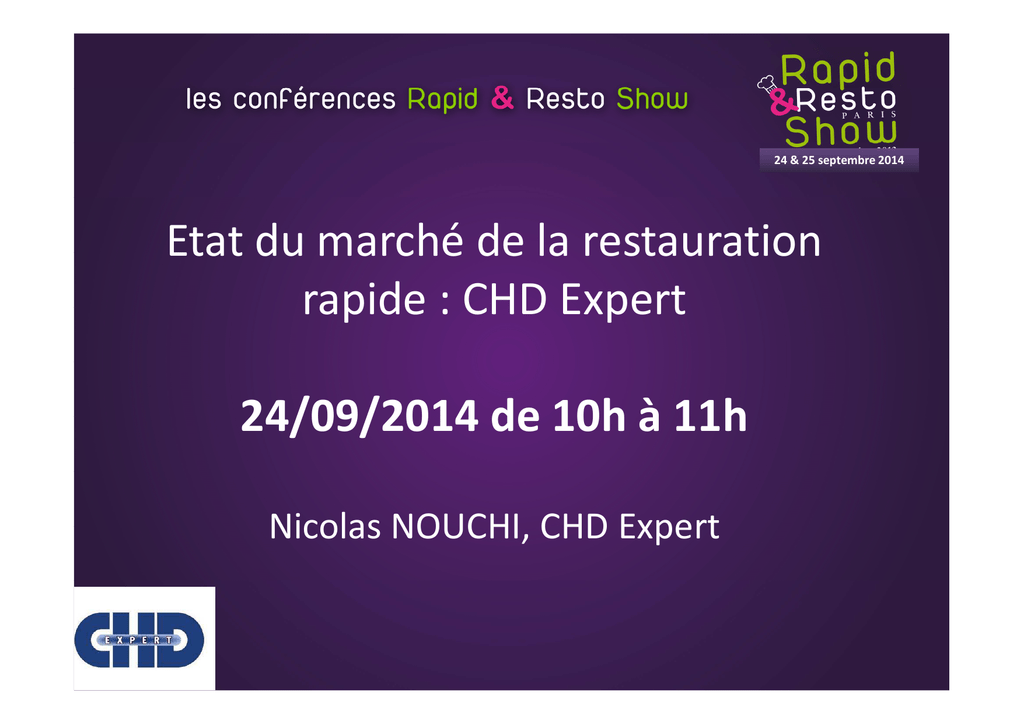24 & 25 septembre 2014 Etat du marché de la restauration rapide : CHD Expert 24/09/2014 de 10h à 11h Nicolas NOUCHI, CHD Expert Les sources exploitées par CHD Expert Technomic : http://www.technomic.com Données analyse marché CHD Expert Une veille et un concentré de quelques constats issus de nos baromètres et nos études comportementales marché, ainsi que nos enquêtes nationales Communauté de Consommateurs en Foodservice CHD Expert : enquête Flash USA/France/Bresil et Allemagne Analyse des consommateurs hors domicile : Enquête réalisée le 05 Septembre 2014 sur 500 consommateurs Excellence in Foodservice Information DATA • TECHNOLOGY • INSIGHT • SERVICES RAPIDRESTO SHOW 2014 — Page 2 LE MARCHE FRANCAIS Excellence in Foodservice Information DATA • TECHNOLOGY • INSIGHT • SERVICES RAPIDRESTO SHOW 2014 — Page 3 LES SOLUTIONS REPAS 1- Restauration des consommateurs chez soi, à domicile 2- Les lieux de restauration des consommateurs à l’extérieur RESTAURATION COMMERCIALE Restauration commerciale à table RESTAURATION COLLECTIVE Restauration rapide Circuits de vente alternatifs Travail Restaurants d’entreprises et d’administrations Maison de retraite Restauration hospitalière Boulangeries-Pâtisseries, Terminaux de cuisson, Traiteurs, GMS, Distributeurs automatiques Santé Restauration hospitalière Enseignement Restaurants scolaires et universitaires Autres sociales/Loisirs Gamelle au bureau Excellence in Foodservice Information DATA • TECHNOLOGY • INSIGHT • SERVICES RAPIDRESTO SHOW 2014 — Page 4 Poids des segments dans la consommation des repas du midi, en semaine… En restauration à table 11.2% 11.2% 9.7% En restauration rapide sur place ou à emporter 13.8% 9.6% 9.2% Restauration spécialisé dans la livraison 9.7% 7.6% 6.2% En boulangeries 5.1% 10.2% 8.2% En cafétéria/Self/Buffet 4.1% 10.2% 5.6% En restauration d’entreprise 4.6% 6.6% 8.2% En épicerie de proximité/Deli’s 9.2% 7.3% 6.2% En station service 4.6% 3.3% 4.1% Votre propre repas amené au bureau (gamelle) 15.8% 12.5% 9.2% A la maison ou au domicile d’un ami 17.9% 17.2% 28.7% Autres : Avion, Train, Distributeur Automatique 4.1% 4.3% 4.6% Note de lecture : 9,7% des déjeuners pris dans le mois en France à midi, en semaine ont été pris en Excellence in Foodservice Information à table DATA • TECHNOLOGY • INSIGHT •restauration SERVICES 100% 100% 100% RAPIDRESTO SHOW 2014 — Page 5 Grandes tendances LES SOLUTIONS REPAS en RAT RAT 105 000 établissements CA moyen 386 000€ TMR hors boissons 19,00€ TTC Nombre de couverts moyen par jour 58 Secteur atomisé Majorité d’exploitants indépendants proposant un thème de restauration traditionnel, comptant moins de 5 salariés Amélioration de l’offre standard plus qualitative et plus renouvelée, plus saine ! Accompagnements (légumes, féculents) valorisés et variés Maîtrise de l’offre vins Augmentation de la proposition et de l’offre de vins au verre Développement progressif de la communication sites Internet et les réseaux sociaux Promotions commerciales de plus en plus agressives Développement d’activités complémentaires offre à emporter Excellence in Foodservice Information DATA • TECHNOLOGY • INSIGHT • SERVICES RAPIDRESTO SHOW 2014 — Page 6 L’évolution en RAT De la cuisine Bistrot ou de la cuisine Gastronomique … à la « Bistronomie » AVANT AUJOURD’HUI Une ambiance Bistrot avec des produits et cuisine dignes d’un restaurant Gastronomique OU Offre qualitative et gourmande Un service décomplexé et décontracté Un concept à un prix abordable Excellence in Foodservice Information DATA • TECHNOLOGY • INSIGHT • SERVICES RAPIDRESTO SHOW 2014 — Page 7 Grandes tendances LES SOLUTIONS REPAS en Restauration Rapide RESTAURATION RAPIDE 39 000 établissements CA moyen 380 300€ TMR hors boissons 8,70€ TTC Nombre de couverts moyen par jour 69 Secteur plus dynamique que celui de la RAT et qui se professionnalise MAIS une saturation du marché du Fast-food : Intensification de la concurrence alors que la demande stagne Impact fort des enseignes Segmentation en hausse : création de nouveaux concepts/thématiques Théâtralisation et mise en scène de l’espace de vente. Développement massif d’une offre classique et économique Proposition d’une offre plus gourmande, saine, voire « Fait Maison » pour répondre aux nouvelles attentes des clients Intensification des offres promotionnelles et de fidélisation Excellence in Foodservice Information DATA • TECHNOLOGY • INSIGHT • SERVICES RAPIDRESTO SHOW 2014 — Page 8 L’évolution enREPAS Restauration Rapide LES SOLUTIONS Du Restaurant-Snack classique… … Au Fast Casual Une montée en gamme AVANT AUJOURD’HUI Recettes plus élaborées avec des produits de qualité et plus sains (frais, du terroir…) Offre variée Lieux design et modernes (ambiance, décoration et mobilier) Prix très étudié Excellence in Foodservice Information DATA • TECHNOLOGY • INSIGHT • SERVICES RAPIDRESTO SHOW 2014 — Page 9 Grandes tendances Boulangerie-Pâtisserie LES SOLUTIONS REPAS en BoulangerieBOULANGERIESPÂTISSERIES 33 000 établissements CA moyen 295 000€ Formule 5,90€ TTC Prix moyen du Sandwich 3,40€ TTC Poids de l’offre salée dans le CA total (90% des ets) : 13% en 2013 contre 12% en 2011 Secteur dynamique qui concurrence directement la RAT traditionnelle et la restauration rapide, en particulier le midi Poids important des enseignes/groupes Paul leader Boulangers-Artisans dominent le marché Concurrent direct de la RAT traditionnelle et de la restauration rapide En particulier le midi Recherche de relais de croissance à la vente de pain offre à emporter et sandwichs Proposition d’un espace de restauration à table et sur place Excellence in Foodservice Information DATA • TECHNOLOGY • INSIGHT • SERVICES RAPIDRESTO SHOW 2014 — Page 10 L’évolution enREPAS BoulangerieBoulangerie-Pâtisserie LES SOLUTIONS