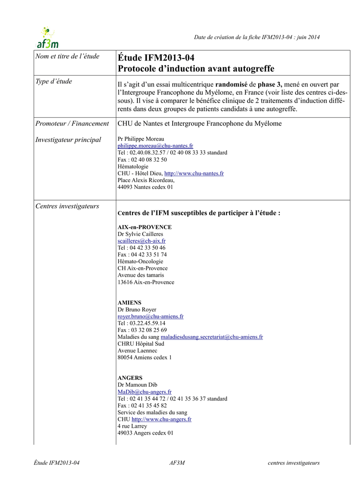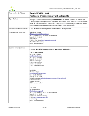Date de création de la fiche IFM2013-04 : juin 2014 Nom et titre de l’étude Étude IFM2013-04 Protocole d’induction avant autogreffe Type d’étude Il s’agit d’un essai multicentrique randomisé de phase 3, mené en ouvert par l’Intergroupe Francophone du Myélome, en France (voir liste des centres ci-dessous). Il vise à comparer le bénéfice clinique de 2 traitements d’induction différents dans deux groupes de patients candidats à une autogreffe. Promoteur / Financement CHU de Nantes et Intergroupe Francophone du Myélome Investigateur principal Pr Philippe Moreau [email protected] Tel : 02.40.08.32.57 / 02 40 08 33 33 standard Fax : 02 40 08 32 50 Hématologie CHU - Hôtel Dieu, http://www.chu-nantes.fr Place Alexis Ricordeau, 44093 Nantes cedex 01 Centres investigateurs Centres de l’IFM susceptibles de participer à l’étude : AIX-en-PROVENCE Dr Sylvie Cailleres [email protected] Tel : 04 42 33 50 46 Fax : 04 42 33 51 74 Hémato-Oncologie CH Aix-en-Provence Avenue des tamaris 13616 Aix-en-Provence AMIENS Dr Bruno Royer [email protected] Tel : 03.22.45.59.14 Fax : 03 32 08 25 69 Maladies du sang [email protected] CHRU Hôpital Sud Avenue Laennec 80054 Amiens cedex 1 ANGERS Dr Mamoun Dib [email protected] Tel : 02 41 35 44 72 / 02 41 35 36 37 standard Fax : 02 41 35 45 82 Service des maladies du sang CHU http://www.chu-angers.fr 4 rue Larrey 49033 Angers cedex 01 Étude IFM2013-04 AF3M centres investigateurs Date de création de la fiche IFM2013-04 : juin 2014 Nom et titre de l’étude Étude IFM2013-04 Protocole d’induction avant autogreffe ANNECY / PRINGY Dr Frédérique Orsini-Piochelle [email protected] Tel : 04.50.63.66.08 Fax : 04 50 63 61 54 Centre Hospitalier de la région d'Annecy Sce Hémato clinique 1 av Hl Metz-Tezzy BP 90074, 74374 Pringy ARGENTEUIL Dr Véronique Morel-Malek Tel : 01 34 23 24 05 Fax : 01 34 23 10 12 Hématologie Centre Hospitalier Argenteuil Victor Dupouy 69 rue du Lieutenant colonel Prud’hom 95100 Argenteuil AVIGNON Dr Gérard Lepeu [email protected] Tel : 04.90.80.16.78 Fax : 04 32 75 31 22 Hématologie Centre Hospitalier H.Duffaut 305 rue R.Follereau 84902 Avignon cedex 09 BAYONNE Dr Anne BANOS [email protected] Tel : 05 59 44 38 32 / 05 59 44 35 35 standard Hématologie Centre hospitalier de la côte basque http://www.ch-cote-basque.fr 13 av. de l’interne Jacques Loëb 64 109 Bayonne BESANÇON Dr Jean Fontan [email protected] Tel : 03.81.66.82.32 Hématologie Hôpital Jean Minjoz Boulevard Fleming 25030 Besançon cedex BLOIS Dr Philippe Rodon [email protected] Tel : 02.54.55.64.05 Fax : 02 54 55 67 37 Médecine interne Centre Hospitalier 41016 Blois cedex Étude IFM2013-04 AF3M centres investigateurs Date de création de la fiche IFM2013-04 : juin 2014 Nom et titre de l’étude Étude IFM2013-04 Protocole d’induction avant autogreffe BOBIGNY Dr Philippe Casassus [email protected] Tel : 01.48.95.53.52 Fax : 01 48 95 54 99 Hématologie Hôpital Avicenne 125 route de Stalingrad 93009 Bobigny cedex BORDEAUX Dr Olivier Fitoussi [email protected] Tel : 05 56 43 73 54 Fax : 05 56 43 70 64 Polyclinique Bordeaux Nord Aquitaine Onco-Hématologie 15 à 33 rue Claude Boucher 33300 Bordeaux BORDEAUX / PESSAC Pr Gérald Marit, [email protected] Tel : 05 57 65 65 65 standard Fax : 05 57 65 65 14 Maladies du sang CHRU – Hôpital du Haut Lévêque http://www.chu-bordeaux.fr Centre François Magendie Avenue de Magellan 33604 Pessac BREST Dr Jean-Richard Eveillard Tel : 02.98.22.34.45 Fax : 02 98 22 33 86 Hématologie Hôpital A.Morvan 5 avenue Foch 29609 Brest cedex CAEN Dr Margaret Macro [email protected] CHU Caen Côte de Nacre Hématologie Avenue G.Clemenceau 14033 Caen cedex Étude IFM2013-04 AF3M centres investigateurs Date de création de la fiche IFM2013-04 : juin 2014 Nom et titre de l’étude Étude IFM2013-04 Protocole d’induction avant autogreffe CAEN Dr Jean-Pierre Vilque [email protected] Tel : 02 31 45 51 44 Médecine interne Hématologie Centre F.Baclesse Route de Lion sur mer 14021 Caen cedex CERGY-PONTOISE Dr Riad Benramdane [email protected] Centre Hospitalier René Dubos 6, avenue de l'Ile-de-France 95303 Cergy Pontoise Cedex CHALON-sur-SAONE Dr Laurent Voillat [email protected] Tel : 03 85 44 64 51 Fax : 03 85 44 67 01 Hémato-Oncologie Centre Hospitalier William Morey BP 120, 71 321 Chalon-sur-Saône cedex CHAMBERY Dr Selim Corm [email protected] Tel : 04 79 96 51 05 Fax :04 79 96 56 53 CH - Sce Hématologie BP1125, 73011 Chambéry cedex CHARTRES / LE COUDRAY Dr Michel Maigre [email protected] Tel 02 37 30 30 77 CH de Chartres Hôpital Louis Pasteur, 28630 Le Coudray CLAMART Pr François Boué [email protected] Hôpital Antoine Béclère Médecine Interne 157 rue de la Porte de Trivaux 92141 Clamart Étude IFM2013-04 AF3M centres investigateurs Date de création de la fiche IFM2013-04 : juin 2014 Nom et titre de l’étude Étude IFM2013-04 Protocole d’induction avant autogreffe CLAMART Pr Thierry de REVEL [email protected] Tel : 01 41 46 63 01 Fax : 01 41 46 64 55 Hématologie Hôpital d’instruction des armées Percy 101 avenue H.Barbusse 92141 Clamart cedex CLERMONT-FERRAND Dr Joël Fleury [email protected] Tel : 04 73 99 43 90 Fax : 04 73 99 44 27 Unité d’Oncologie Médicale Pôle Santé République 105 avenue de la République 63 050 Clermont-Ferrand CLERMONT-FERRAND Dr Carine Chaleteix [email protected] Tel : 04.73.31.60.28 Hématologie CHRU - Hôtel Dieu BP 69, 63003 Clermont-Ferrand cedex COLMAR Dr Bruno Audhuy [email protected] Tel : 03 89 12 41 02 Fax : 03 89 12 43 43 Onco-hématologie CH Louis Pasteur 39 avenue de la liberté 68024 Colmar cedex CORBEIL-ESSONNES Dr Bertrand Joly [email protected] Sce Hématologie Clinique CH Francilien - Hopital Gille de Corbeil 59 Bd H Dunant 91106 Corbeil-Essonnes CRETEIL Dr Karim Belhadj [email protected] Tel : 01 49 81 49 63 Fax : 01 49 81 20 67 Hématologie CHU Henri Mondor 51 avenue du Maréchal de Lattre de Tassigny 94 010 Créteil Étude IFM2013-04 AF3M ce