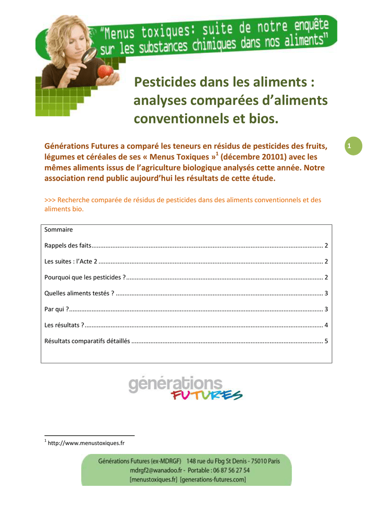 Pesticides dans les aliments : analyses comparées d’aliments conventionnels et bios. Générations Futures a comparé les teneurs en résidus de pesticides des fruits, légumes et céréales de ses « Menus Toxiques »1 (décembre 20101) avec les mêmes aliments issus de l’agriculture biologique analysés cette année. Notre association rend public aujourd’hui les résultats de cette étude. >>> Recherche comparée de résidus de pesticides dans des aliments conventionnels et des aliments bio. Sommaire Rappels des faits ...................................................................................................................................... 2 Les suites : l’Acte 2 .................................................................................................................................. 2 Pourquoi que les pesticides ? .................................................................................................................. 2 Quelles aliments testés ? ........................................................................................................................ 3 Par qui ? ................................................................................................................................................... 3 Les résultats ? .......................................................................................................................................... 4 Résultats comparatifs détaillés ............................................................................................................... 5 1 http://www.menustoxiques.fr 1 Rappels des faits Entre juillet et septembre 2010, notre association, Générations Futures, avait acheté dans divers supermarchés de l’Oise et à Paris, des aliments non bios composant les repas types d’une journée d’un enfant d’une dizaine d’années. Nous avions alors composé 4 repas et un encas. Nous avions fait rechercher diverses substances chimiques par plusieurs laboratoires accrédités. Les résultats de cette première enquête, publiée en décembre 2010, montraient qu’en 24h, un enfant était susceptible d’être exposé, uniquement par son alimentation, à des dizaines de molécules chimiques soupçonnées d’être cancérigènes ou encore soupçonnées d’être des perturbateurs endocriniens ! Nous avions alors trouvé : 128 résidus chimiques représentant 81 substances chimiques différentes avec 47 substances différentes cancérigènes suspectées et 37 perturbateurs endocriniens suspectés en une seule journée! La palme ayant été attribuée aux pesticides avec 36 molécules différentes ingérées en une seule journée dont 17 cancérigènes et perturbateurs endocriniens ! Les suites : Acte 2 Suite à la parution de cette enquête et aux résultats obtenus, nombreuses sont les personnes qui ont souhaité savoir si il y avait une réelle différence entre les menus non bio étudiés et des repas composés avec des aliments issus de l’agriculture biologique. Nous sommes donc partis en quête de la réponse, en nous concentrant sur les résidus de pesticides et avons acheté nos produits de la même manière que lors de la première étude c’est-à-dire en achetant, des aliments bio chez divers distributeurs (magasins spécialisés en bio et grandes surfaces) et en suivant un protocole stricte de collecte (photos des lieux et denrées, référencement précis des échantillons, conservation de toutes les preuves d’achat etc.). Pourquoi uniquement les pesticides ? La grande différence entre les pratiques culturales et de stockage des aliments bio et non bio réside dans l’usage, ou non, de pesticides de synthèse. La majorité des autres polluants que nous avions trouvé dans nos « menus toxiques » étaient des polluants environnementaux contrairement aux pesticides de synthèse qui sont épandus volontairement sur les cultures. Les sceptiques disent souvent que les cultures ne se font pas sous cloche et que donc les champs bios pourraient être contaminés par des pesticides pulvérisés sur les champs conventionnels. 2 Les opposants de l’AB mettent aussi fréquemment en doute le travail des professionnels de la bio qui pourraient avoir des pratiques non conforme à la législation. De ce fait, on met en doute la qualité des aliments bio au regard de la présence de résidus de pesticides de synthèse. Nous avons souhaité vérifier, par cette enquête, que la différence entre les produits bio et non bio est bien réelle et que les agriculteurs, les transformateurs ainsi que les certificateurs font un travail sérieux qui garantit le consommateur d’aliments bio des risques liés à la présence de pesticides. 3 Quelles aliments testés ? Nous avons repris exactement les mêmes fruits, légumes et jus que ceux testés dans nos menus toxiques de décembre 2010. Hormis les pêches qui à cette époque de l’année n’étaient plus disponibles. Nous les avons remplacées par des clémentines et pour être conforme aux résultats de 2010, nous avons aussi fait analyser des clémentines non bios pour pouvoir faire un réel parallèle. Ainsi ont été analysés au regard de la présence de résidus de pesticides : Pour le petit déjeuner bio : pain de mie bio, jus de raisin bio et pommes bio. Pour le déjeuner bio : laitue bio, tomates bio, haricots verts bio, raisins bio et baguette bio Au gouter un smoothie bio Et enfin pour notre dîner bio : salade mélange bio, riz Thai bio, citrons bio, clémentine bio et pain bio entier Par qui ? Nous avons fait appel à Fytolab (Belgique) pour cette recherche de résidus de pesticides. L’un des meilleurs en ce domaine. FYTOLAB est certifié entre autre par: L’Agence Fédérale pour la Sécurité de la Chaîne Alimentaire belge (AFSCA) pour l’analyse de pesticides, mycotoxines et nitrates dans l’alimentation. Le Ministère Belge de la Santé Public pour l’analyse de formulations de pesticides.( co