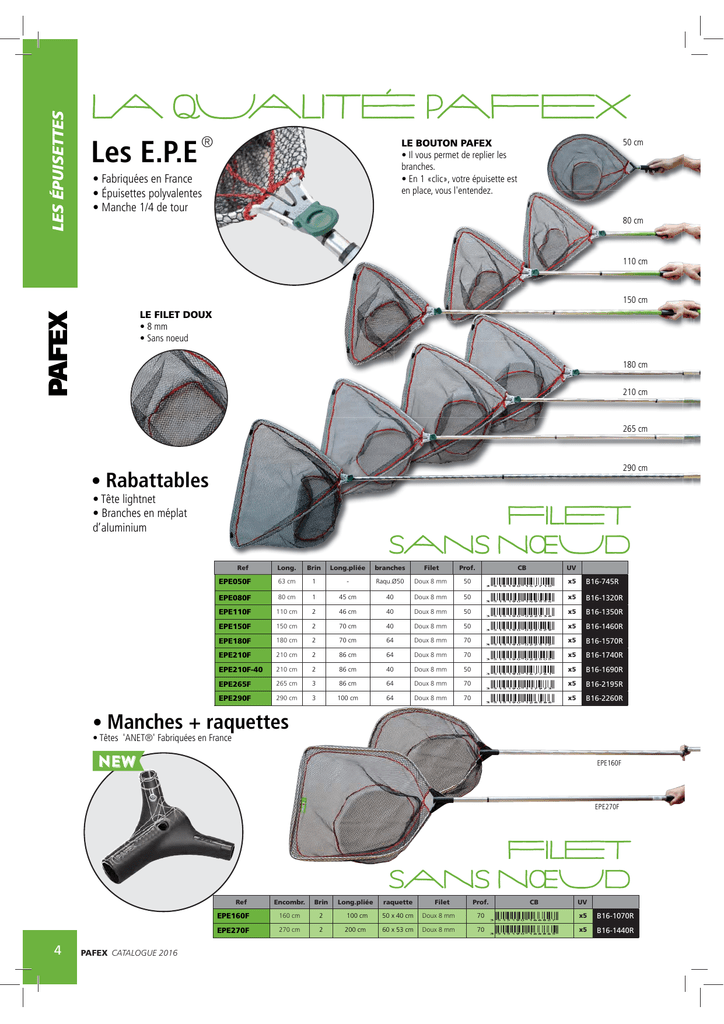 la qualité pafex Les E.P.E ® 50 cm LE BOUTON PAFEX • Il vous permet de replier les branches. • En 1 «clic», votre épuisette est en place, vous l'entendez. • Fabriquées en France • Épuisettes polyvalentes • Manche 1/4 de tour 80 cm 110 cm 150 cm LE FILET DOUX • 8 mm • Sans noeud 180 cm 210 cm 265 cm 290 cm • Rabattables • Tête lightnet • Branches en méplat d’aluminium filet sans nŒud Long. Brin Long.pliée branches Filet Prof. EPE050F Ref 63 cm 1 - Raqu.Ø50 Doux 8 mm 50 CB UV x5 B16-745R EPE080F 80 cm 1 45 cm 40 Doux 8 mm 50 x5 B16-1320R EPE110F 110 cm 2 46 cm 40 Doux 8 mm 50 x5 B16-1350R EPE150F 150 cm 2 70 cm 40 Doux 8 mm 50 x5 B16-1460R EPE180F 180 cm 2 70 cm 64 Doux 8 mm 70 x5 B16-1570R EPE210F 210 cm 2 86 cm 64 Doux 8 mm 70 x5 B16-1740R EPE210F-40 210 cm 2 86 cm 40 Doux 8 mm 50 x5 B16-1690R EPE265F 265 cm 3 86 cm 64 Doux 8 mm 70 x5 B16-2195R EPE290F 290 cm 3 100 cm 64 Doux 8 mm 70 x5 B16-2260R • Manches + raquettes • Têtes 'ANET®' Fabriquées en France EPE160F EPE270F filet sans nŒud Ref 4 PAFEX CATALOGUE 2016 Encombr. Brin Long.pliée raquette EPE160F 160 cm 2 100 cm 50 x 40 cm Doux 8 mm Filet Prof. 70 CB UV x5 B16-1070R EPE270F 270 cm 2 200 cm 60 x 53 cm Doux 8 mm 70 x5 B16-1440R 50 cm 80 cm 110 cm LE FILET RUBBER (ANTI-A) • 5 mm • Les Hameçons ne s'accrochent pas 150 cm 180 cm 210 cm 265 cm 290 cm Anti Accroche filet anti-a Long. Brin Long.pliée branches Filet Prof. EPE050R Ref 63 cm 1 - Raqu.Ø50 Rubber 5mm 50 CB UV x5 B16-965R EPE080R 80 cm 1 45 cm 40 Rubber 5mm 50 x5 B16-1540R EPE110R 110 cm 2 46 cm 40 Rubber 5mm 50 x5 B16-1570R EPE150R 150 cm 2 70 cm 40 Rubber 5mm 50 x5 B16-1680R EPE180R 180 cm 2 70 cm 64 Rubber 5mm 70 x5 B16-1890R EPE210R 210 cm 2 86 cm 64 Rubber 5mm 70 x5 B16-2060R EPE210R-40 210 cm 2 86 cm 40 Rubber 5mm 50 x5 B16-2010R EPE265R 265 cm 3 86 cm 64 Rubber 5mm 70 x5 B16-2515R EPE290R 290 cm 3 100 cm 64 Rubber 5mm 70 x5 B16-2580R EPE160R Ref CB LE MONOFILAMENT Encombr. Brin Long.pliée raquette Filet Prof. EPE160R 160 cm 2 100 cm 50 x 40 cm Rubber 5mm 70 UV x5 B16-1290R EPE270R 270 cm 2 200 cm 60 x 53 cm Rubber 5mm 70 x5 B16-1760R monofilament Encombr. Brin Long.pliée raquette Filet Prof. EPE160M Ref 160 cm 2 100 cm 50 x 40 cm Monofilament 80 CB UV x5 B16-1150R EPE270M 270 cm 2 200 cm 60 x 53 cm Monofilament 80 x5 B16-1520R PAFEX CATALOGUE 2016 5 accessoires Flotteur Ref UV RT-EPFLOT x3 B16-665R CB Flottant, longueur 17 cm et Ø 5 cm. Enlevez le velcro, le flotteur s'installe sur tous nos manches. Nouveau, peu cher, évite de perdre l'épuisette, dans les couleurs de pafex. Bâton de wading Alu Ref UV WAD130V B16-4775R x1 CB Bâton de wading Alu extrudé. Ce modèle est réglable de 70 cm à 1, 30 m. Pointe inox avec amortisseur antibruit, poignée Mousse. Nouveau cordon élastique plus solide, lesté de 150 gr. Modèle adopté par l’équipe de France de pêche à la mouche. Inox Ref UV BR-WAD-120 x1 B16-7385R CB Bâton de wading Inox. Ce modèle mesure 120 cm, les 4 brins s'emboîtent et se fixent. 650 gr. Inox. pointe inox. Cordon s'attachant à la ceinture Lien de sécurité Ref UV SCO-130-BK Magnet Ref ACAN-EP couleur UV x3 B16-1070R CB rouge Outil parfait pour accrocher l'épuisette dans le dos. Pratique, pour ne pas s'accrocher aux branches 6 PAFEX CATALOGUE 2016 x3 B16-2005N CB Lien de sécurité SCOTTY rétractable pour rames, cannes, épuisette… à utiliser en kayak, floatube, bateau… longueur détendue: 1,80m Livré avec 2 mousquetons et un système d’attache rapide. raquettes ® Fred Zanella Ref UV EPFZ-60 Fred nous a fait part de son expérience sur le manche lorsqu’il prenait des truites, aussi nous avons changé le matériau afin qu’il soit plus résistant. Fred est sans doute l’exemple des pêches hors normes, il nous dit : « cette épuisette est cossue ni le manche, ni la tête, ni le filet n’ont flanché ». x1 B16-5665R CB Fred Zanella pêche en Owner, Mosquito 5177#2 Épuisette AYU 60 cm FRED ZANELLA. Cercle INOX. Manche en métal, poignée mousse. 12 cm. Bravo, Fred, et ses amis, c’est une très belle pêche que vous pratiquez. Truite de 10 Kilos, prise avec l'EPZ-60. Épuisette en bois vernis mat Ref filet long. raquette UV EPB58 3 mm 58 cm 27x38 cm x5 CB Ref EPB58-R Ref raquette UV 27x38 cm x5 B16-2205R Lame pliante filet long. raquette UV 21 mm 25 cm 30x40 cm x5 CB long. 58 cm CB B16-1705R Lame pliante EP108 filet Rubber Ref EP108F filet long. raquette quette UV 6 mm 25 cm 30x40 x40 cm x5 CB B16-1125R B16-1260R x5 Épuisette enfant Épuisette raquette décor nounours lame eco Ref filet Ø rmanche UV Ref EP4-25 Nylon 25 cm 1m x5 EPR40 CB B16-300R CB filet long. raquette UV 21 mm 40 cm 27x35 cm x5 B16-535R PAFEX CATALOGUE 2016 7 truite Lightnet ® Olivier blanc est notre designer, il a été élu Janus du Design 2004, et Prix du design à Montreal en 2005. Il a dessiné toutes nos têtes, donnant ainsi un air de famille à nos épuisettes. Elle est Sûre : elle est en aluminium injecté, des branches en méplat et un bouton en polyamide : un simple clic vous dégage les branches et un coup de poignet vous fixe l’ensemble : vous entendez un « CLIC », votre épuisette est en place . Quand l’épuisette est le dernier lien avec le poisson. Elle est Légère : La tête ne pèse que 57 gr, et comme dans le vrai design, tout ce qui n’était pas utile a été enlevé. Elle est Belle : le dessin de la tête traduit les lignes de force à l’intérieur de la tête, les couleurs sont sobres . C’est notre première tête d’épuisette, crée en 2004 par Olivier Blanc avec l'expérience de PAFEX. filet sans nŒud Ayu • Manche en carbone. Ref EP60TCF Long. Brins Encombr. 60 cm 1 30 cm branches filet prof. 30 cm Doux 8mm 35 cm 4 AVANTAGES • Filet fin • Sans noeud • Respecte le poisson • Avec une boutonnière CB EP60TCF UV x3 B16-2525R • Manche en Alu Ref Long. CB EP120TF Brins Encombr. branches filet prof. EP60TF 60 cm 1 30 cm 30 cm Doux 8mm 35 cm UV x3 B16-2190R EP120