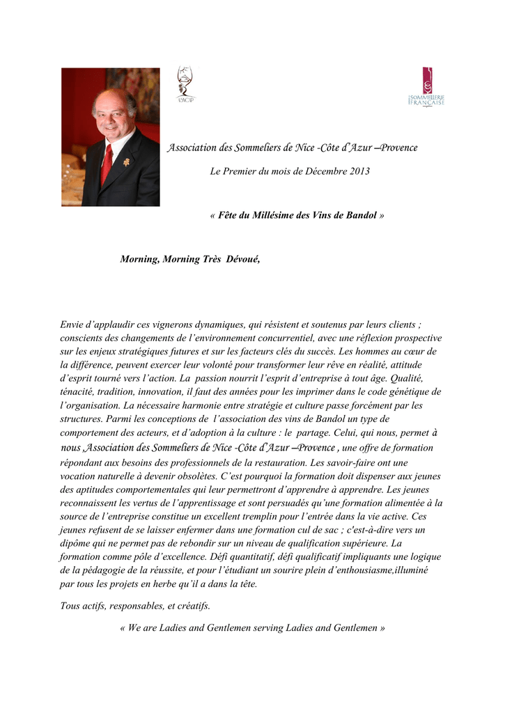 Association des Sommeliers de Nice -Côte d’Azur –Provence Le Premier du mois de Décembre 2013 « Fête du Millésime des Vins de Bandol » Morning, Morning Très Dévoué, Envie d’applaudir ces vignerons dynamiques, qui résistent et soutenus par leurs clients ; conscients des changements de l’environnement concurrentiel, avec une réflexion prospective sur les enjeux stratégiques futures et sur les facteurs clés du succès. Les hommes au cœur de la différence, peuvent exercer leur volonté pour transformer leur rêve en réalité, attitude d’esprit tourné vers l’action. La passion nourrit l’esprit d’entreprise à tout âge. Qualité, ténacité, tradition, innovation, il faut des années pour les imprimer dans le code génétique de l’organisation. La nécessaire harmonie entre stratégie et culture passe forcément par les structures. Parmi les conceptions de l’association des vins de Bandol un type de comportement des acteurs, et d’adoption à la culture : le partage. Celui, qui nous, permet à nous ,Association des Sommeliers de Nice -Côte d’Azur –Provence , une offre de formation répondant aux besoins des professionnels de la restauration. Les savoir-faire ont une vocation naturelle à devenir obsolètes. C’est pourquoi la formation doit dispenser aux jeunes des aptitudes comportementales qui leur permettront d’apprendre à apprendre. Les jeunes reconnaissent les vertus de l’apprentissage et sont persuadés qu’une formation alimentée à la source de l’entreprise constitue un excellent tremplin pour l’entrée dans la vie active. Ces jeunes refusent de se laisser enfermer dans une formation cul de sac ; c'est-à-dire vers un dipôme qui ne permet pas de rebondir sur un niveau de qualification supérieure. La formation comme pôle d’excellence. Défi quantitatif, défi qualificatif impliquants une logique de la pédagogie de la réussite, et pour l’étudiant un sourire plein d’enthousiasme,illuminé par tous les projets en herbe qu’il a dans la tête. Tous actifs, responsables, et créatifs. « We are Ladies and Gentlemen serving Ladies and Gentlemen » « Fête du Millésime des Vins de Bandol » Au lauréat du concours, suite à la dégustation des vins de garde : Domaine de Terrebrune. Servitude ou la liberté dans le bonheur, élan vital. créer de nouvelles forces et pourquoi pas, redonner une dynamique à la Table du Vigneron à Ollioules (restaurare : redonner des forces , reconstruire, rebâtir) tel est le nouveau challenge de Mr. Reynald Delille. La restauration c’est résonner par intuition dans le monde intérieur pour communiquer avec les autres : Singularité, caractère unique avec son plus » l’instant vécu » acquérir de nouvelles possibilités, redonner sens à sa vie ; « chaos constant par désir de nouveauté, perfectionnement constant » J.J.Rousseau. l’art et l’esthétique expression ultime de la créativité. Philosophie, tradition vigneronne, respect du naturel, chemin de la tourelle , on est aux aguets pour élaborer des vins de grande expression. Leurs couleurs : les seuls maîtres de la peinture sont les tableaux, de la ligne à la couleur, l’autorité du grenat dense, brillant, profond, triomphe ; au style, les vins aux parfums fugitifs,comme vibration liquide, donnant visibilité à l’espace, à la grâce, à l’apesanteur, au sensible ; Le goût du dépaysement :entre montagne et vue sur mer, la finesse de ses tanins, politique de pacificateur ; la bienveillance se laisse investir, comme un récit de vie à la première personne.l’abondance de la chair séduit. Dialogue avec le dégustateur « enfin seuls » semble dire le vin dans sa parade. Les hiers et les présents seront les demains heureux.( paysages marins, jours d’été).transformer le négatif dans la beauté. L’équilibre : une présence du passé , la réalité précède l’image. Appréciation générale : le voir entraine un savoir : j’ai vu donc je sais, belle manière de concevoir la relation au monde. Réalisation humaine. Aspect liquide à la J.S.Bach ne pas décrire mais évoquer, dans le ton qui s’élève, qui descend ; Au cœur du contentement du plaisir. « Fête du Millésime des Vins de Bandol » Parmi les dégustations lors de la fête du millésime des vins de Bandol : Domaine Cagueloup : Une rencontre à table puis au Domaine. De l’espace clos à l’espace infini ; sens, direction où l’on va dans la vie sous l’énergie solaire, sous un fond musical, pictural. Le sens de vie, se lever pour une étoile Cagueloup, s’oriente, vers l’astre comme Orion. Vertical au regard horizontal, Monsieur Richard Prébost nous montre comment l’homme doit se tenir, vivre c’est se déplacer. Le sentier est balisé comme le rang des vignes, vers un but, cheminé pour être heureux. Allumé d’une lumière en plein jour, il reste attaché à son soleil. La présence forte du passé ne montre pas que l’on soit réfractaire au changement lorsque l’on voit l’outil de vinification et les nouveaux foudres pour les vins de garde. Domaine dans une série de cycle, époque, ère, monde. Calendrier de l’existence se répétant comme les saisons, construire une base de sujet pour débuter l’année. Scénographie simple, dans la roussâtre tonalité aux accords ombres et lumières, des courbes et contres courbes, on devine la fécondité de la nature, luxuriante, végétale, dans cette composition très dessinée, on est dans la joie, le bonheur d’être, de vivre, un environnement de rêverie, avec une vision paisible, sereine, notre regard est posé attentif. Une seule réalité, tout se comprend à partir des lois de la nature, aspiration comme tous les vignerons et nous même. Le bonheur absolu, éternel, effort réfléchi, raisonné, de soi même. Collectif, la connaissance, la logique d’où le désir : cette essence de l’homme pour la joie que l’on ne voudrait pas contrarier par le désir des a